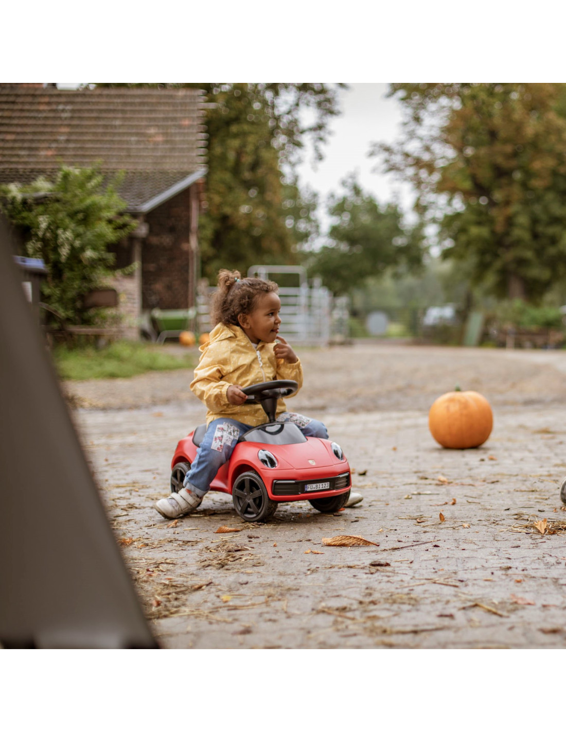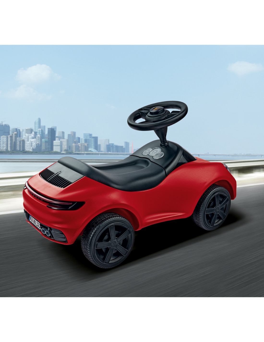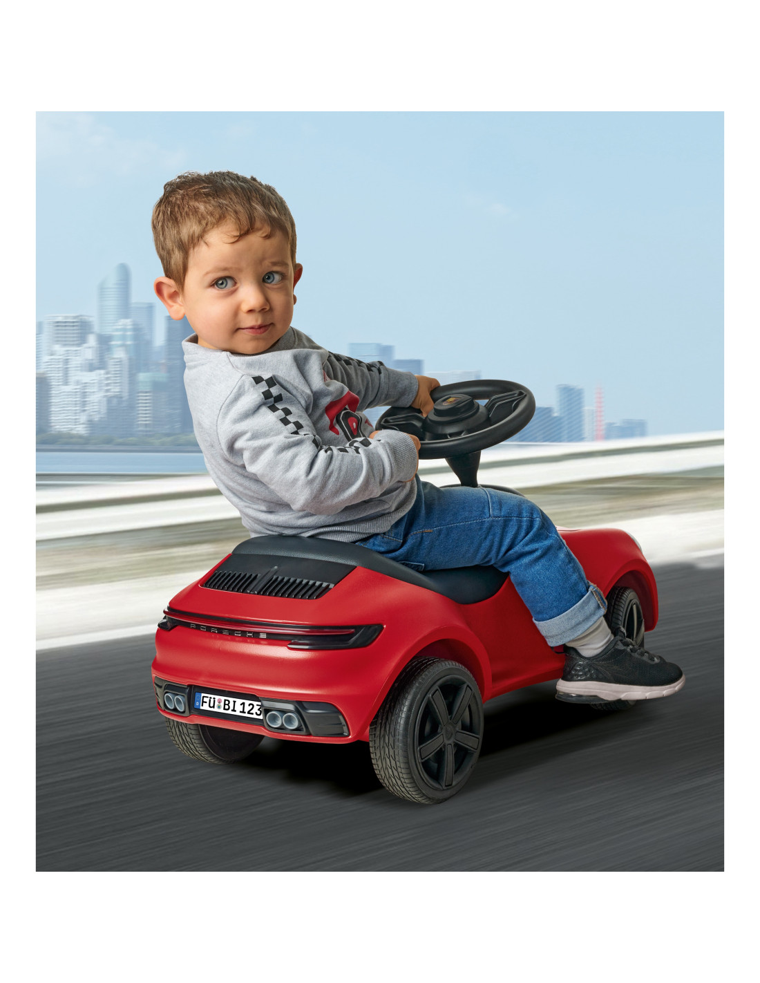 This beautiful Porsche 911 sports ride-on in classic red from the renowned BIG brand is the vehicle your child dreams of! Designed for toddlers who have already taken their first steps and are eager to embark on further journeys, it's built to help them develop their skills – mounting, dismounting, pushing, and steering. It features a steerable front axle for comfortable handling, quiet wheels , a low center of gravity, a steering wheel with a horn, and a removable, easy-to-clean foam seat .