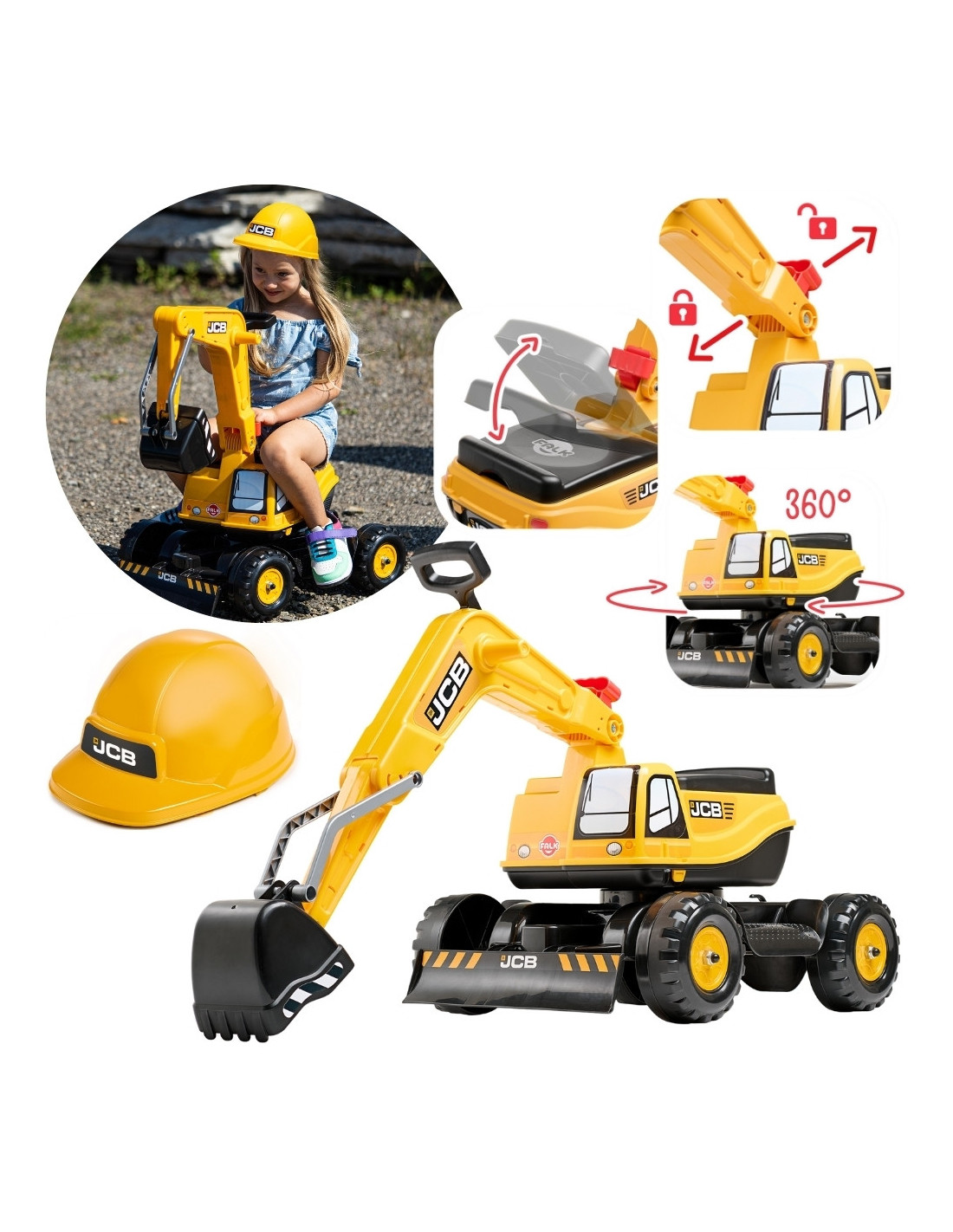 FALK JCB ride-on toys are incredibly reminiscent of authentic vehicles and machines, crafted with incredible precision and care to ensure every detail is faithfully reproduced. Elements can be combined and added to, creating a wonderful collection that will delight young users! The FALK JCB excavator boasts a very solid construction and high-quality, durable materials. This toy is highly maneuverable and easy to operate, making it perfect for the garden or the beach. Under the seat, there's a hidden compartment for your little ones to store their valuables. Additionally, the ride-on excavator set includes a yellow helmet.