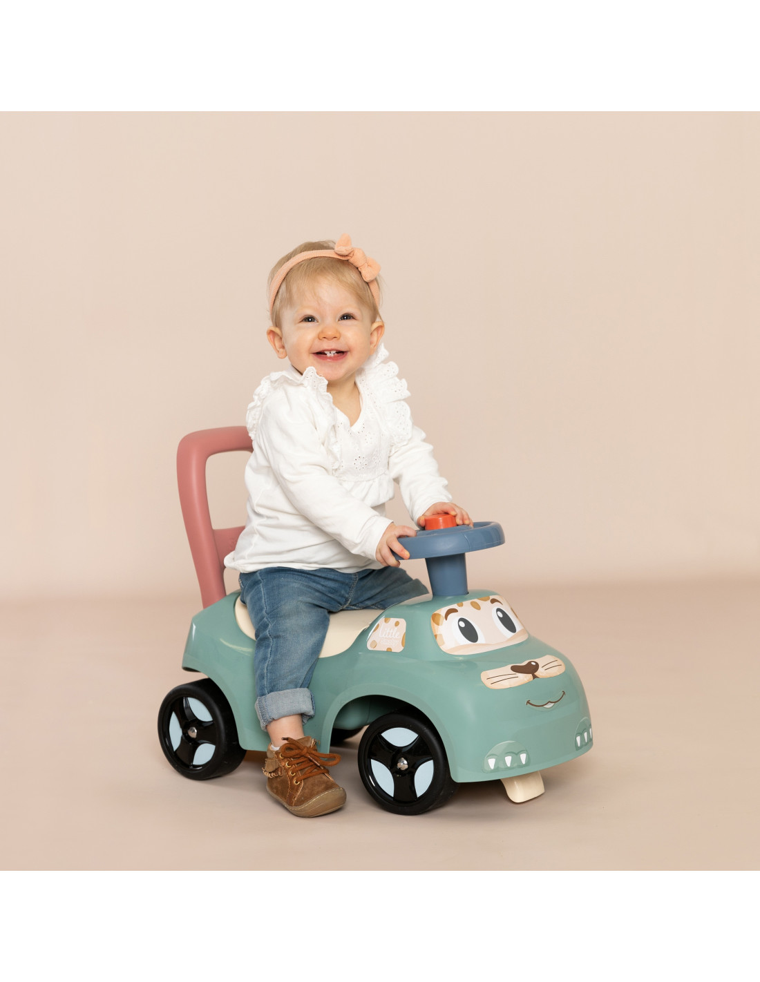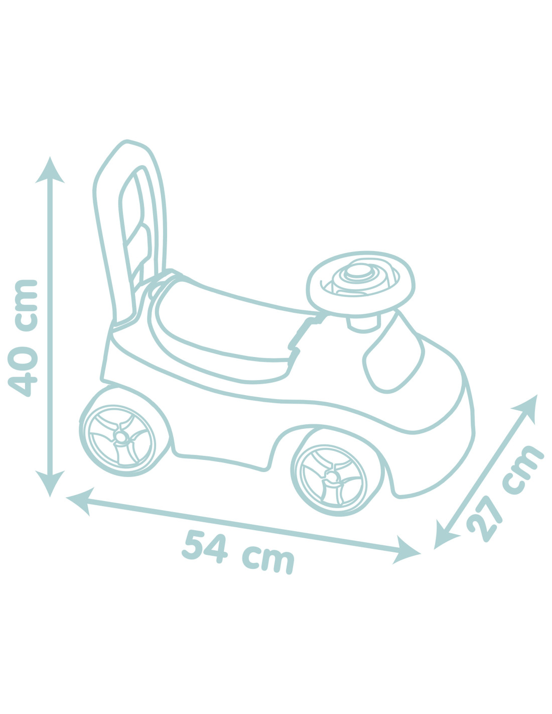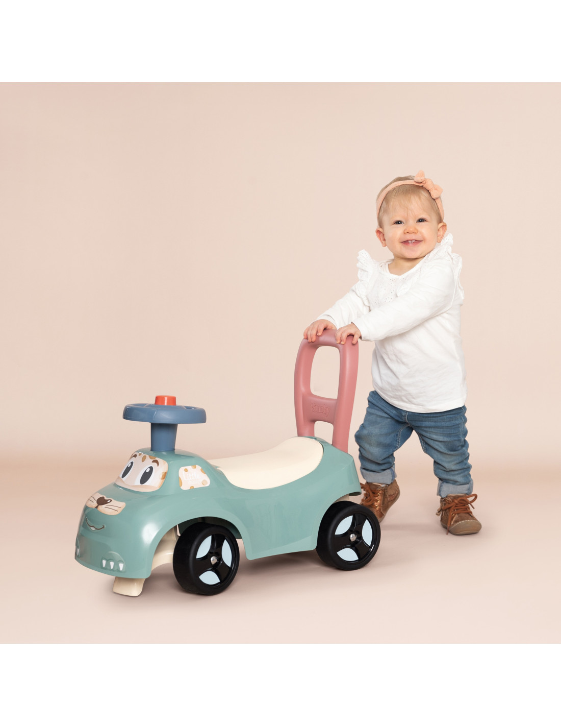 The ride-on has an additional pusher function . These functions are crucial for a toddler's physical development and motor coordination . The ride-on is ideal for learning to walk . It's also perfect as a fun toy car, allowing the child to move freely using their feet. It's perfect for both indoor and outdoor use.