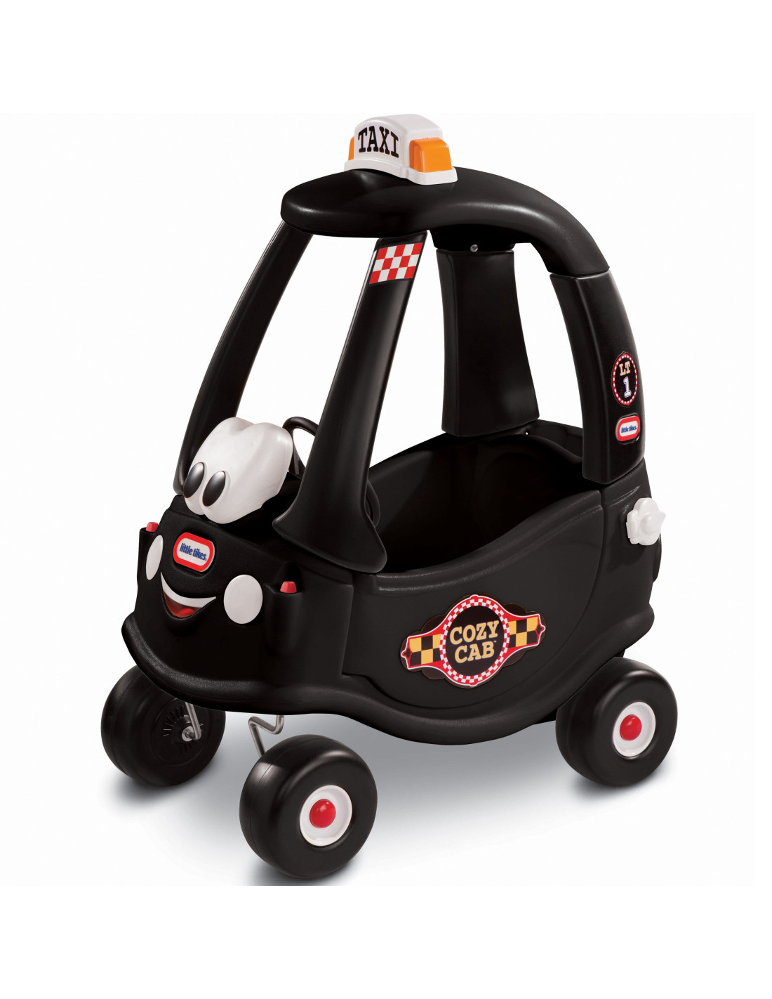 The black Cozy Coupe Taxi ride-on is equipped with a steering wheel with a horn. Its low center of gravity allows for safe and confident learning. Additionally, the front wheels swivel 360 degrees for more comfortable steering and turning.