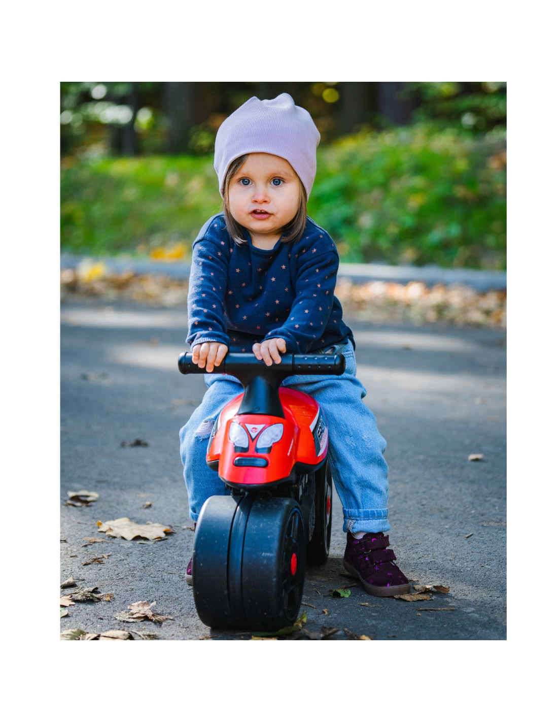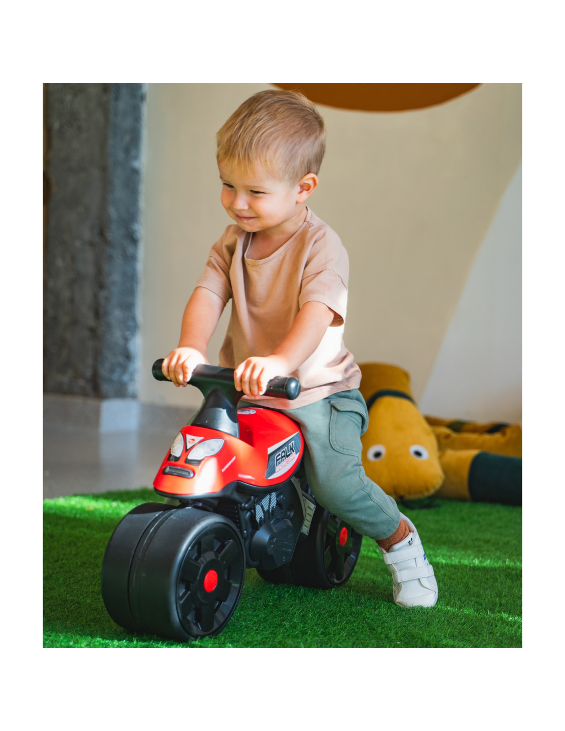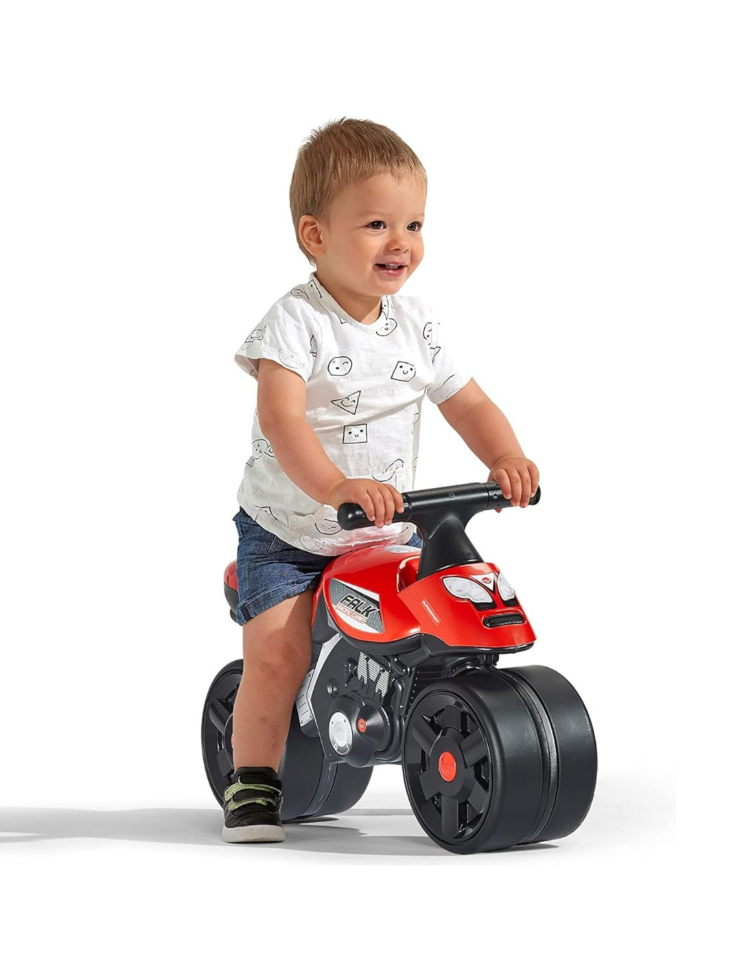 The Running Motor from the French ride-on toy manufacturer Falk is the perfect gift for children aged 2 and up . Beautiful graphics and a very realistic look will bring a lot of joy to little ones. The ride-on is equipped with large wheels that perform well on a variety of surfaces . The front wheel swivels for easier steering and turning.