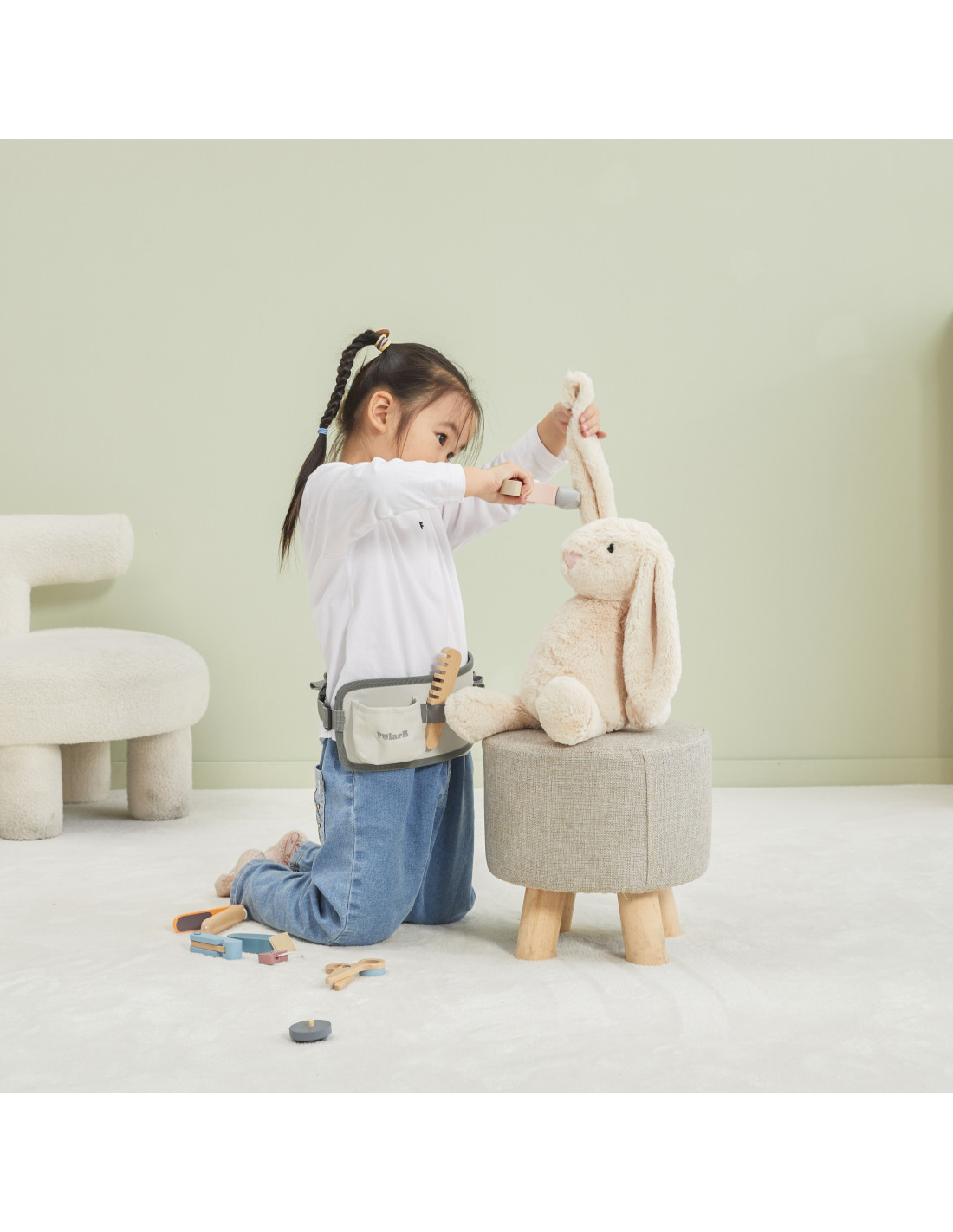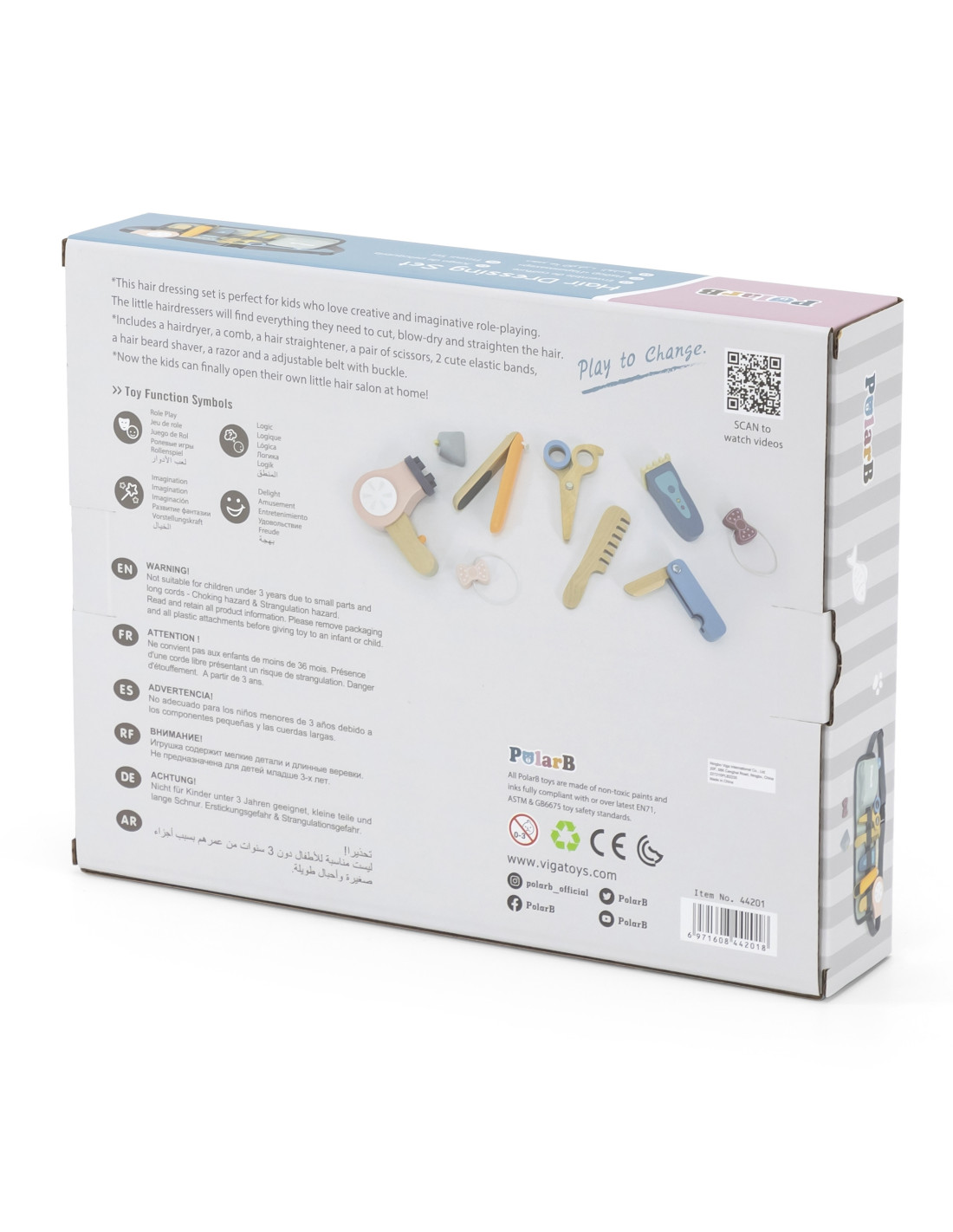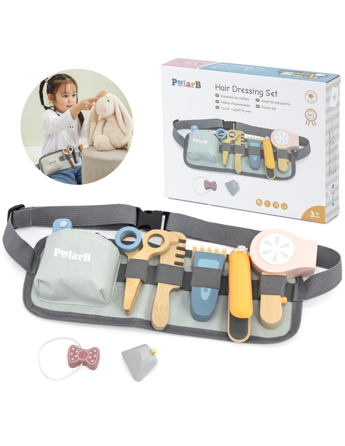 This hairdressing set from VIGA is perfect for kids who love to unleash their creativity and imagination through various role-playing games. Little hairdressers will find everything they need for fun cutting, drying, and straightening hair . It includes a hairdryer, comb, straightener, scissors, two cute elastic hair bands, a clipper, a razor, and an adjustable belt so kids can carry the entire set and keep it close at hand. The toys are made of child- safe wood and non-toxic paints .
