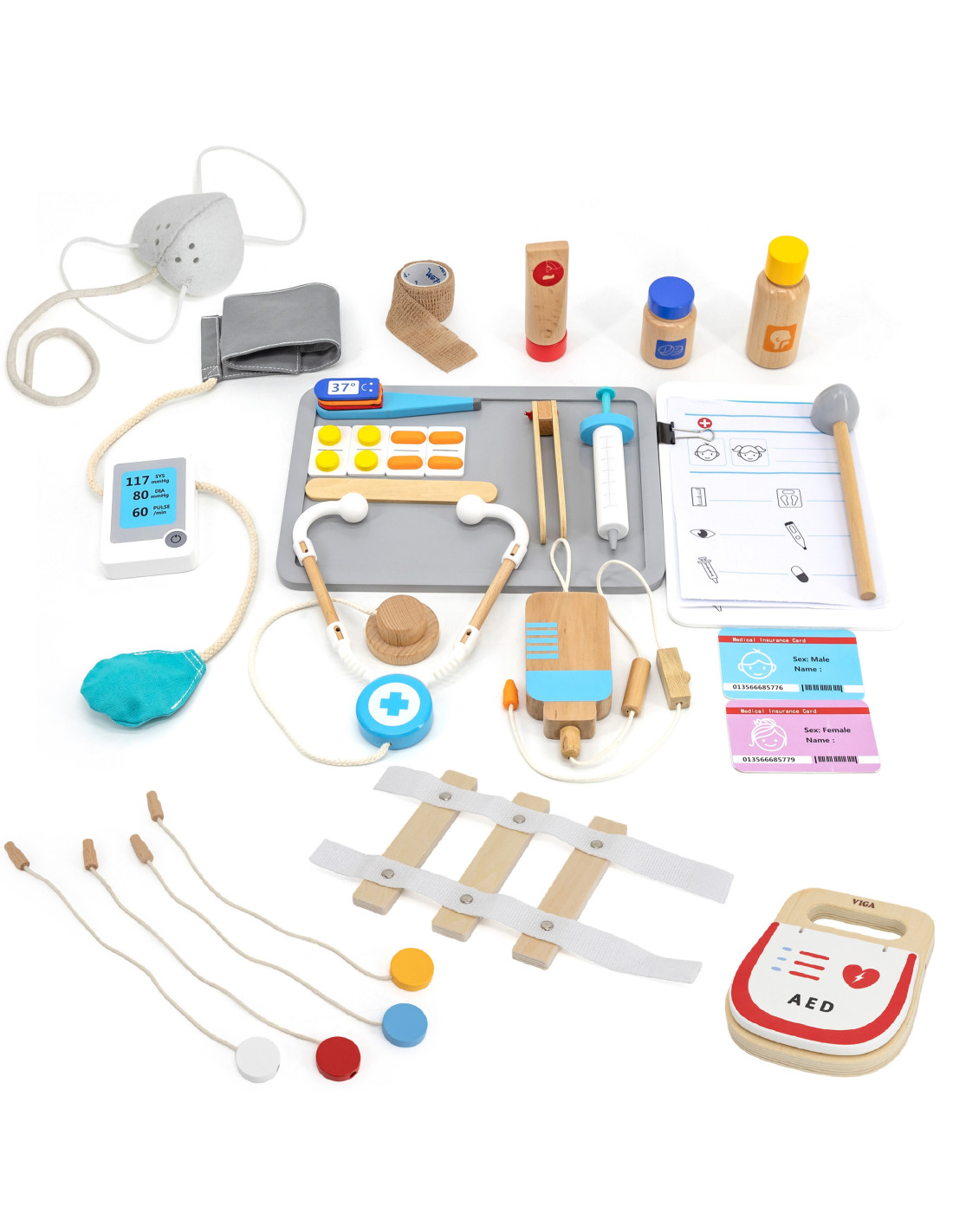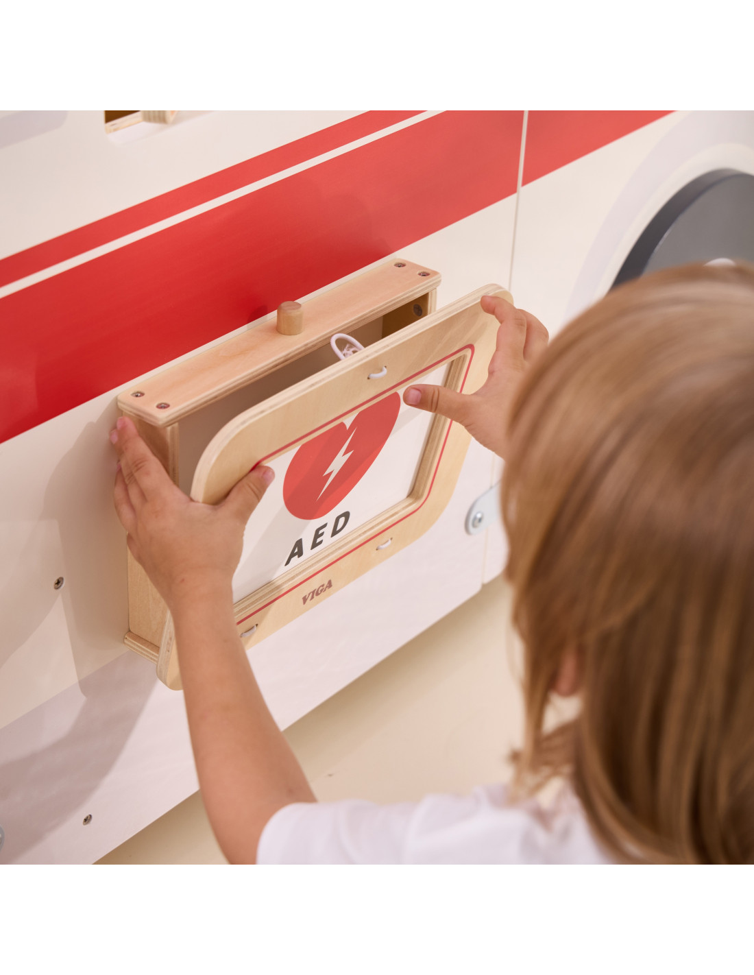 The Super Ambulance from VIGA is an interactive and educational set that transports children to the world of emergency medical services. Children can take on various roles, such as an ambulance driver , paramedic, or dispatcher , while learning the basics of first aid . The set includes numerous accessories, such as a stretcher cart , a wooden telephone , a stethoscope , and other tools, that make playtime realistic. Children can learn how to dress wounds or take temperatures , all while stimulating imagination and encouraging caring play . The set includes 25 different accessories , providing countless opportunities for creative play.