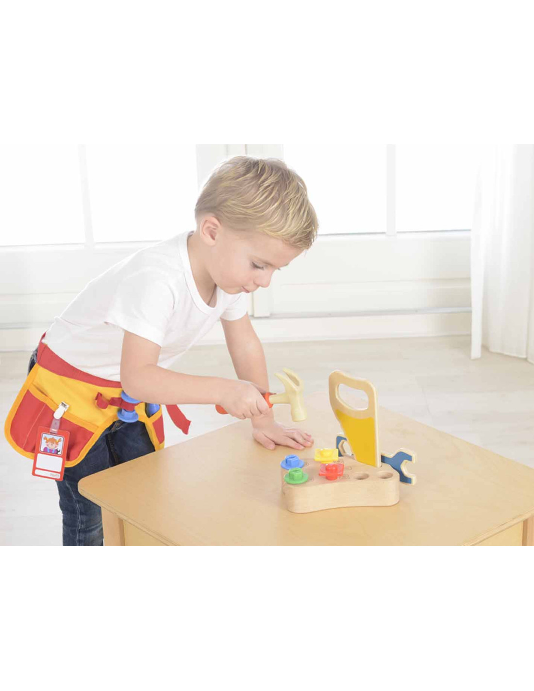 A fabric belt and a set of 12 carpentry tools. This set allows for all types of carpentry work and also includes a worker's badge, on which the child can write their name and attach a photo. Your little one will feel like a true professional, capable of repairing any problem!