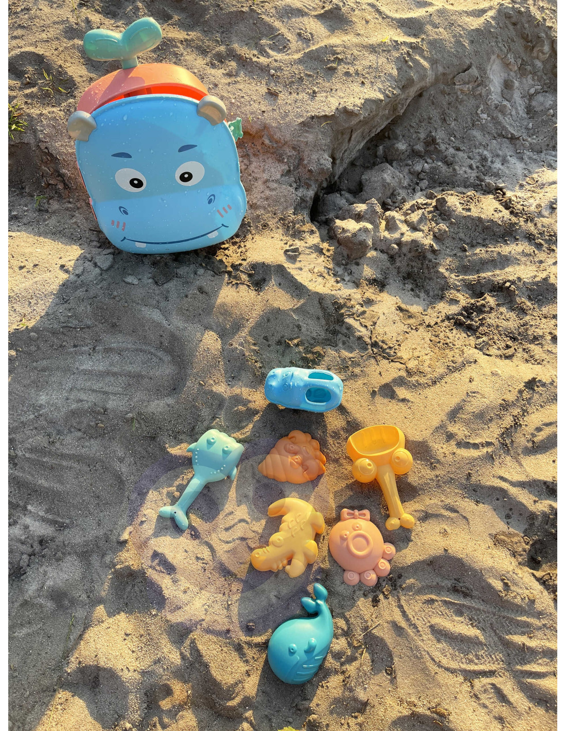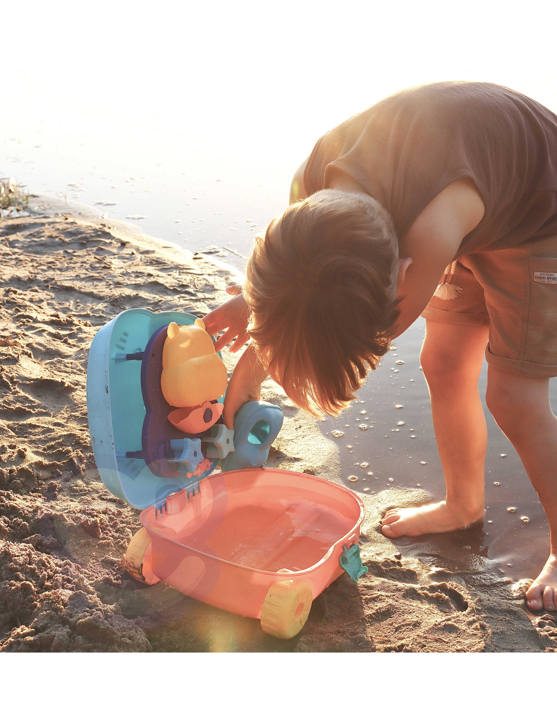 The WOOPIE sand and water play set will meet all your needs for travel, sandbox play, and beach play! This 3-in-1 set comes in a suitcase , complete with sand accessories and a water toy . Simply lay the suitcase on its back, fill the bottom with water, and use the cup to pour water over your head and watch the water drip. This type of play develops your child's senses and focuses their attention . The accessories allow for complete sand play, even with two people ! This toy meets all your outdoor play needs!