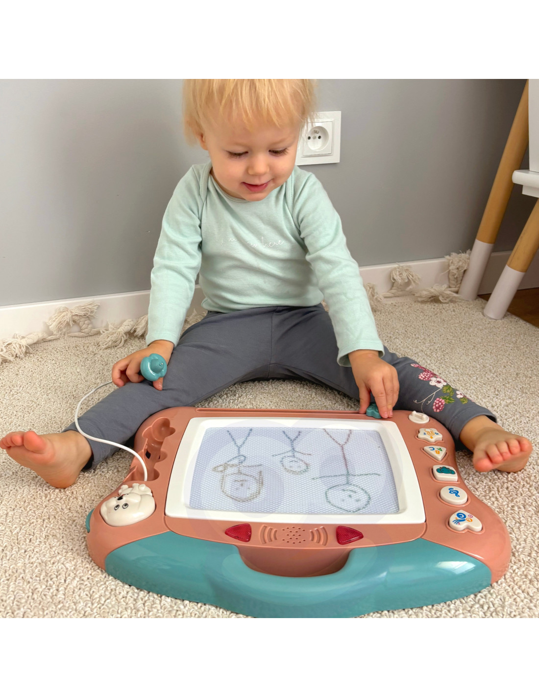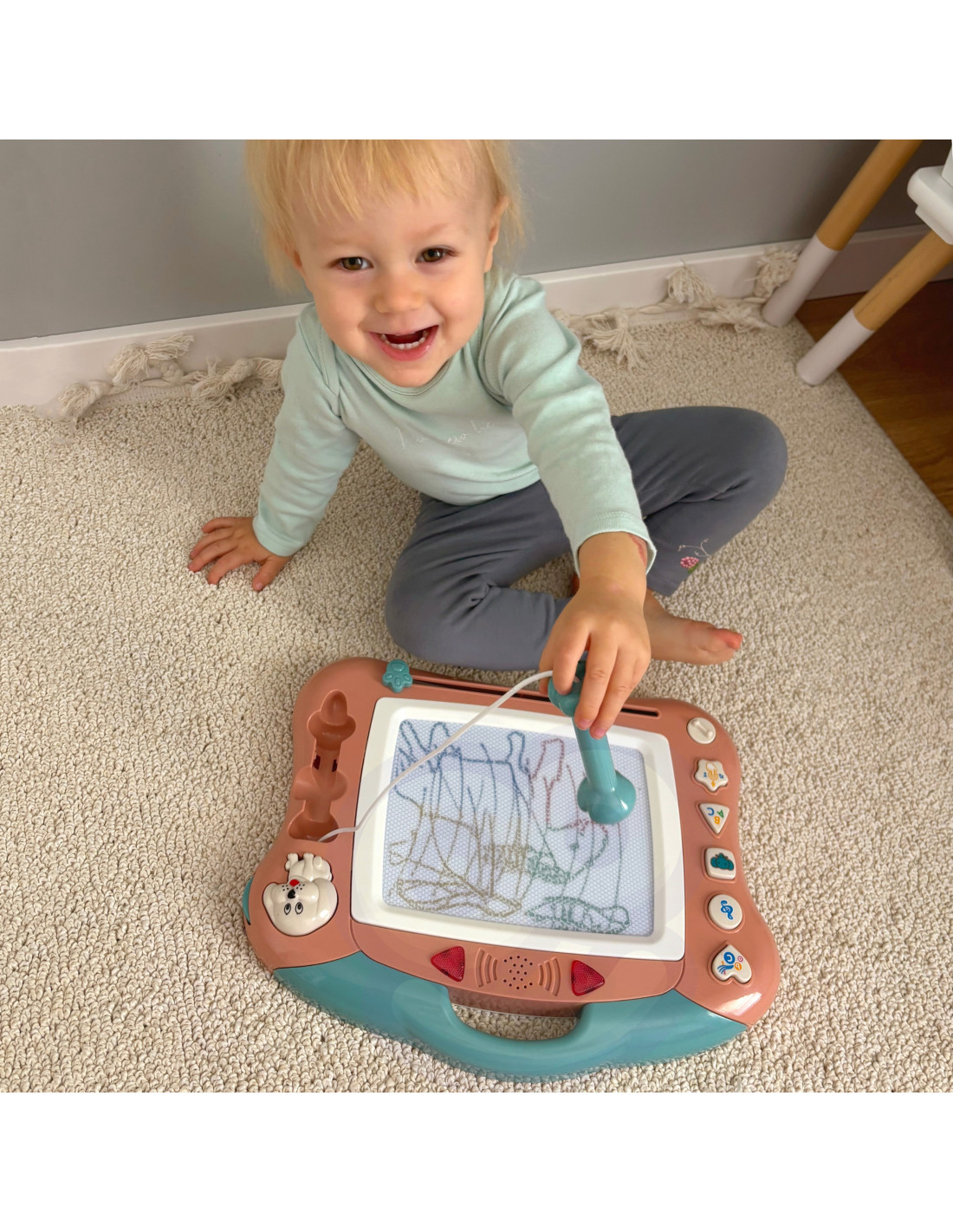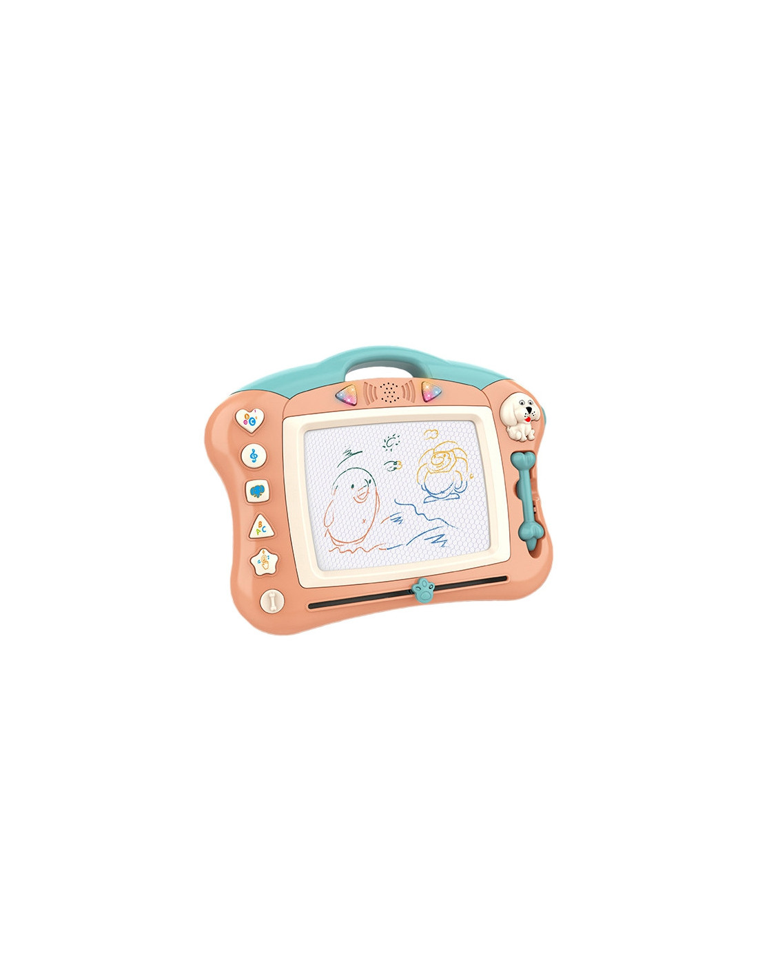 The Magnetic Writing Board from WOOPIE offers hours of creative play! The board encourages writing and drawing . Drawing will help your child concentrate , calm down, and relax . The writing board allows you to create an endless number of pictures – just slide the special slider, and the drawing will disappear, allowing you to draw again! The set also includes a convenient magic pen . It also has 5 multi-function buttons: songs, melodies, animals, letters, and conversions . When it makes sounds, the board lights up, catching your child's eye. The board has a convenient handle , so your child can take it anywhere, and the legs can be extended , making writing at the table easier. The writing board will develop your child's manual dexterity , imagination , and creativity , and will give them the opportunity to develop their artistic side !