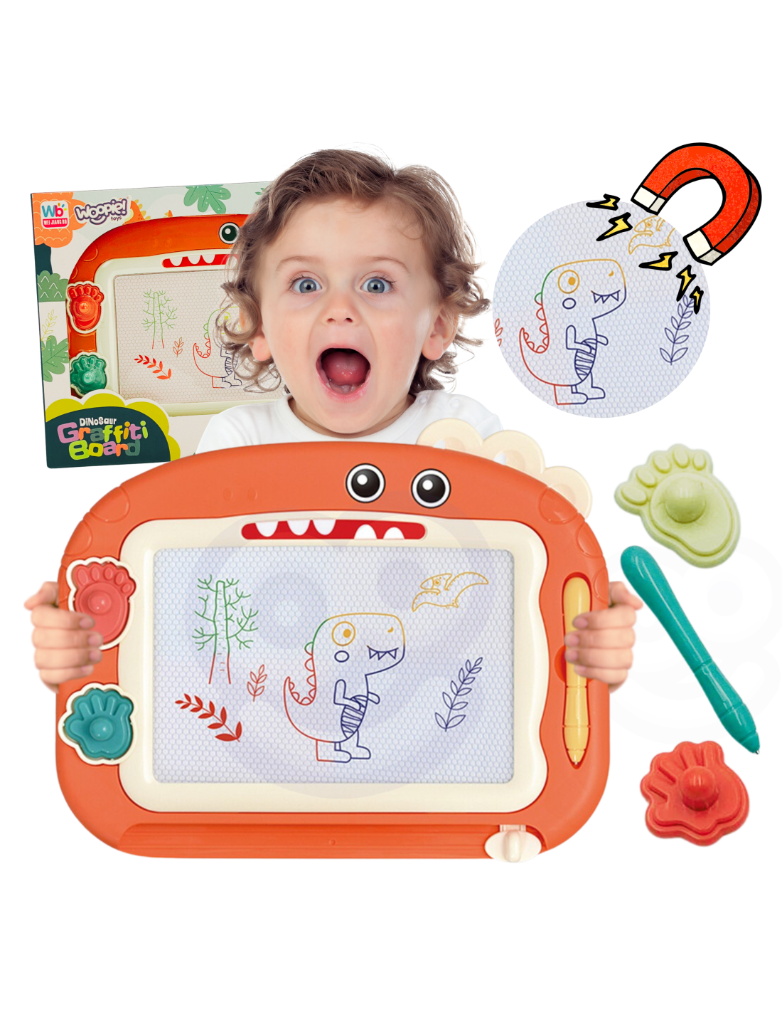 The Magnetic Writing Board offers hours of creative play! The board encourages writing and drawing . Drawing will help your child concentrate , calm down , and relax . The writing board allows you to create an endless number of pictures – simply slide the special slider, and the drawing will disappear, allowing you to draw again! The set also includes a convenient magic pen and two stamps to enhance your creations. The board has a convenient handle , so your child can take it anywhere. The writing board will develop your child's manual dexterity , imagination , and creativity , and will give them the opportunity to develop their artistic side !