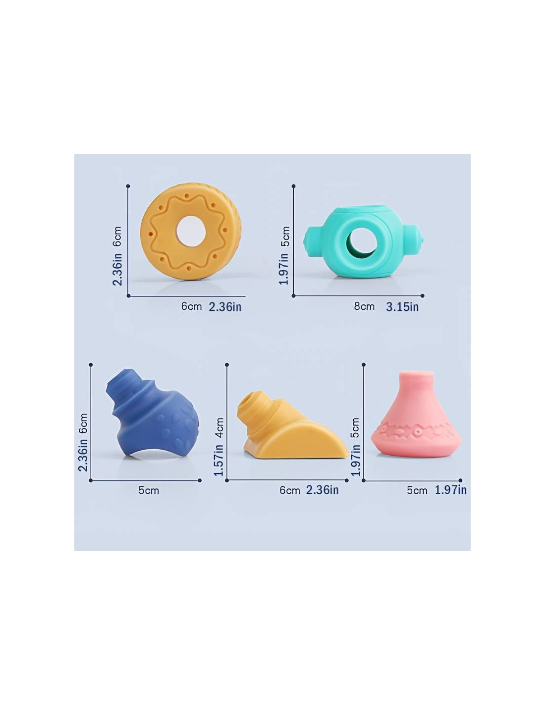 WOOPIE Sensory Blocks Puzzle will captivate every toddler. With their interesting shapes, colors, and the ability to make sounds by squeezing, they perfectly stimulate the development of a child's visual-auditory coordination, fine motor skills , and sense of touch. The blocks feature convex shapes with textures/patterns and geometric shapes . Additionally, the blocks can be combined to create various structures, such as a race car . The blocks are soft and pleasant to the touch. Thanks to their structure, they also work perfectly as a teether . This product, with its beautiful, subdued colors, is suitable for children from 6 months of age.