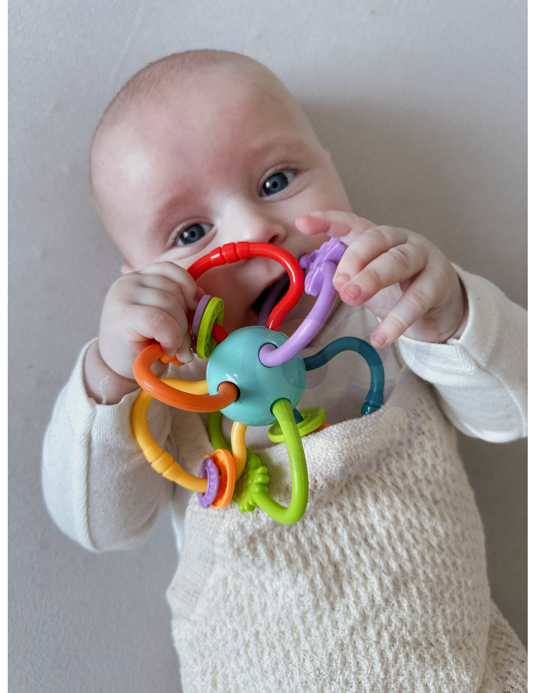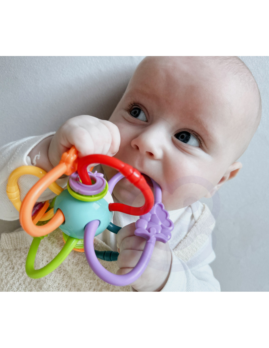 This sensory toy from the Woopie brand is perfect for a little teething baby. It consists of soft, colorful tubes that attract baby's attention. The lightweight design makes it easy for little ones to hold. It's designed to be child- safe , with no sharp edges, and features soft elements that can be used as a teether . Playing with it stimulates the development of tactile, visual, and auditory senses . It includes a rattle that can attract attention. The colorful elements can be moved around on the flexible swirls. The toy can be stored in the refrigerator to provide better relief for sore teething gums.