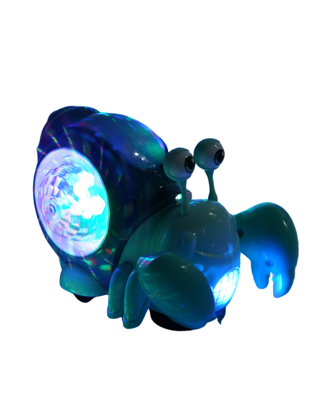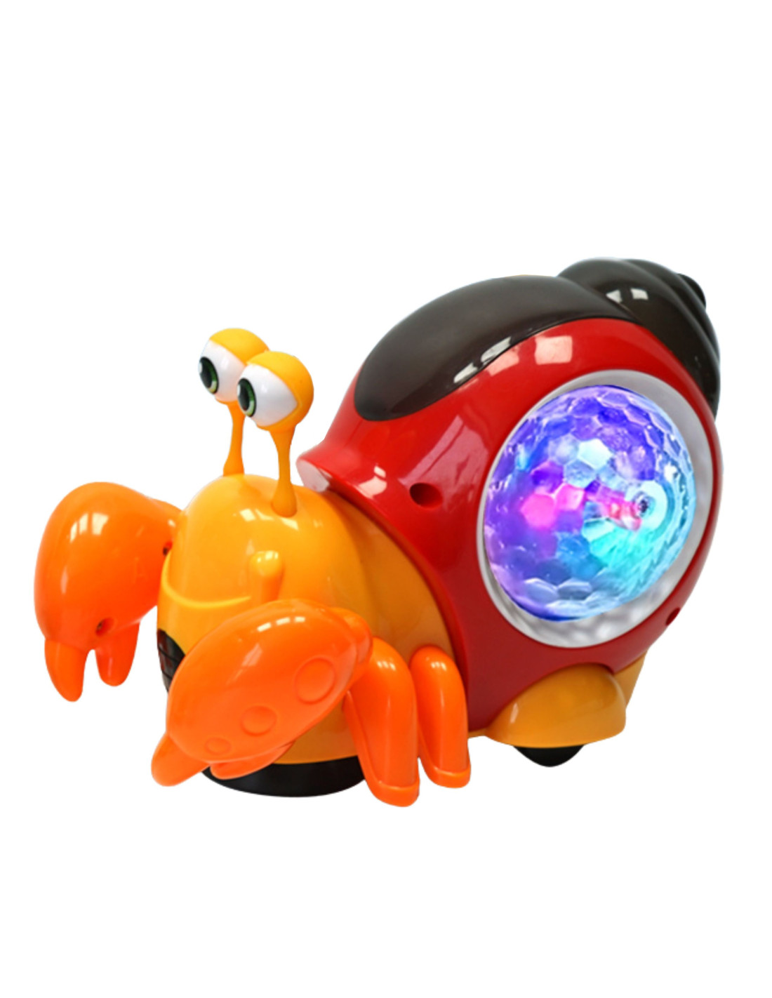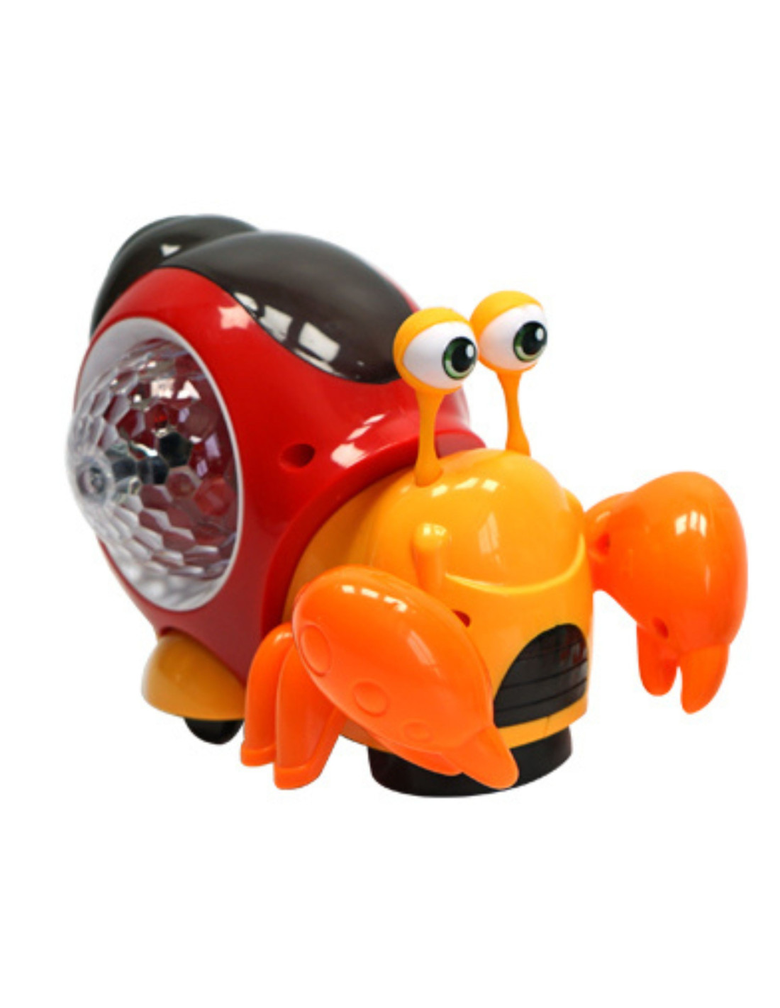 - After removing the bottom cover from the crab 's wheels, it begins to roll . When the toy encounters an obstacle, it begins to crawl in a different direction . The entire experience is accompanied by cheerful music and colorful lights from the crab's shell.