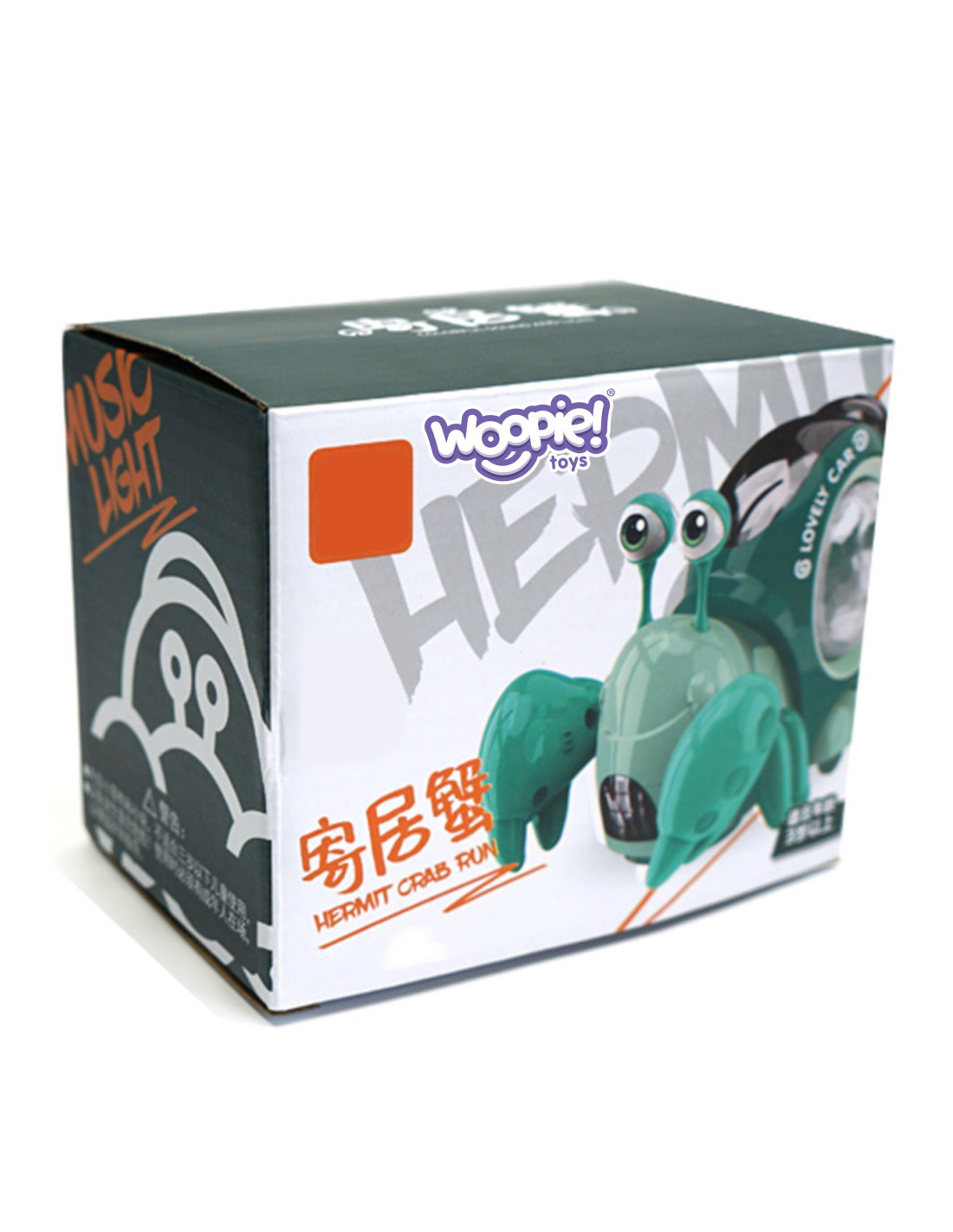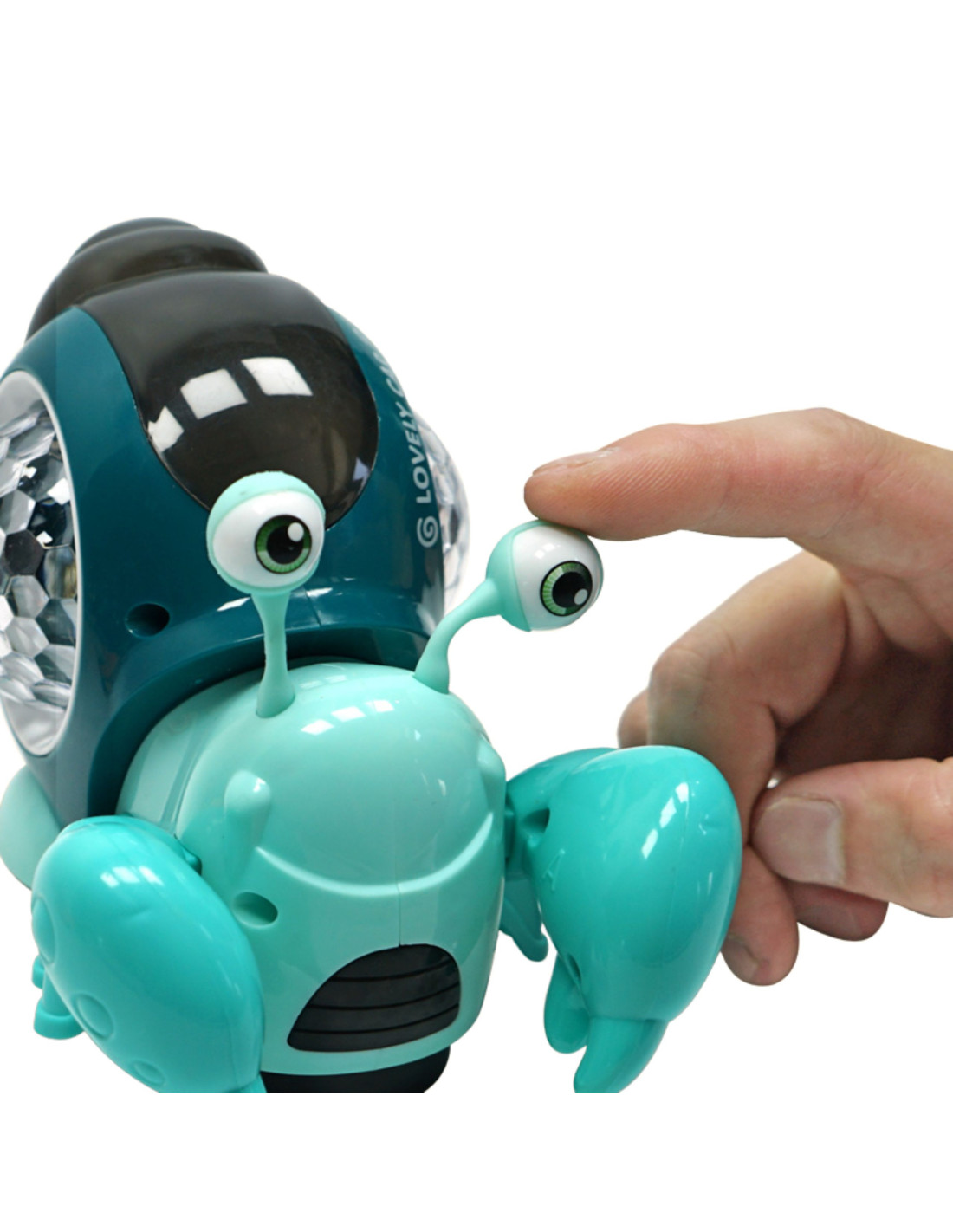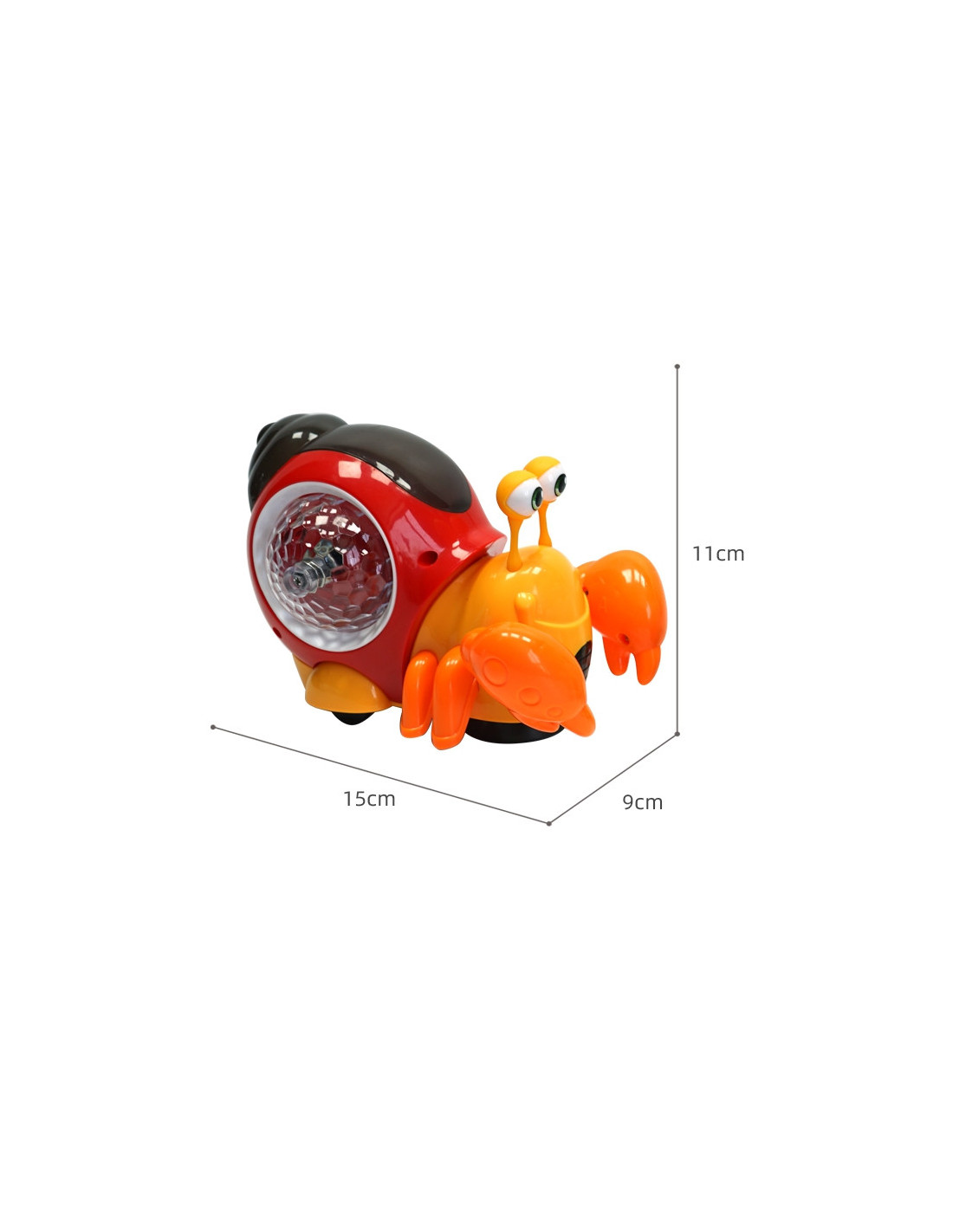 - After removing the bottom cover from the crab 's wheels, it begins to roll . When the toy encounters an obstacle, it begins to crawl in a different direction . The entire experience is accompanied by cheerful music and colorful lights from the crab's shell.
