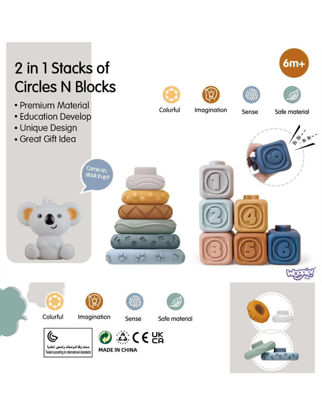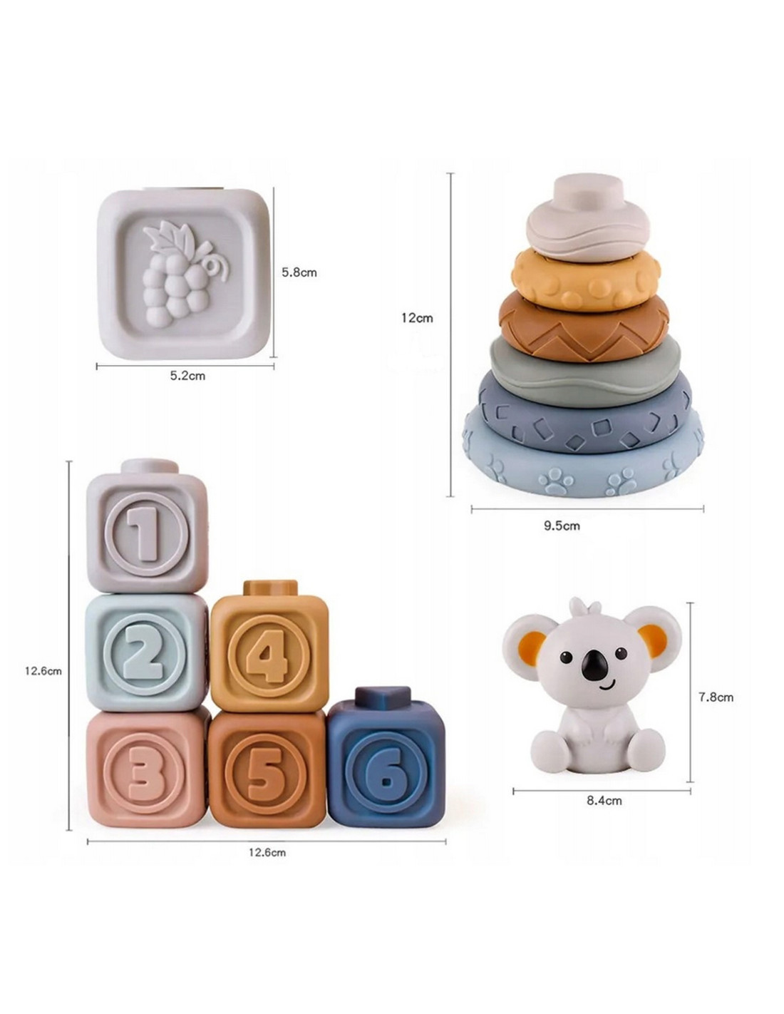 This charming educational set from WOOPIE is the perfect choice for a safe and developing gift for any toddler. Made of flexible, non-toxic material, this toy can also be used as a teether, providing relief during teething. The set consists of a pyramid and blocks that offer a wide range of educational and sensory possibilities. The pyramid, composed of six circles of various sizes, topped with an adorable koala figure, and six blocks with raised numbers create a versatile toy that stimulates child's development on many levels.