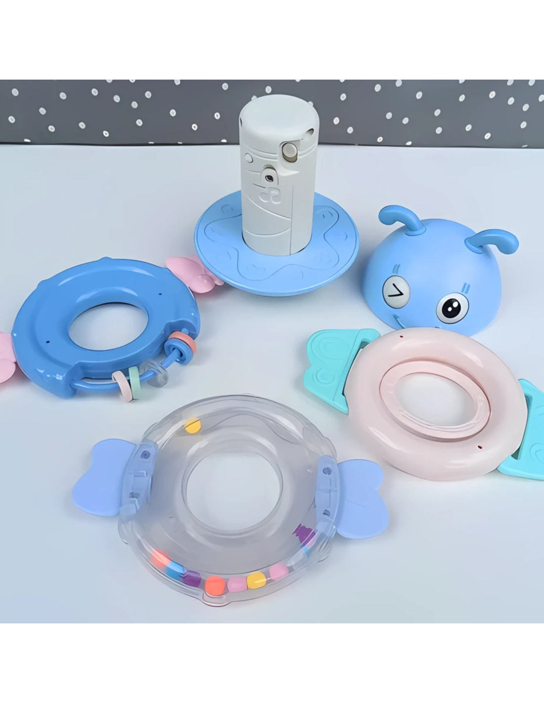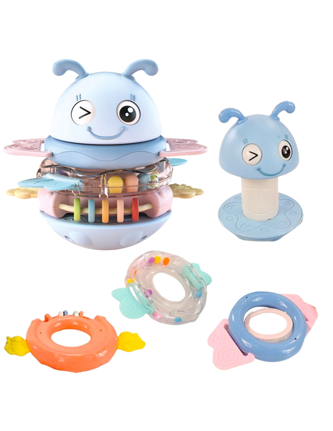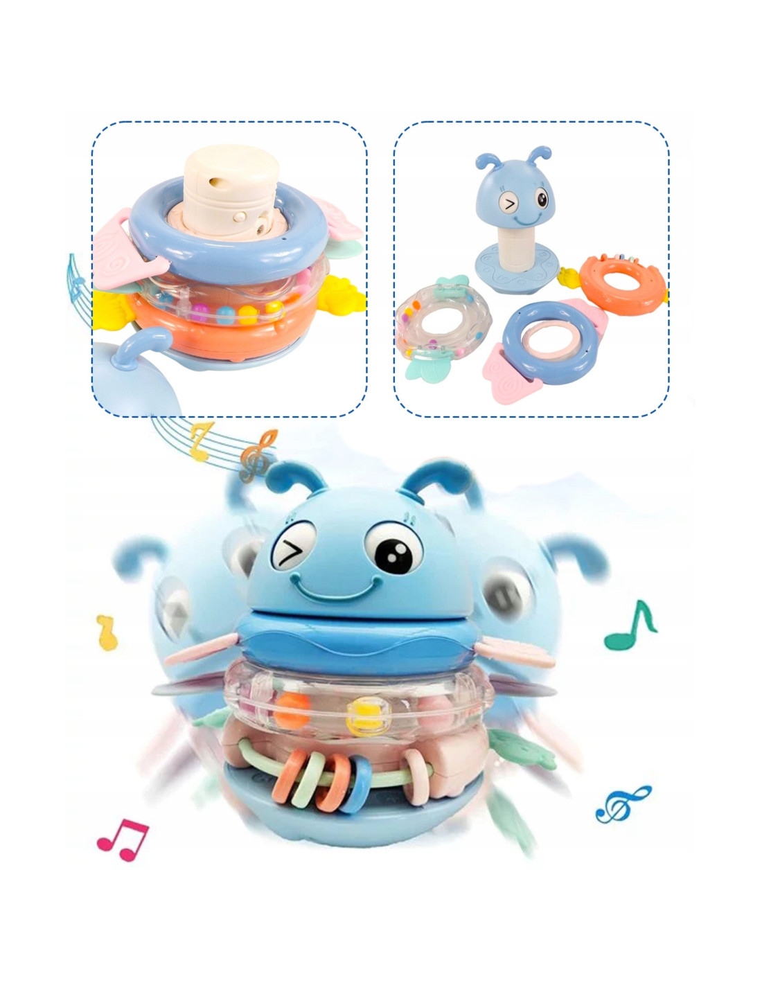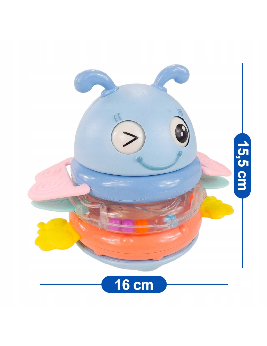 The Woopie 2-in-1 Blue Bee Tumbler is a multi-tasking sensory toy that delights with both its functionality and appearance! Combining rattles and teethers with sound effects, it provides your little one with versatile play and supports their development from the first months of life. Three colorful rings, which function as both rattles and teethers , can be attached to a special peg, which, depending on the selected mode, will play a song or make a fun sound. The charming bee's head with movable eyes completes the look, creating an attractive form that catches baby's eye. This toy was designed with the youngest children in mind. The delicate silicone protrusions on the rings are ideal as teething toys , while the safe, rounded shapes allow for easy grasping and manipulation. All the elements are colorful, varied in texture, and appropriately sized, stimulating your child's senses, curiosity, and motor skills . Thanks to its rounded base, the toy rocks gently with movement, and it's not easy to tip it over! It's not just a toy, but a companion for everyday learning and development .
