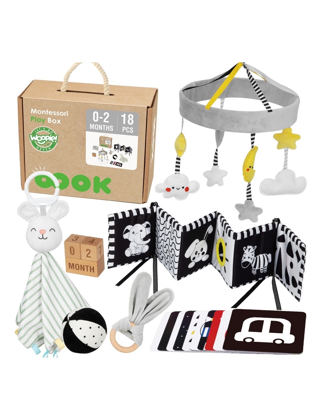 Discover the unique Educational Box from WOOPIE GREEN!, created for the youngest babies aged 0-2 months . This set of 6 carefully selected sensory and educational toys supports your child's development from the first days of life. Each item is designed in the spirit of the Montessori method to stimulate the senses of sight, touch, and hearing, while developing logical thinking and hand-eye coordination. The box also includes a parenting guide, which will show you when and how to introduce each toy. It's the perfect gift for newborns and new mothers, combining learning, fun, and development in one!