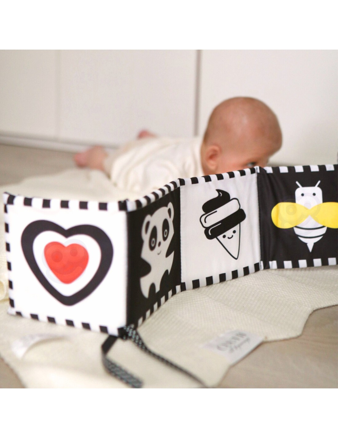 - - A soft, contrasting book with sound effects – develops sight, hearing and motor skills, encouraging play.