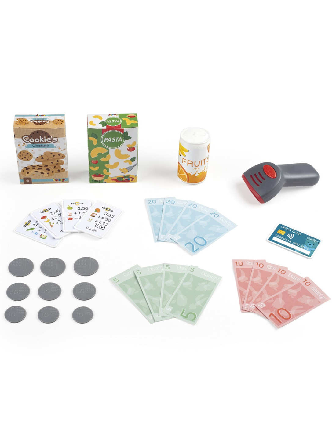 Kasa sklepowa z akcesoriami od Smoby to idealna propozycja zabawy dla dzieci. Dzieci mogą zważyć produkty, a następnie nabić je na kasę. Przy pomocy czytnika zeskanują ciasteczka czy makaron. Następnie kupujący może zapłacić pieniążkami lub kartą płatniczą.