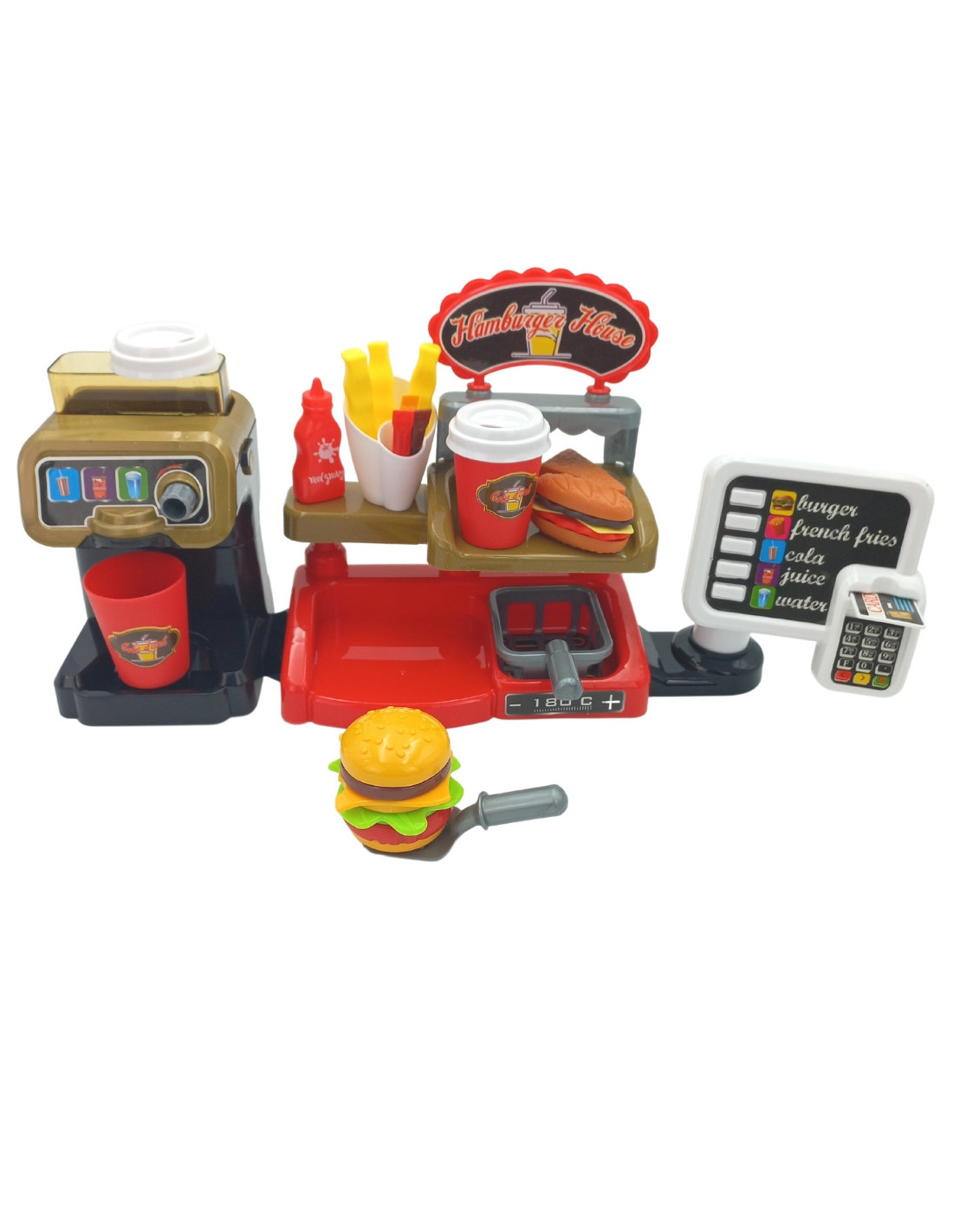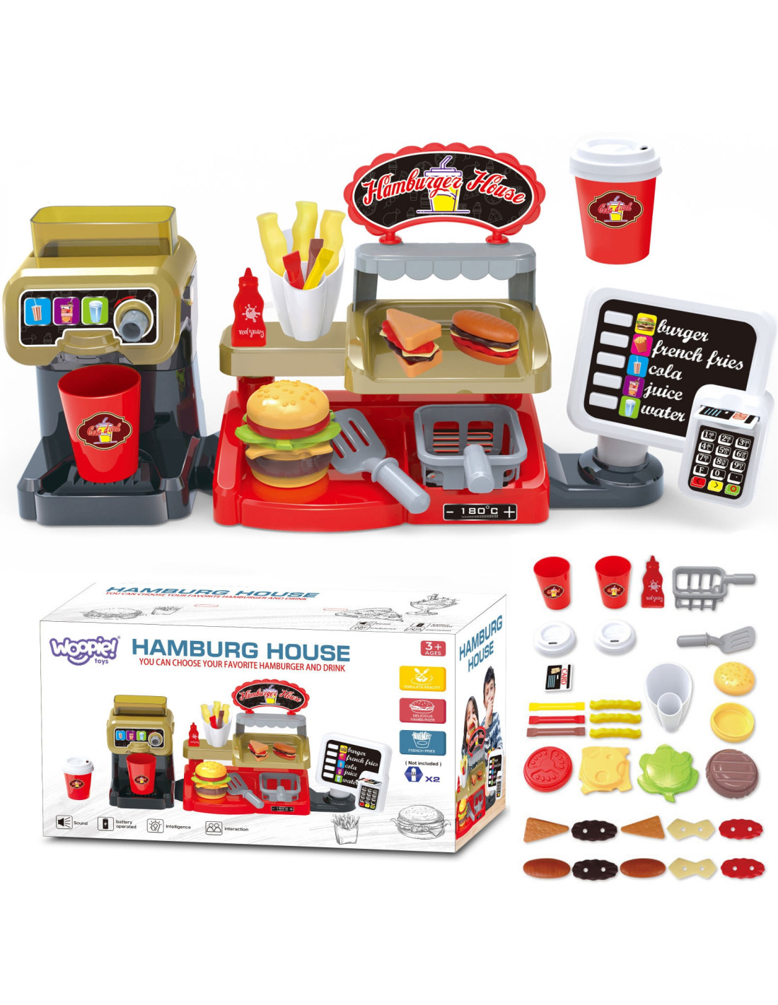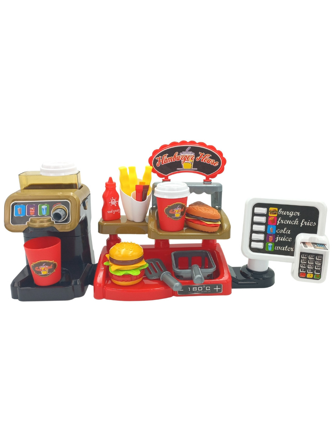 The Fast Food XXL with a cash register and dispenser from WOOPIE will unleash your child's imagination. Children can role-play with friends while playing salesperson and customer. Children can offer fries, which they can fry themselves ; a cup of soda, which they can pour themselves ; a burger, toast, and a sandwich. Burgers and sandwiches can be arranged in any way they like. Real water can be poured into the dispenser. To do this, simply place a cup under the dispenser, turn the knob, and pour real water—a feature sure to delight children! Customers can pay with a toy credit card , which makes a sound when validated. The cash register also features a special sound function , and by pressing the appropriate button, they can hear menu items such as "hamburger," "French fries," "cola," "juice," and "water." This complete interactive set allows children to become real salespeople, developing their imagination and creativity . Many hours of fun with friends are guaranteed!
