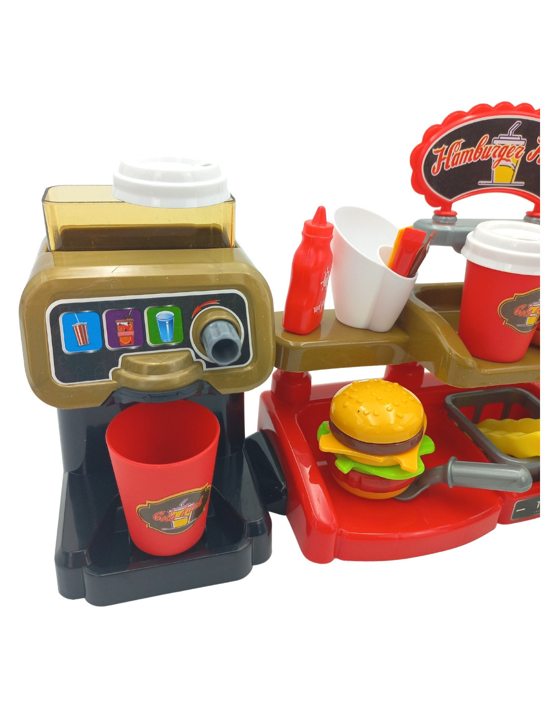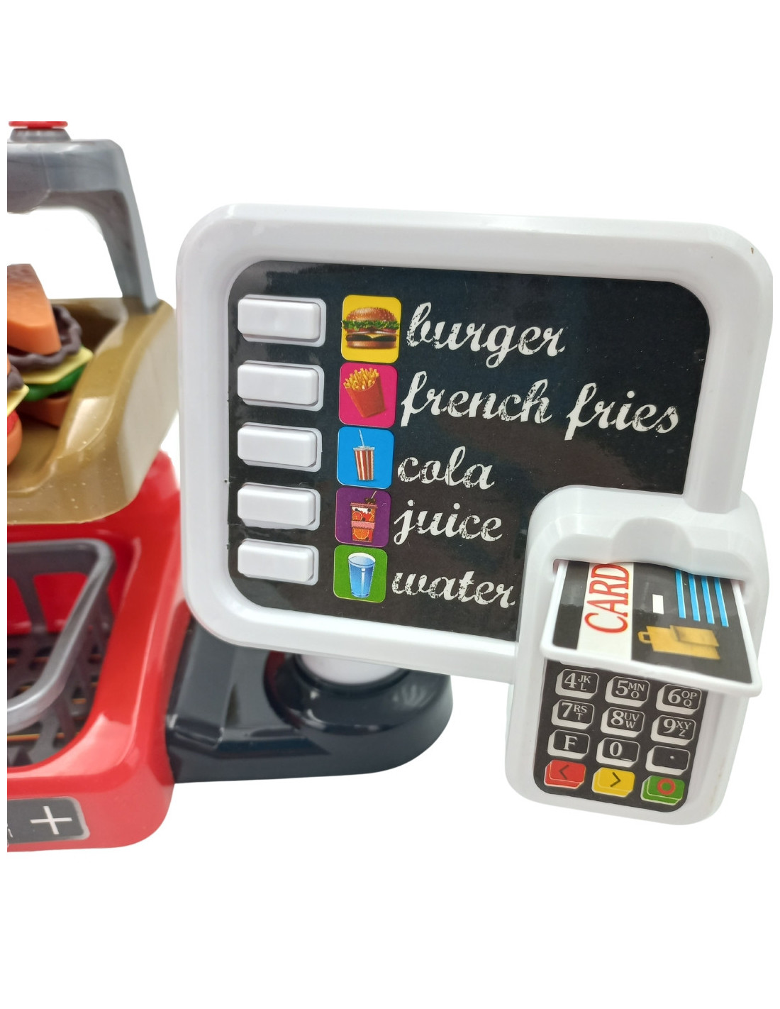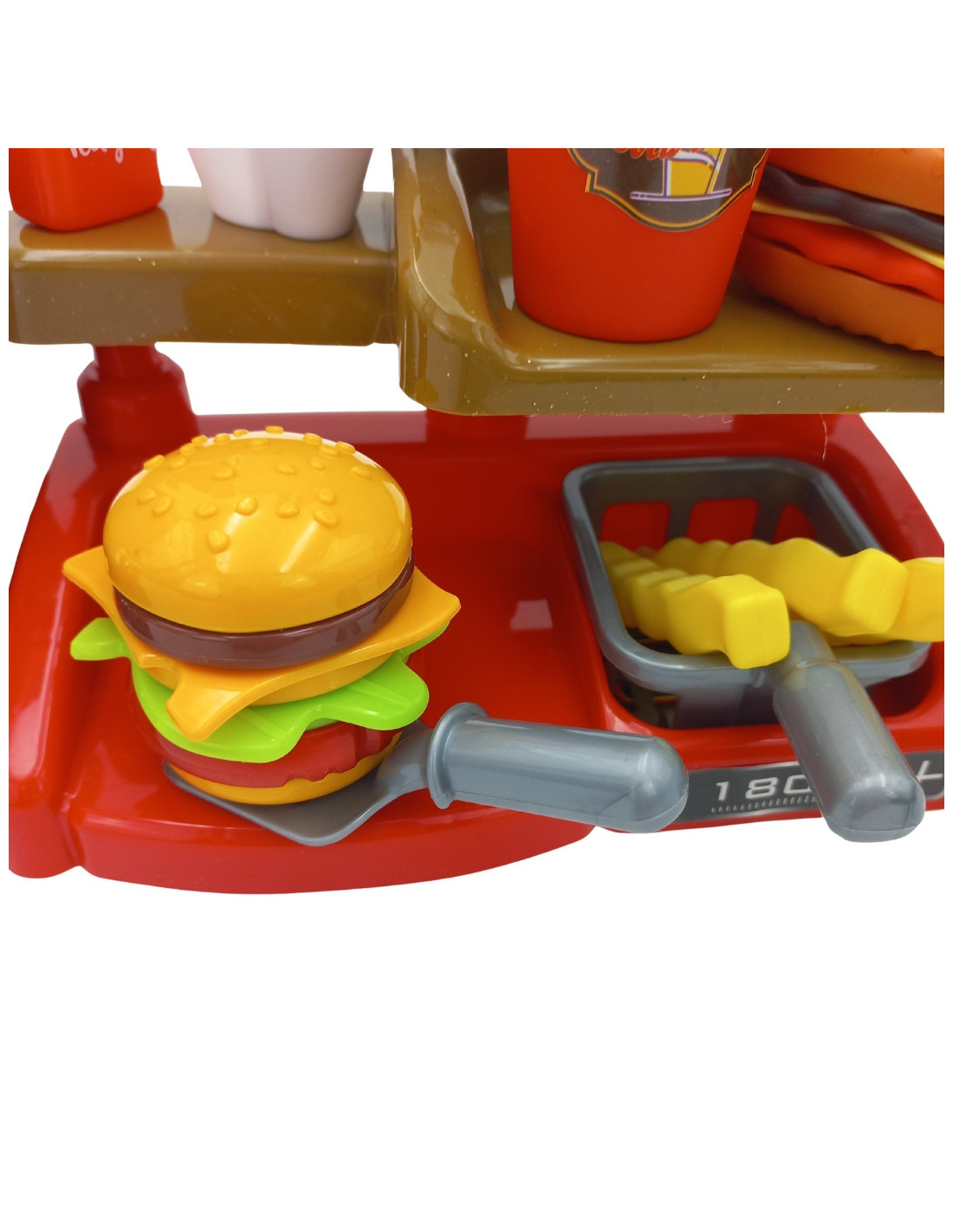 The Fast Food XXL with a cash register and dispenser from WOOPIE will unleash your child's imagination. Children can role-play with friends while playing salesperson and customer. Children can offer fries, which they can fry themselves ; a cup of soda, which they can pour themselves ; a burger, toast, and a sandwich. Burgers and sandwiches can be arranged in any way they like. Real water can be poured into the dispenser. To do this, simply place a cup under the dispenser, turn the knob, and pour real water—a feature sure to delight children! Customers can pay with a toy credit card , which makes a sound when validated. The cash register also features a special sound function , and by pressing the appropriate button, they can hear menu items such as "hamburger," "French fries," "cola," "juice," and "water." This complete interactive set allows children to become real salespeople, developing their imagination and creativity . Many hours of fun with friends are guaranteed!