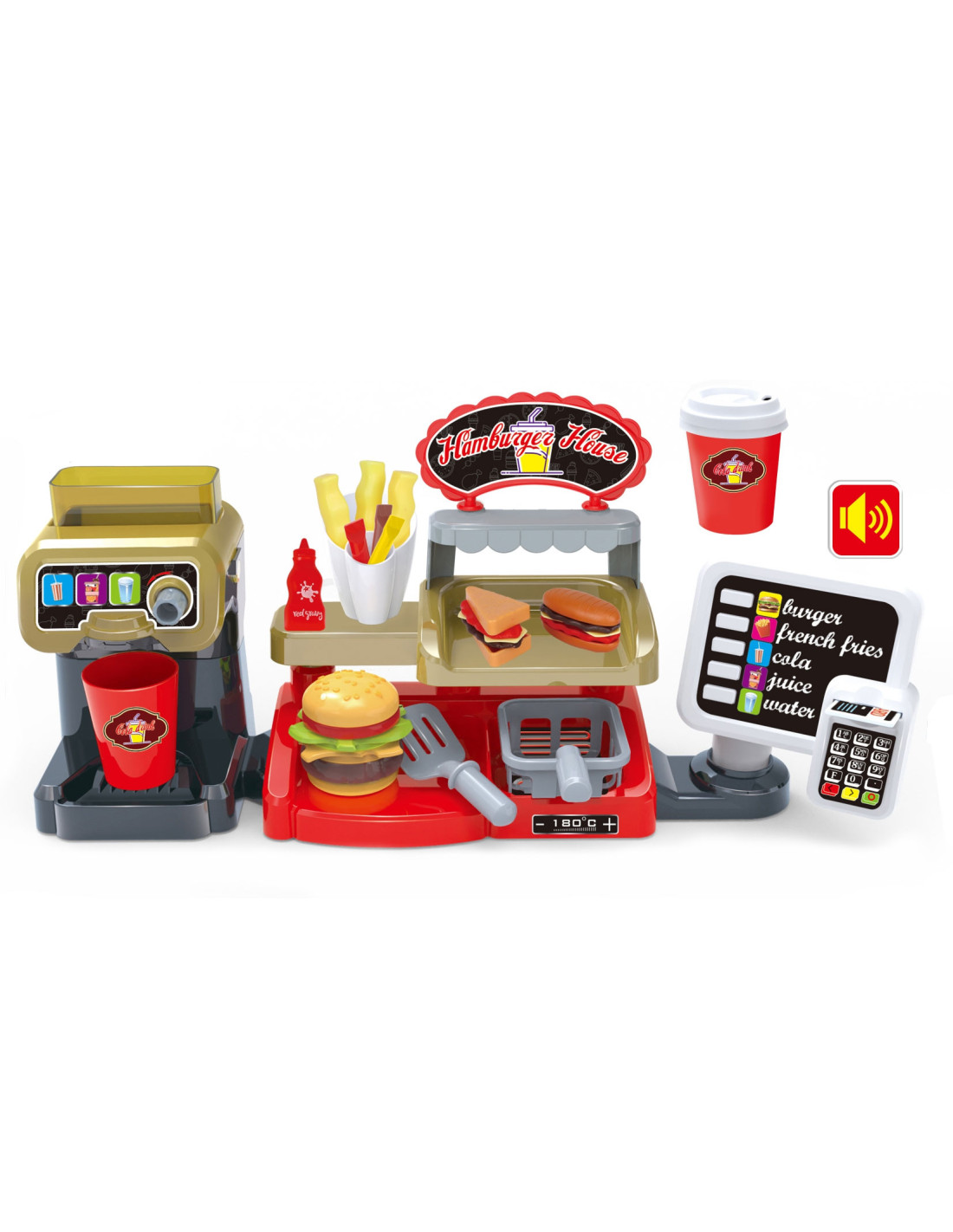 Fast Food XXL z kasą i dystrybutorem od marki WOOPIE pozwoli uwolnić wyobraźnie Twojego dziecka. Dziecko może bawić się w odgrywanie ról z przyjaciółmi podczas zabawy w sprzedawcę i klienta. Dziecko może zaoferować frytki, które wcześniej samo usmaży; kubek z napojem, który samo naleje; burgera, tosta i kanapkę. Burgera i kanapki można ułożyć po swojemu. Do dystrybutora można nalać prawdziwej wody. Aby to robić należy podstawić kubek, przekręcić pokrętło i nalać prawdziwej wody - ta funkcja na pewno zachwyci dziecko! Klient może zapłacić zabawkową kartą kredytową, która po skasowaniu wydaję dźwięk. Kasa posiada dodatkowo specjalne funkcję dźwiękowe i po wciśnięciu odpowiedniego guzika możemy usłyszeć takie nazwy z menu jak: "hamburger", "french fries" "cola", "juice" i "water". Kompletny zestaw interaktywny dla dziecka, które pozwoli mu wcielić się w prawdziwego sprzedawcę, co rozwija wyobraźnię i kreatywność. Gwarancja wielu godzin spędzonych na zabawie z przyjaciólmi!