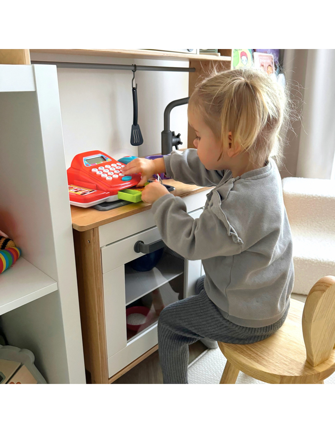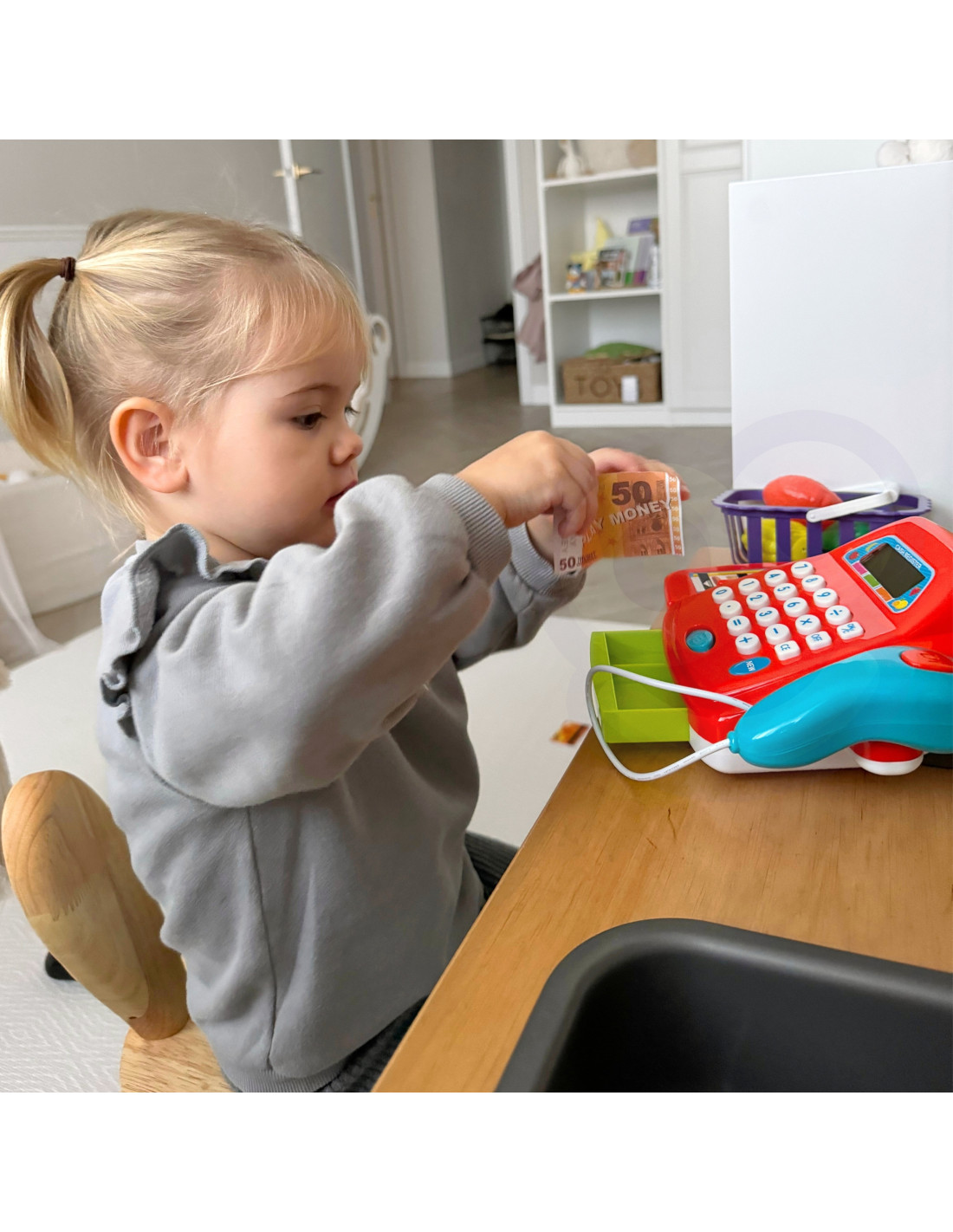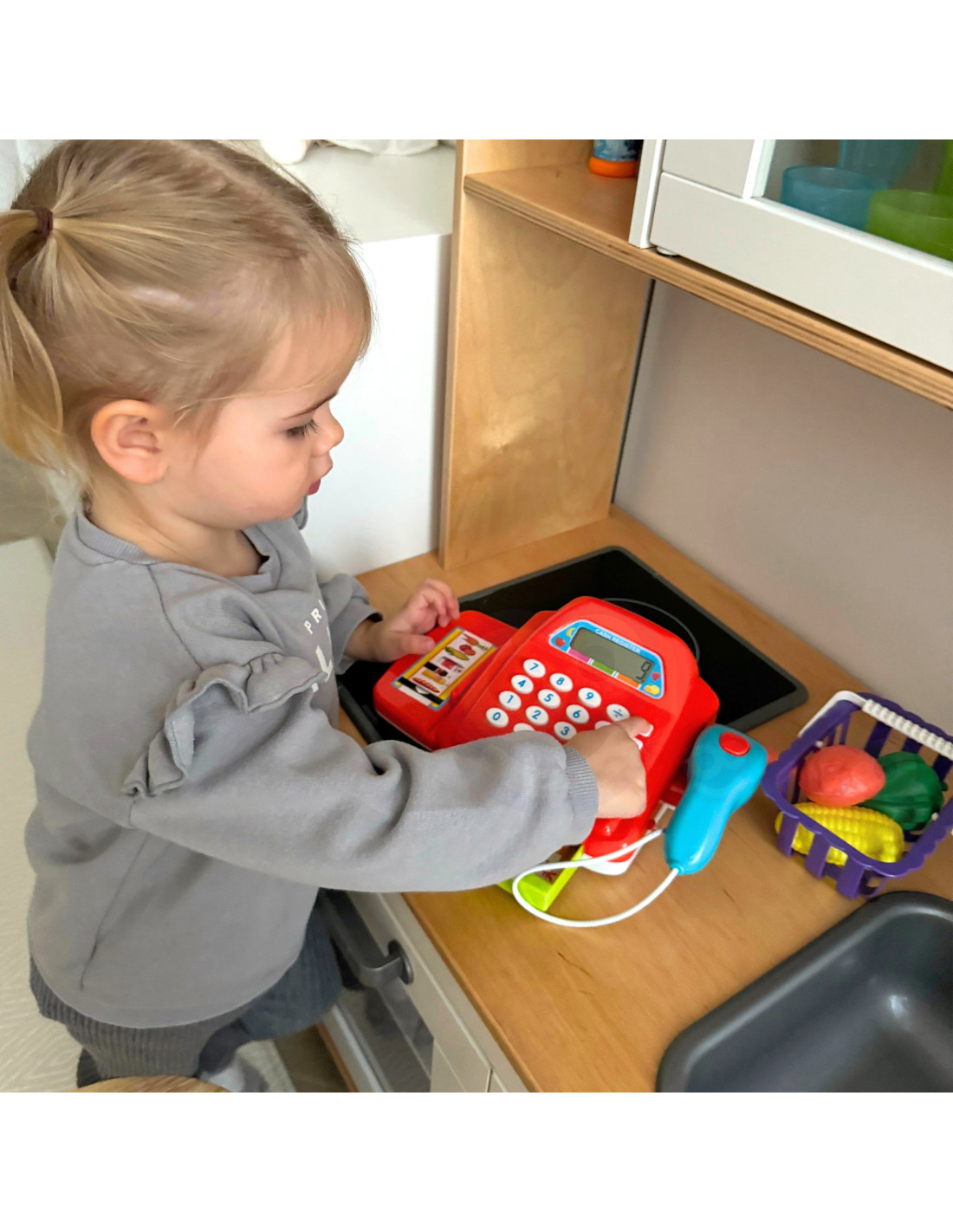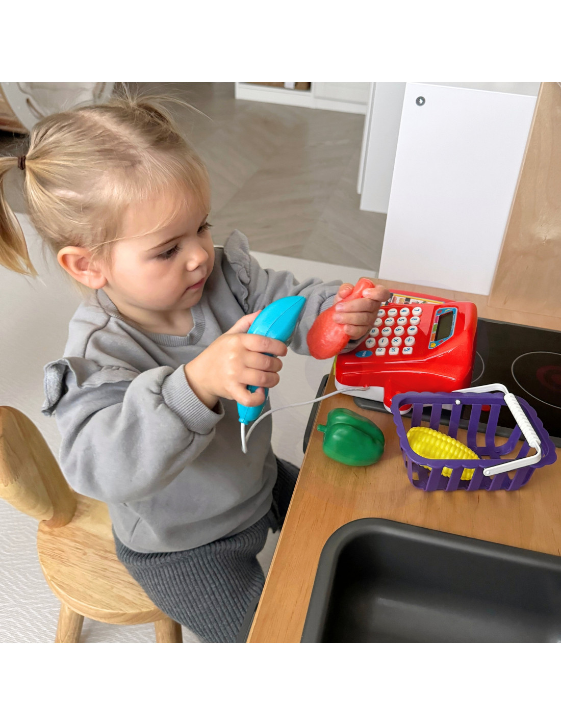 The WOOPIE store checkout with accessories is the perfect playtime option. Children can select the products they want to buy, pack them into a basket, and then load them onto the register. They use a scanner to scan popcorn and other items. Shoppers can then pay with cash or a credit card.