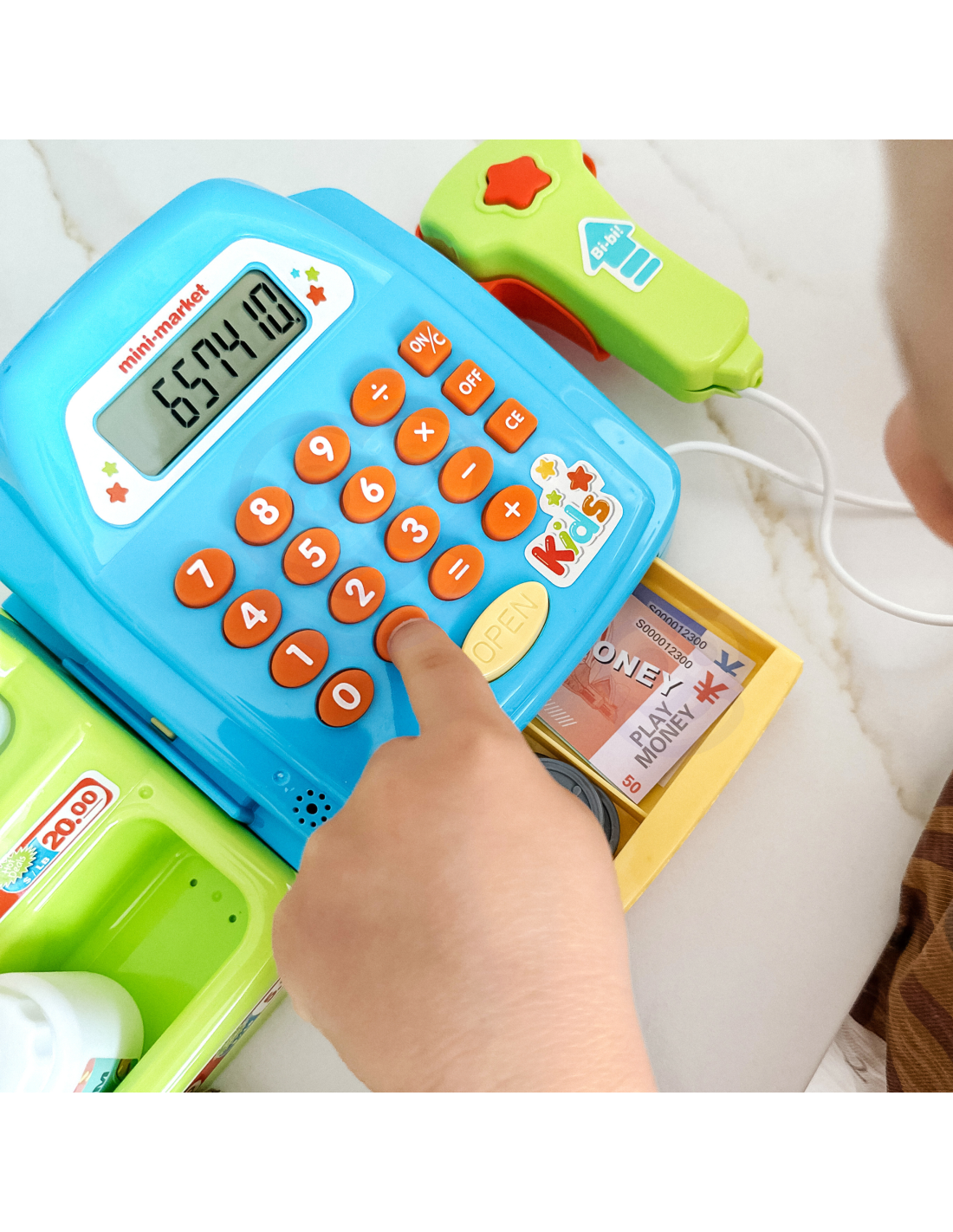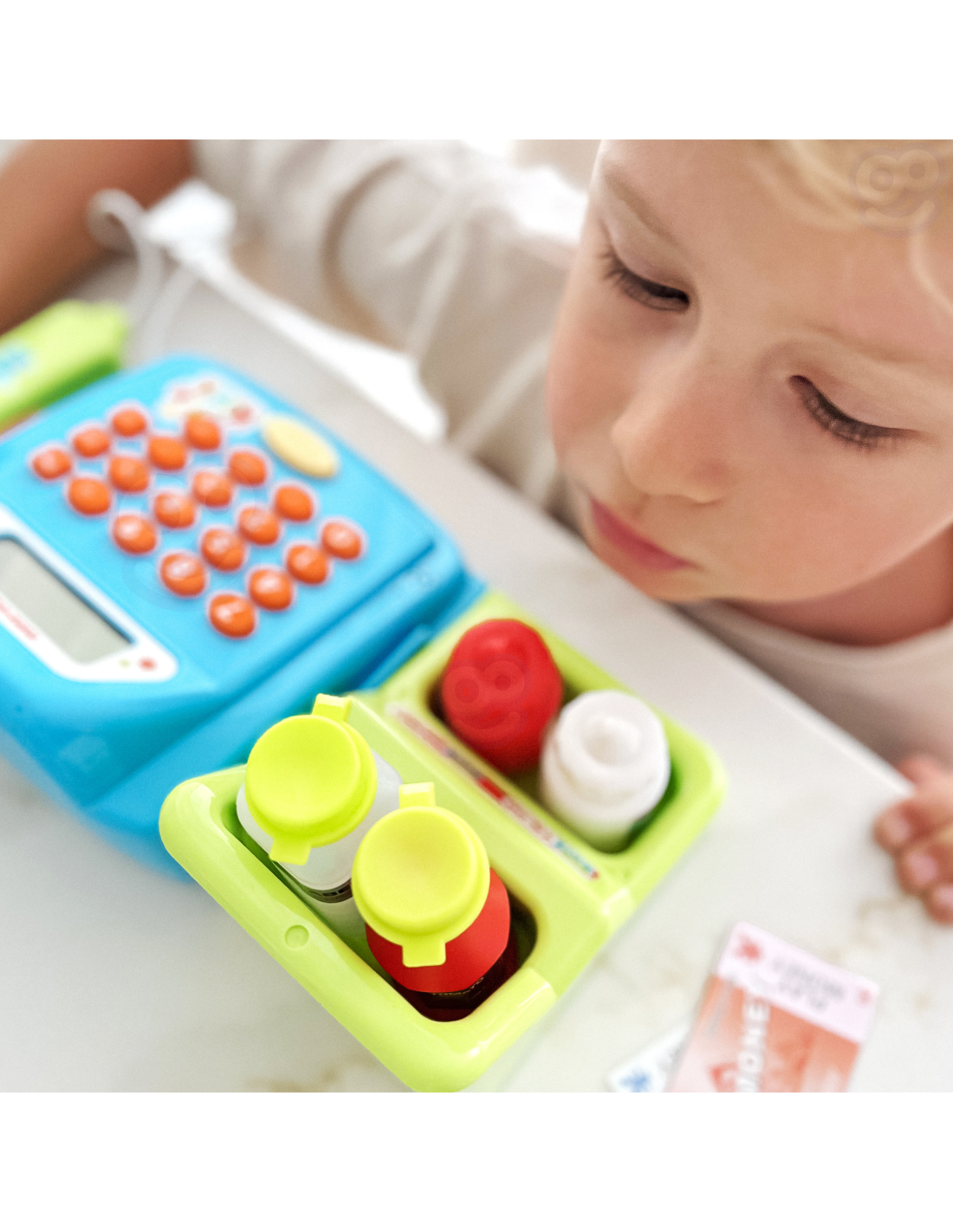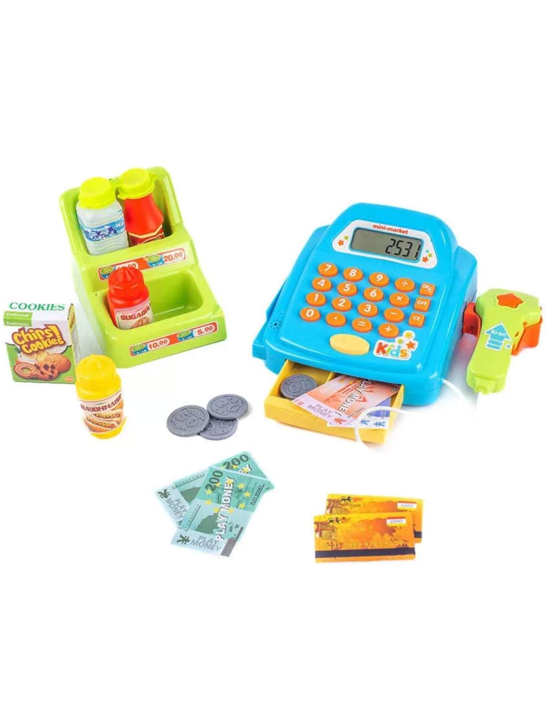 The WOOPIE Cash Register with Shelf is the perfect play device. Children can select the products they want to buy and then place them on the register. They can scan cookies and other items using a scanner. Shoppers can then pay with cash or a payment card.
