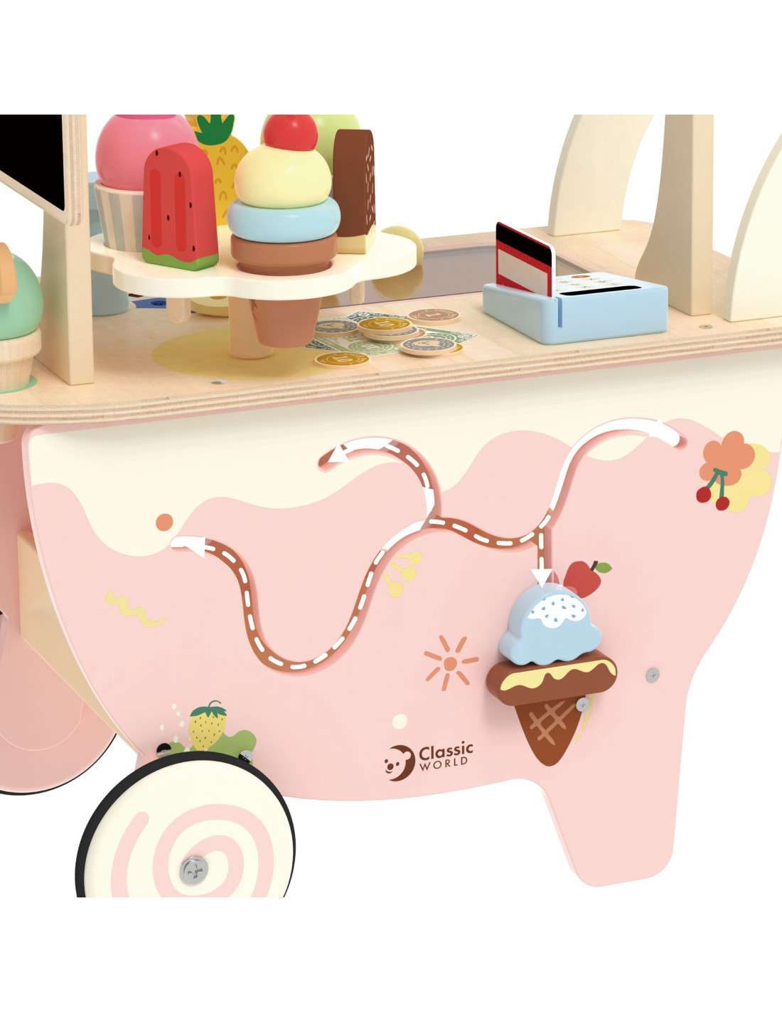 Transform your child's room into a sweet ice cream parlor! This wooden stand on wheels from Classic World is a unique 3-in-1 toy – it functions as both an educational toy and an ice cream parlor. With a wide range of accessories, your little one can serve different flavors of ice cream, developing creativity and social skills. Perfect for children who are learning to walk and love role-playing.