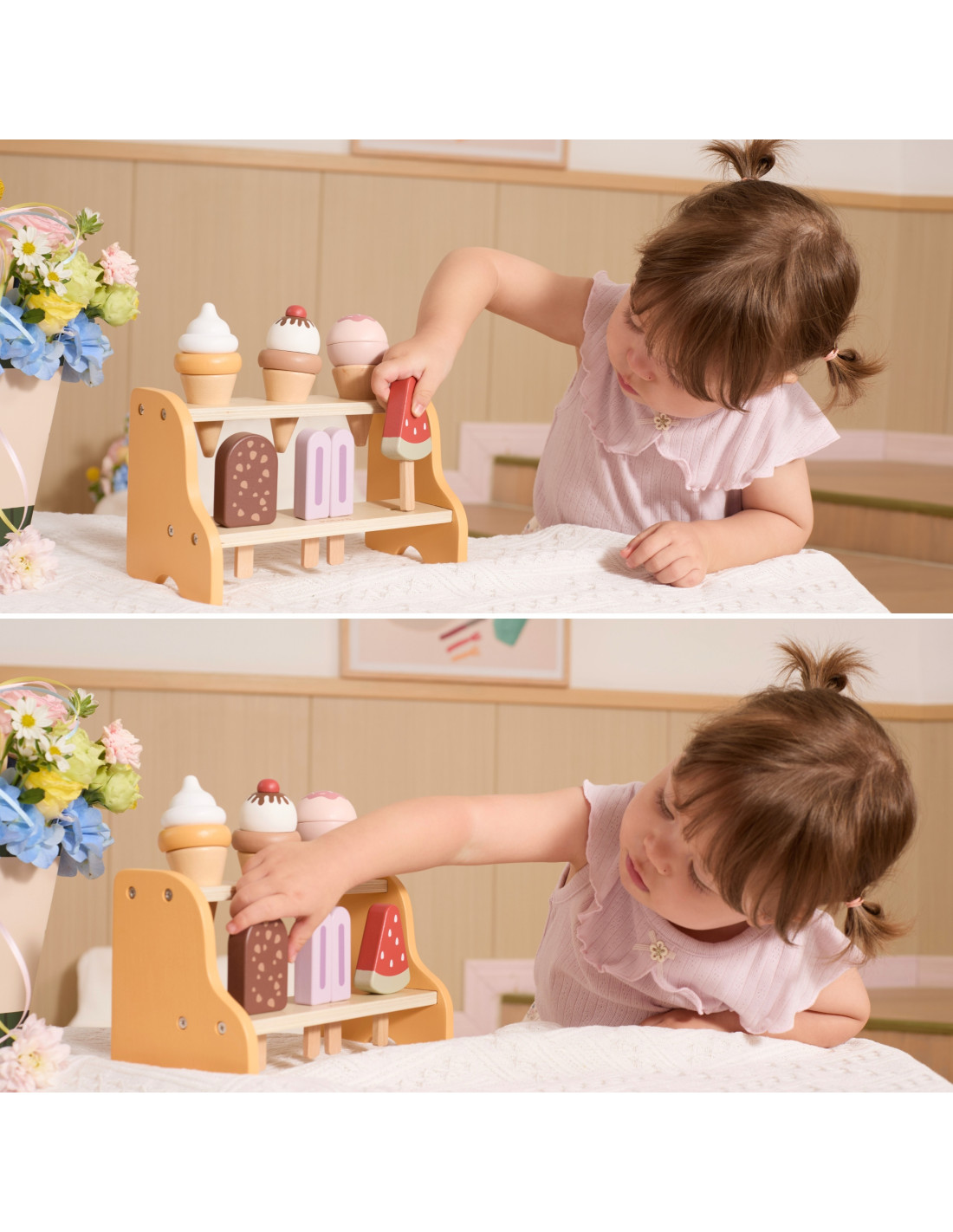 This charming set includes 6 colorful VIGA ice cream cones – 3 cones and 3 popsicles – decorated with iconic designs that will delight every child. The double-layered wooden stand allows you to display the ice cream and keep things organized while playing. Removable elements stimulate fine motor skills and develop tactile play. Perfect for creative role-play – for example, your own ice cream stand!