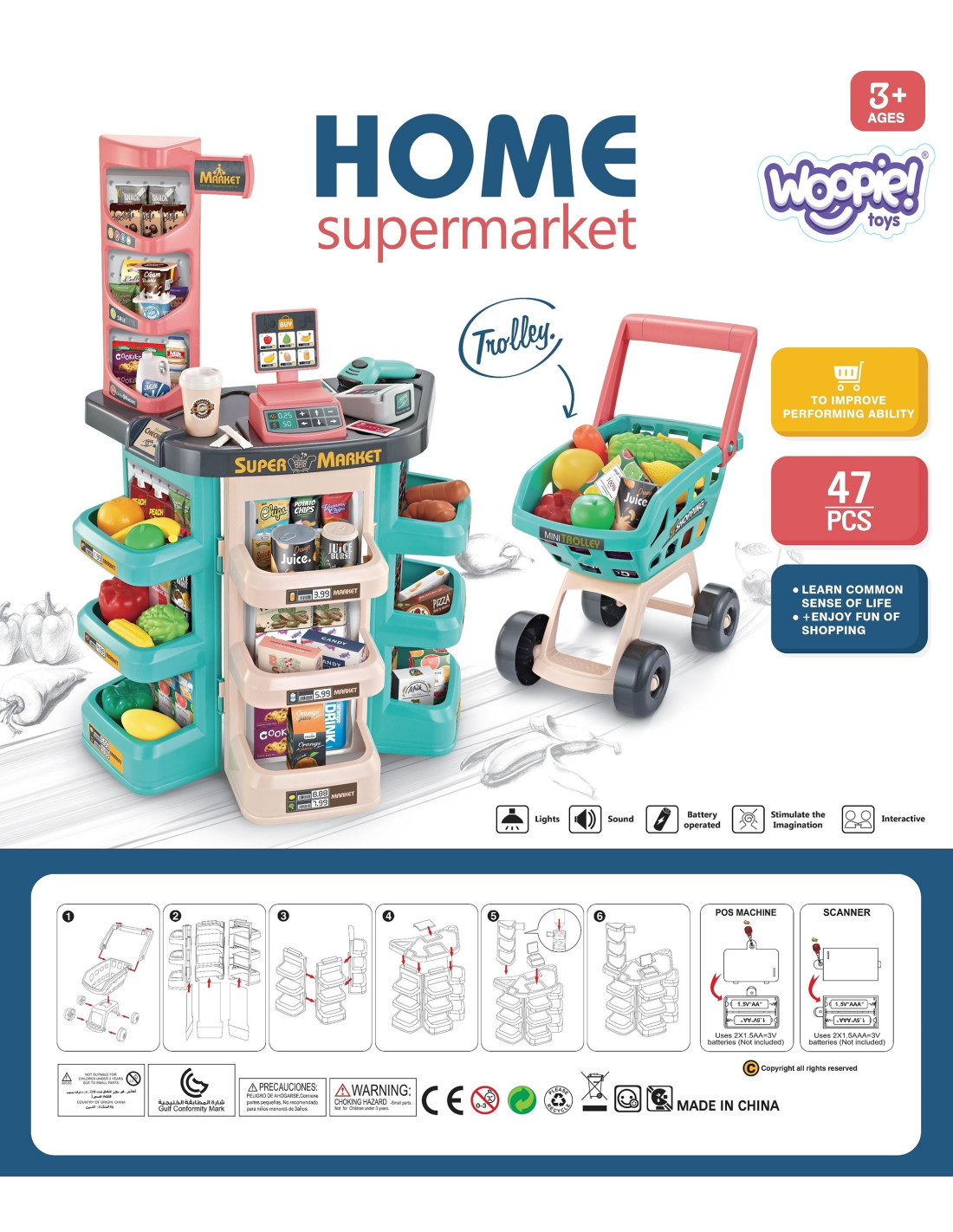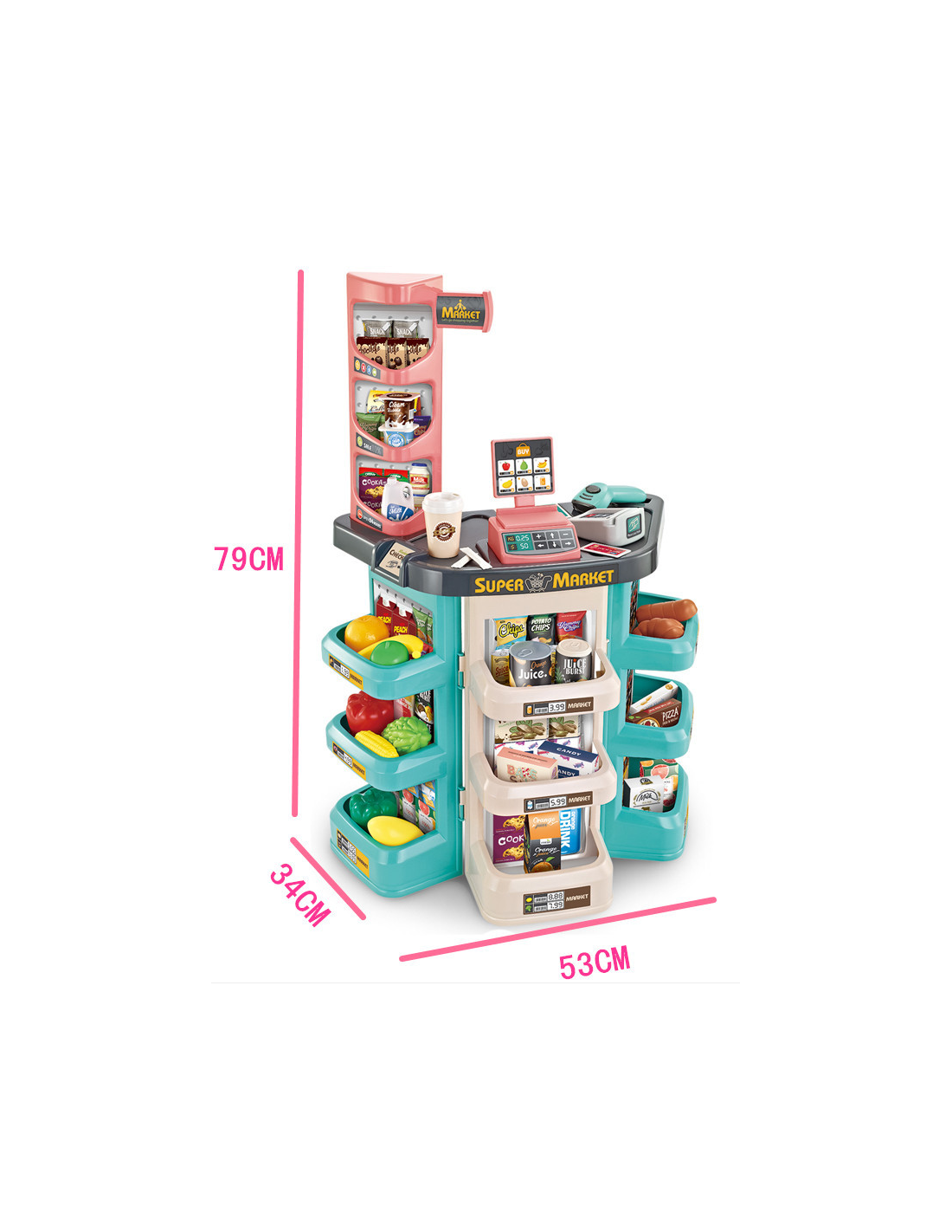 Supermarket z wózkiem sklepowym zawierający 47 akcesoriów od niezawodnej marki Woopie to idealna propozycja dla dzieci powyżej 3 roku życia. Dzieci uwielbiają naśladować swoich rodziców dlatego to doskonały zestaw dla Twojego dziecka. Odgrywanie ról niezwykle rozwija wyobraźnie i kreatywność malucha. Sklepik zawiera w zestawie wszystkie niezbędne elementy do wyposażenia stanowiska pracy małego sprzedawcy w tym: kasę z wagą, skanerem i czytnikiem kart płatniczych. Dołączony wózek na zakupy umożliwia zabawę z przyjaciółmi nie ważne gdzie i kiedy, a dodatkowo dziecko już zawszę będzie wiedziało jak zachować się w supermarkecie!