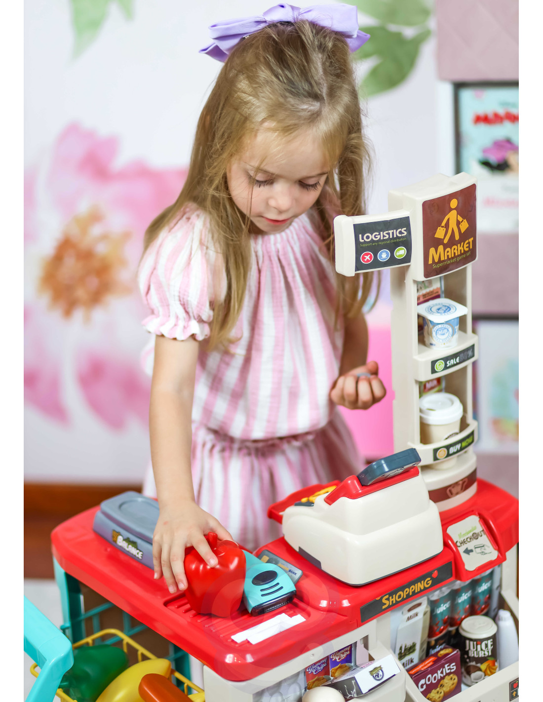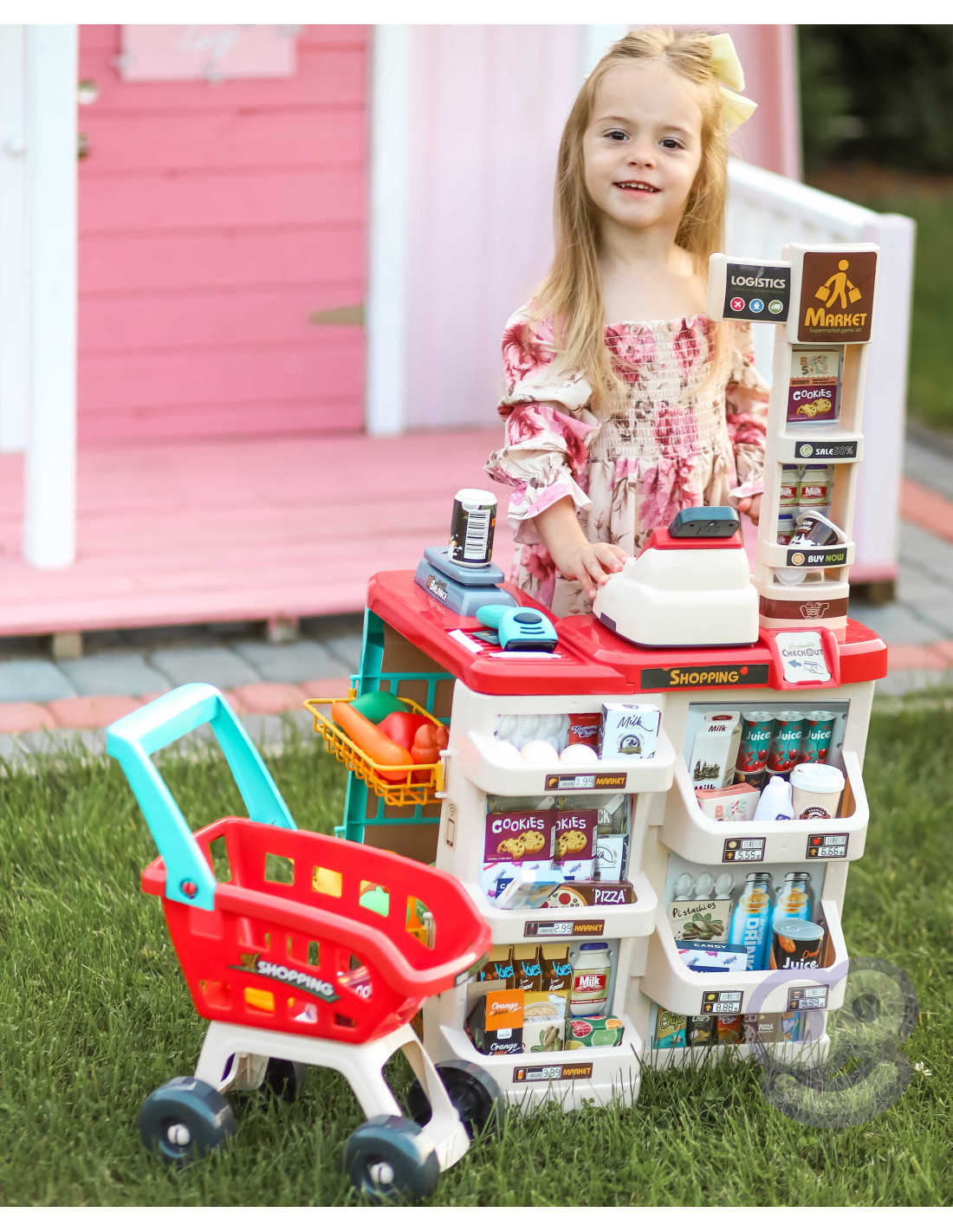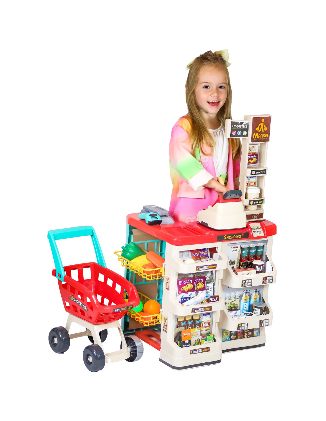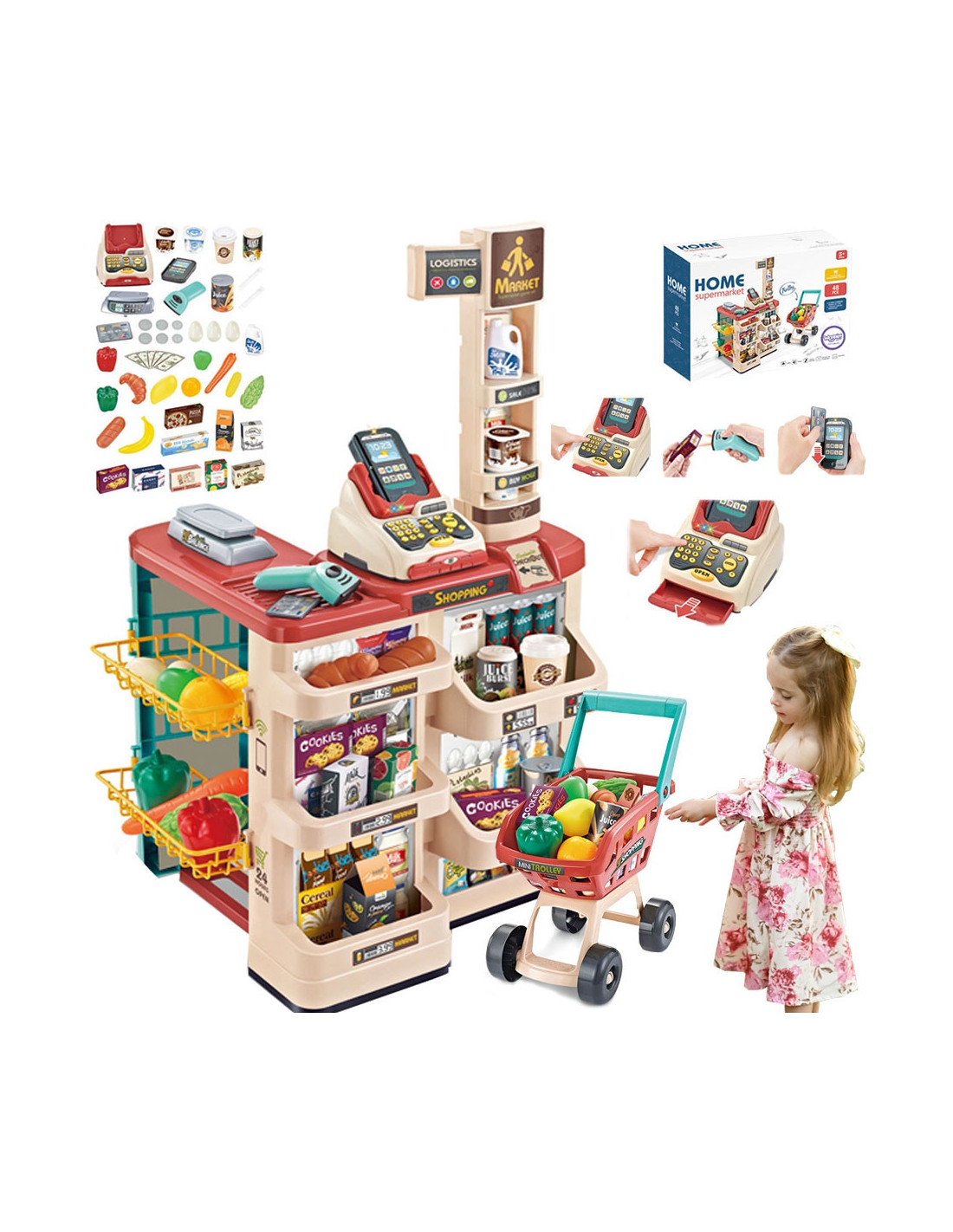 A supermarket with a shopping cart and many additional accessories , from the Woopie brand. This is an ideal idea for children over 3 years old . Children love to imitate their parents in their daily routines , so this is the perfect set for your child and an additional opportunity for your child to not only have fun but also learn something (role-playing is incredibly stimulating for toddlers' imagination and creativity ). The shop includes all the necessary elements to equip a small shopkeeper's workstation, including a cash register with a terminal, a scale, a scanner, a payment card , and numerous groceries. The included shopping cart allows them to play with friends no matter where or when!