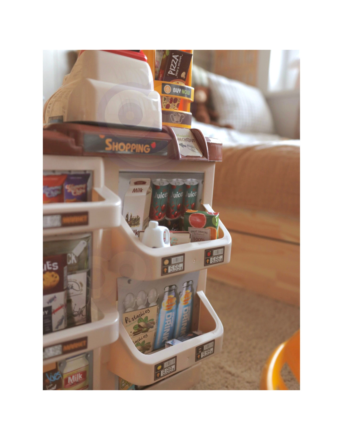A supermarket with a shopping cart featuring 48 accessories , from the Woopie brand. Perfect for children aged 3 and up . Children love imitating their parents in their daily routines , so this is the perfect set for your child and an additional opportunity to not only have fun but also learn something (role-playing is incredibly stimulating for toddlers' imagination and creativity ). The shop includes all the necessary elements to equip a young shopkeeper's workstation, including a cash register with a terminal, a scale, a scanner, a payment card, and numerous groceries. The included shopping cart allows for fun with friends no matter where or when!