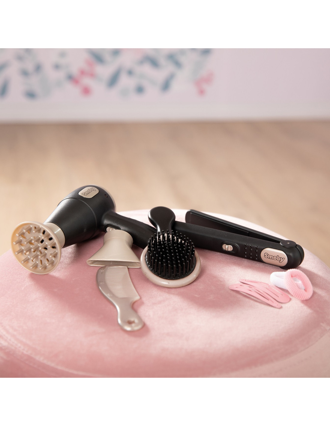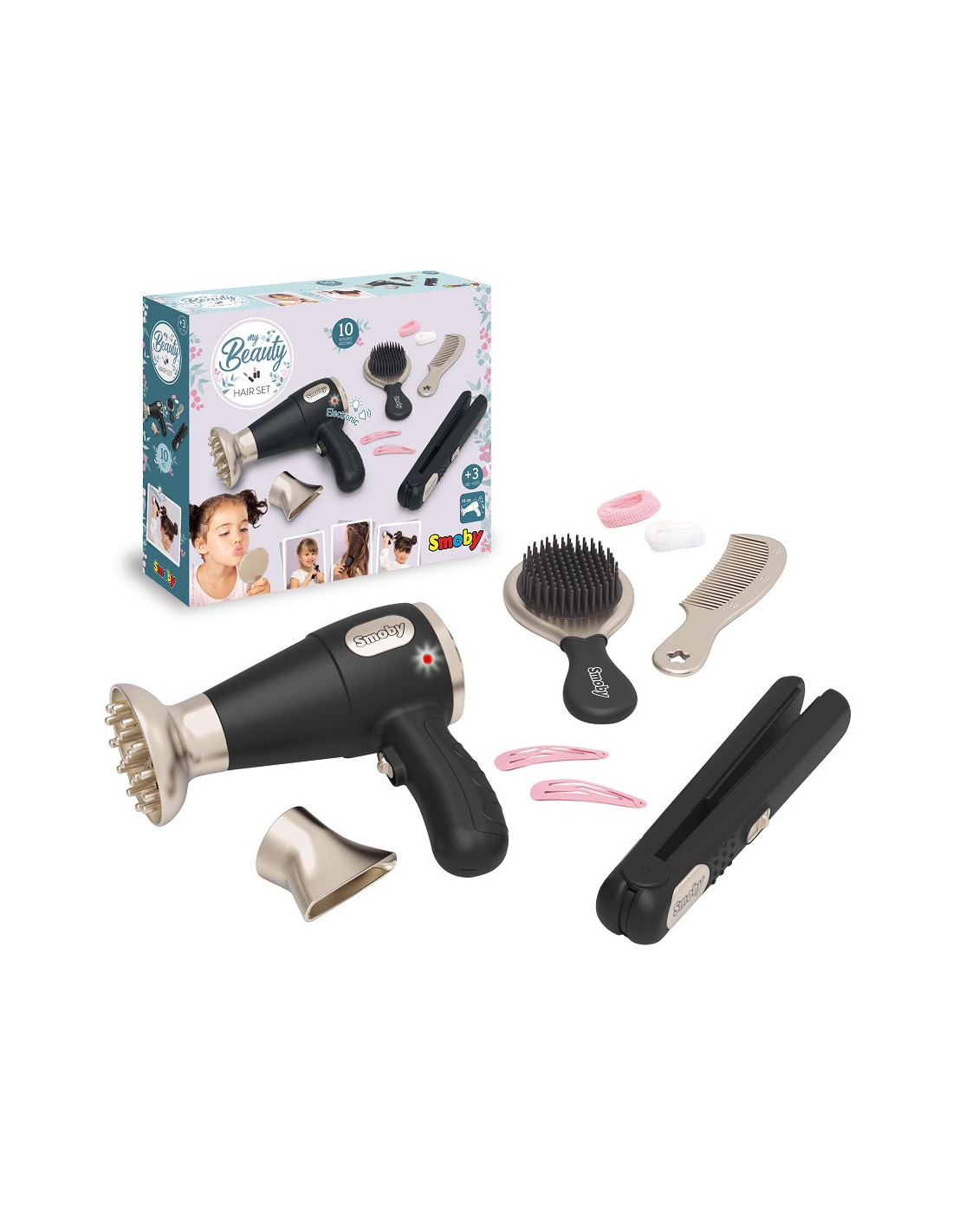 - - the set includes a hairdryer, hairdryer attachments, hair straightener, brush, comb, clips, hair bands,