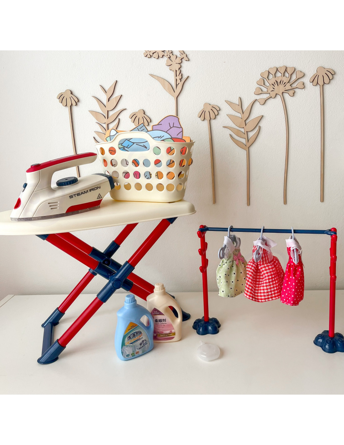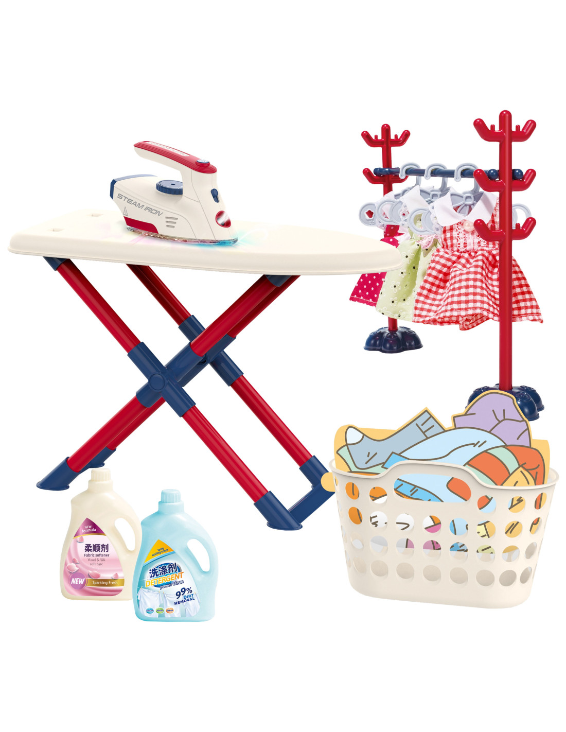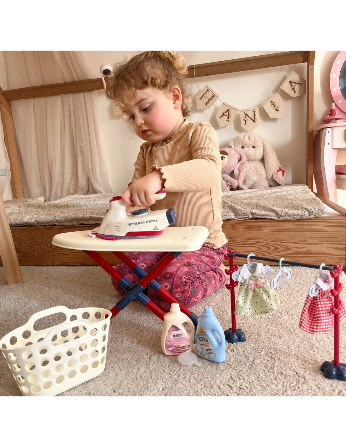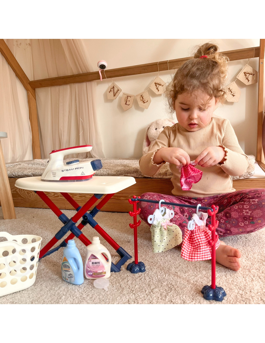 The Ironing Set from WOOPIE will give your child tons of fun pretending to be a little housewife. The set includes an iron , ironing board, laundry basket , standing hanger , three small doll dresses , and two containers of laundry detergent . The iron is safe for children because it doesn't heat up. It's equipped with many features that will add to the fun: one of the buttons on the iron's handle, which, when pressed and held , reproduces real ironing sounds, a glowing LED light , and sound effects in the form of songs . This is a perfect set for children who love to imitate their parents during everyday activities.