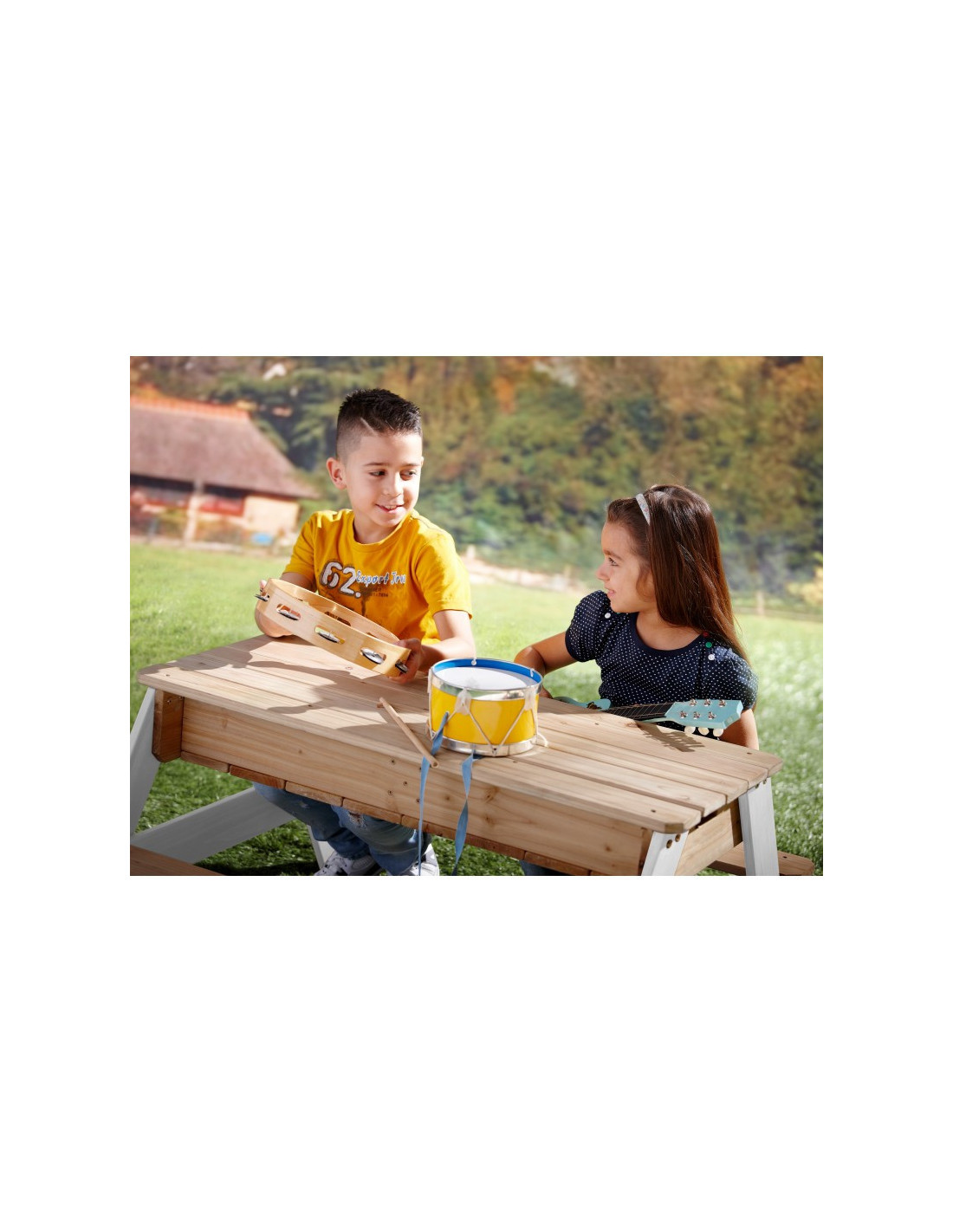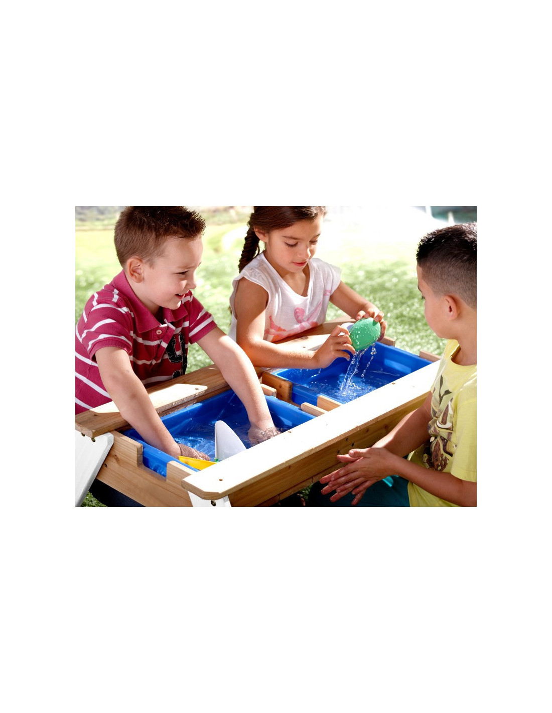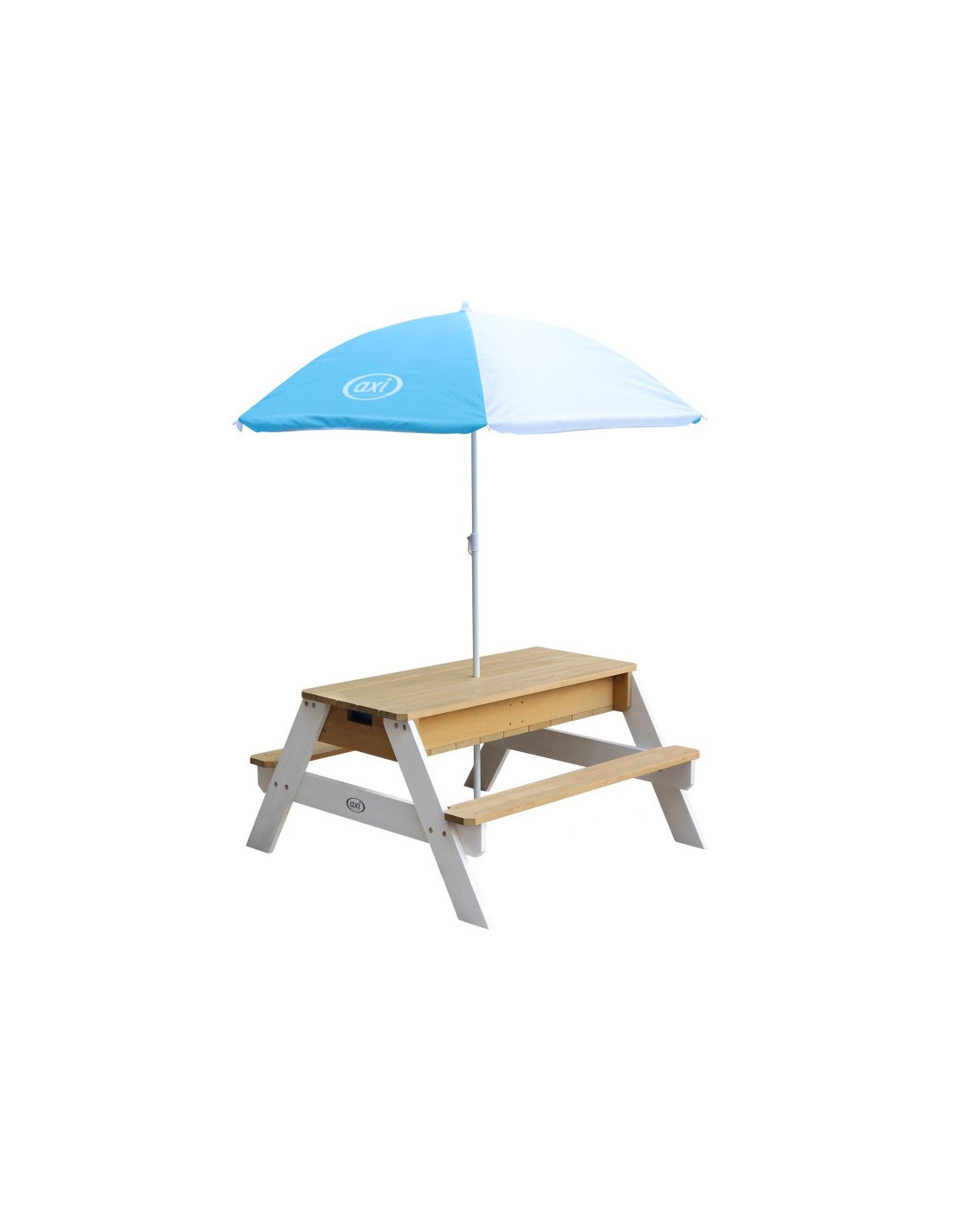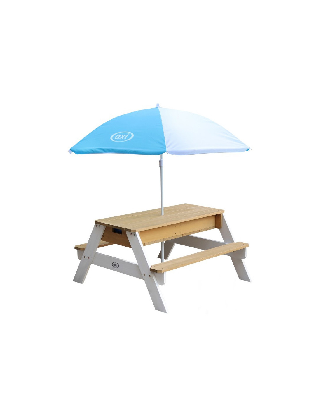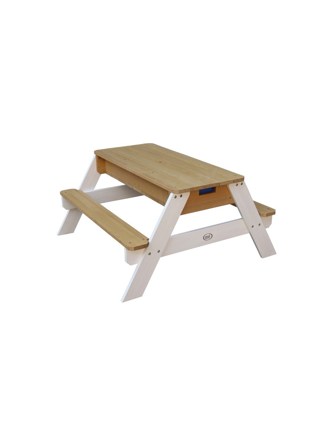The Nick Picnic Table from the renowned brand AXI is a multifunctional table with a secret compartment with two blue containers beneath the removable tabletop. These blue containers can be filled with sand and/or water, but of course, they can also be used to store toys. Furthermore, the containers are removable , making them easy to clean. The classic combination of sand and water always works well with children! In a flash, you can transform a sand and water table into a picnic table where children can create, draw, or enjoy treats.