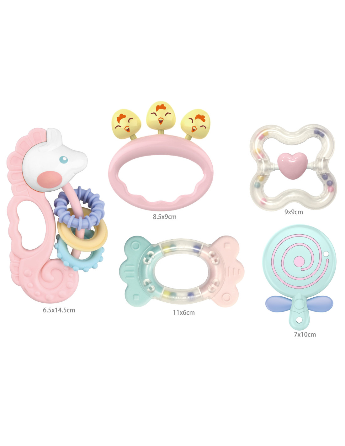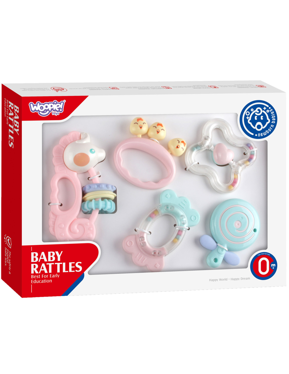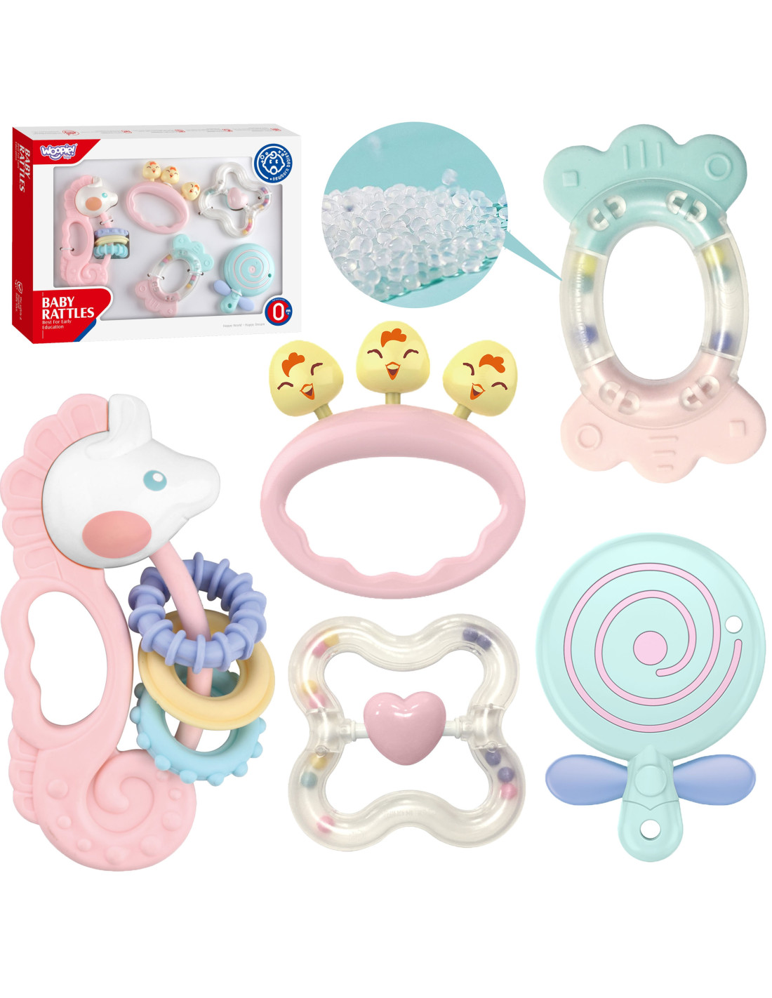 The WOOPIE Teether Rattle Set for Babies includes 5 colorful pieces designed to help your baby through teething . These teethers not only provide relief for sore gums but also stimulate visual and auditory development . Additionally, the concave and convex shapes and varied textures stimulate tactile development.