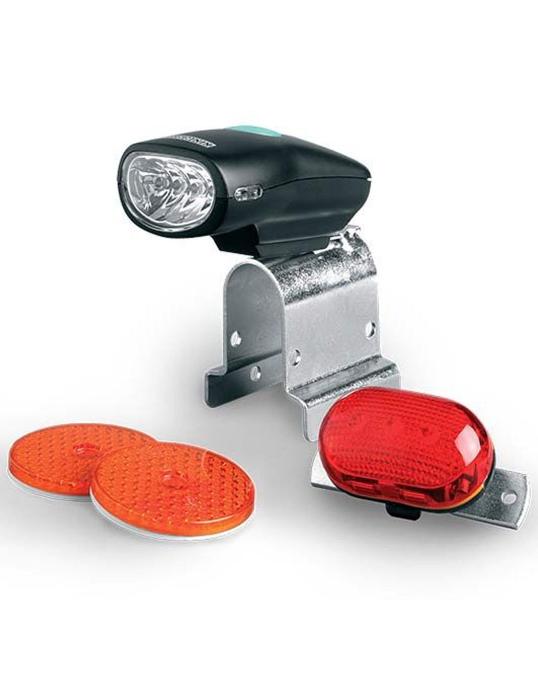 Kompletny zestaw oświetleniowy LED do gokartów firmy Berg. W zestawie znajduje się: światło przednie, światło tylne oraz dwa odblaskowe krążki. Światła wyposażone są w solidne metalowe mocowania.