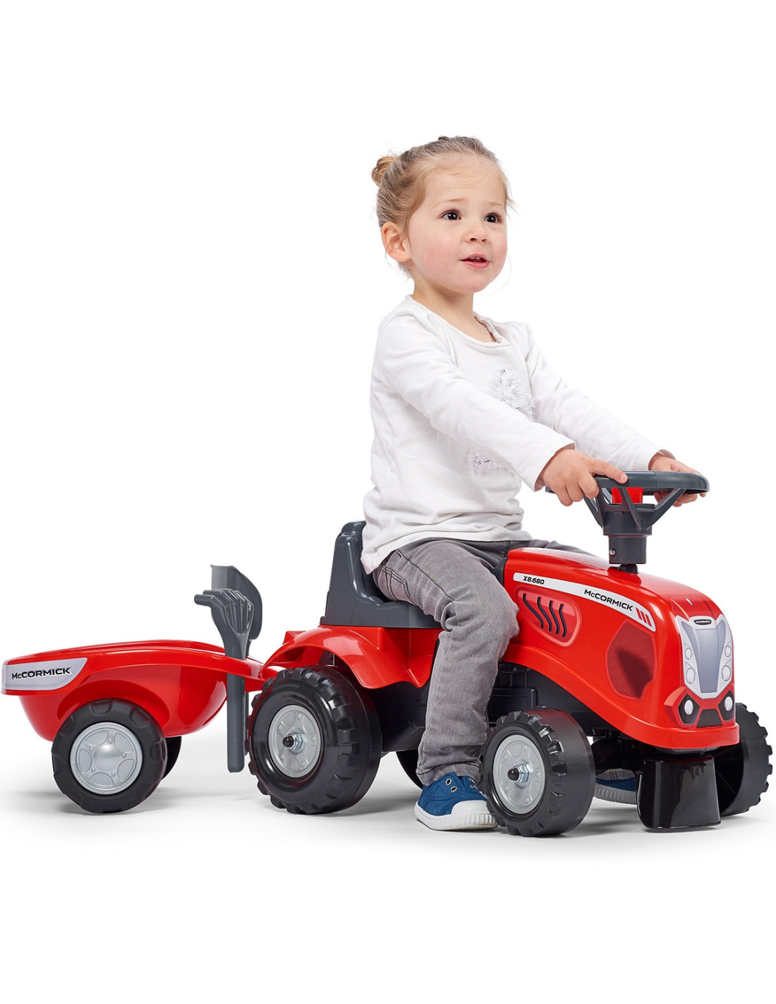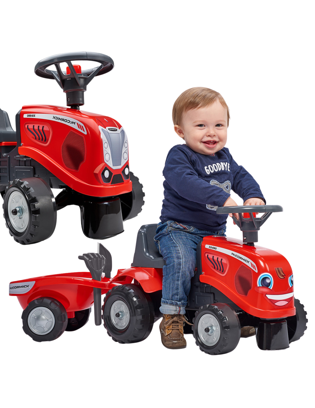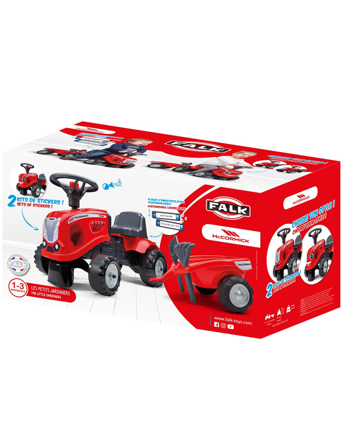 The Baby Mac Cormick Ride-on Tractor with Trailer by Falk is a dream come true for many a little tractor driver. Meticulously crafted with attention to the smallest detail ! No true farmer would turn down such a ride-on tractor. Made of the highest quality plastic , this vehicle is suitable for children aged 12 months and up. It features a detachable trailer with panels and a steering wheel with a horn . The tractor's wheels are made of high-quality plastic . Additionally, the tractor comes with a rake and a shovel for your child to play with. The included stickers allow your child to choose their own unique style. A smiley face or a standard sticker? Surprise everyone by applying it to the front of the vehicle.
