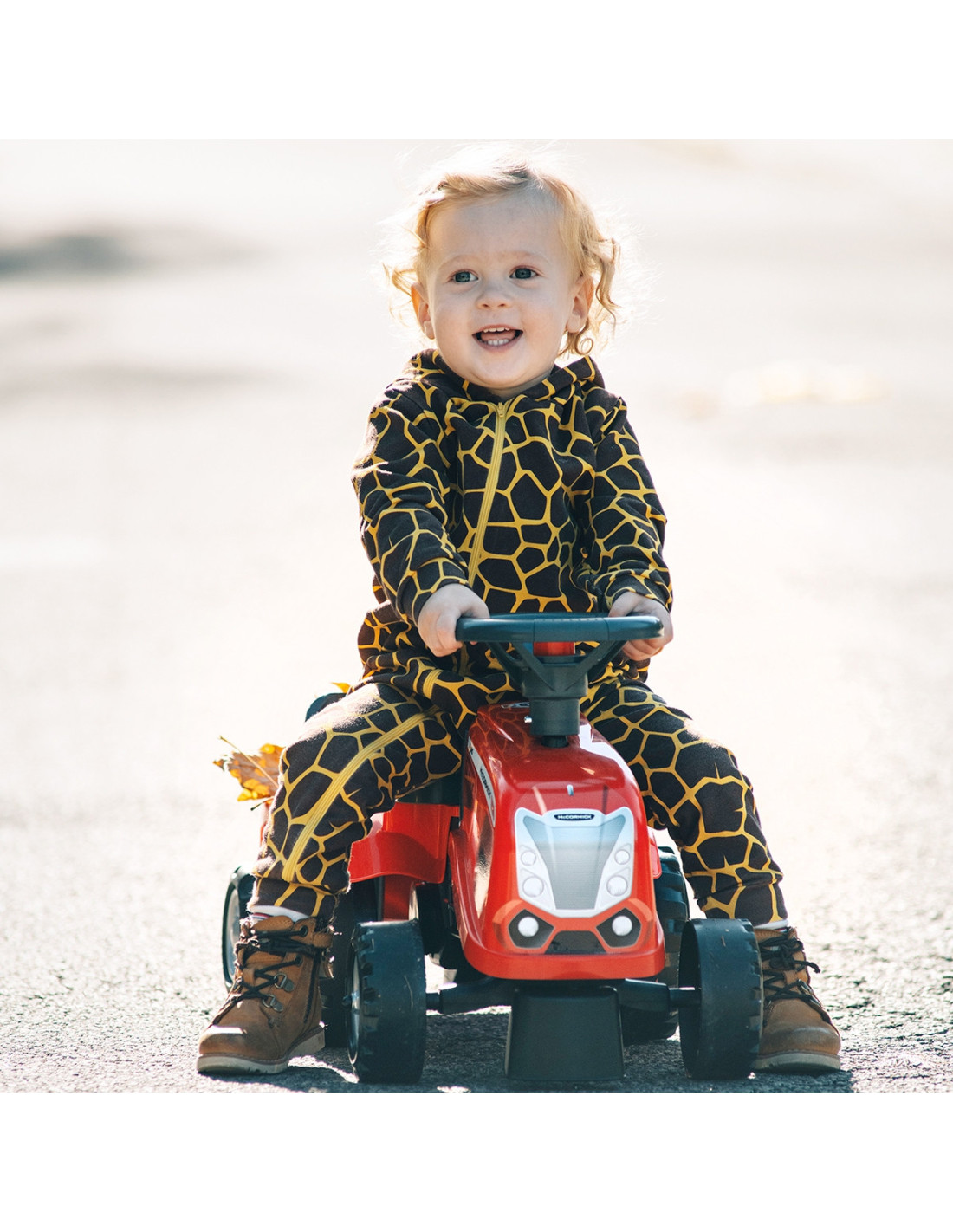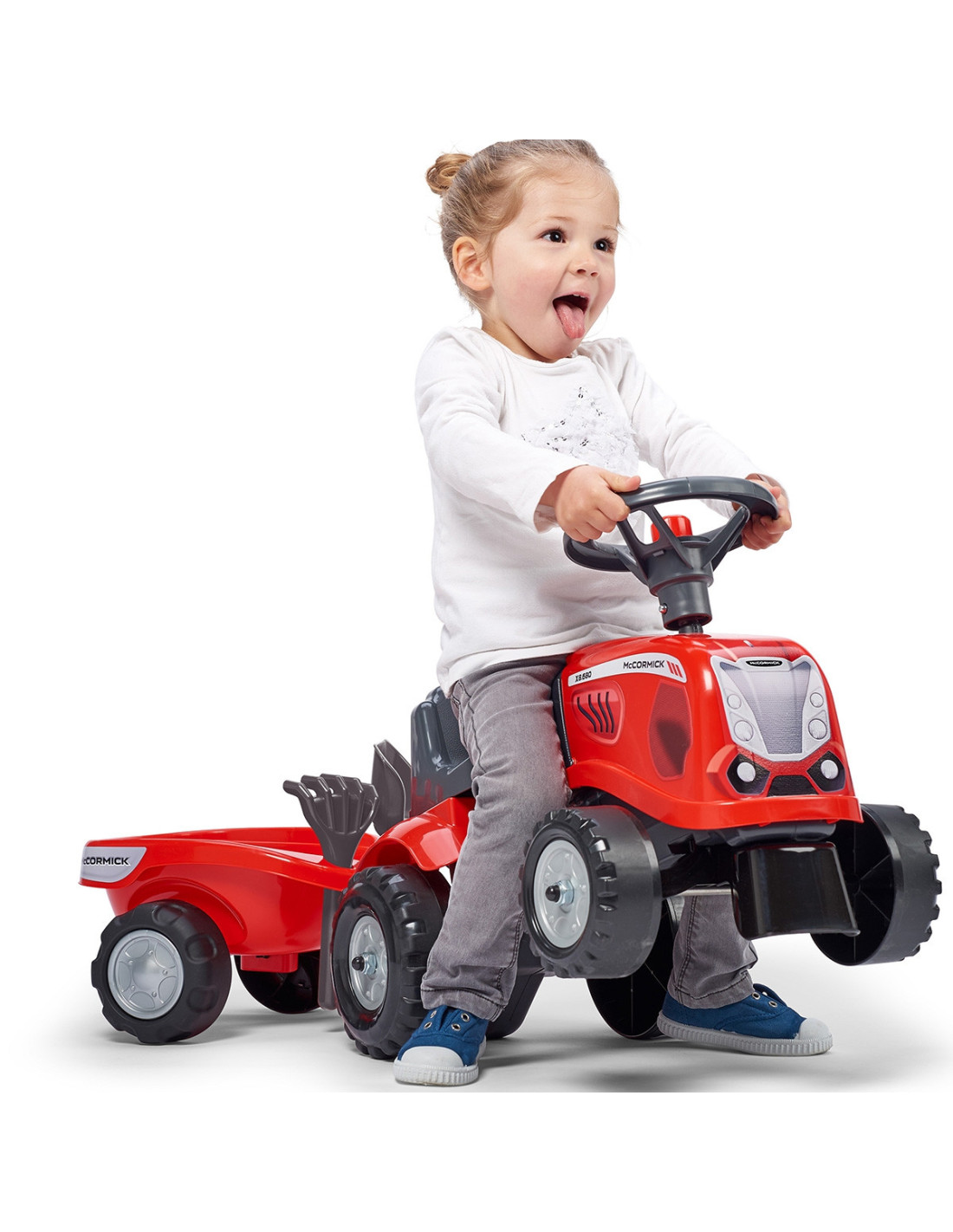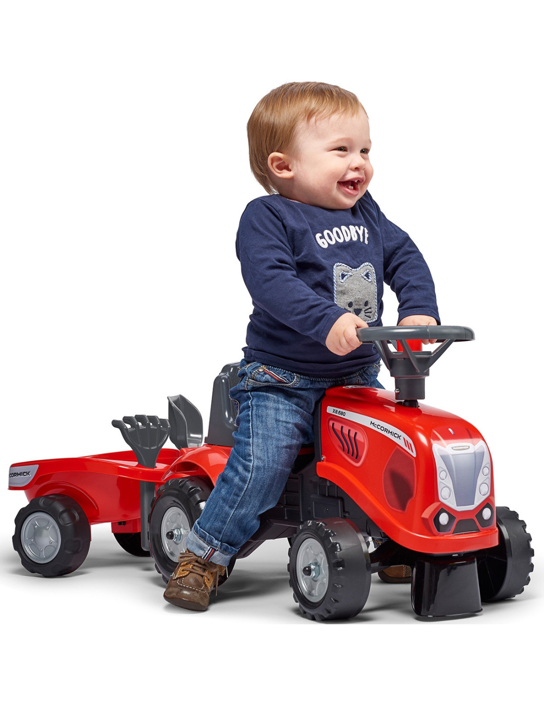 The Baby Mac Cormick Ride-on Tractor with Trailer by Falk is a dream come true for many a little tractor driver. Meticulously crafted with attention to the smallest detail ! No true farmer would turn down such a ride-on tractor. Made of the highest quality plastic , this vehicle is suitable for children aged 12 months and up. It features a detachable trailer with panels and a steering wheel with a horn . The tractor's wheels are made of high-quality plastic . Additionally, the tractor comes with a rake and a shovel for your child to play with. The included stickers allow your child to choose their own unique style. A smiley face or a standard sticker? Surprise everyone by applying it to the front of the vehicle.