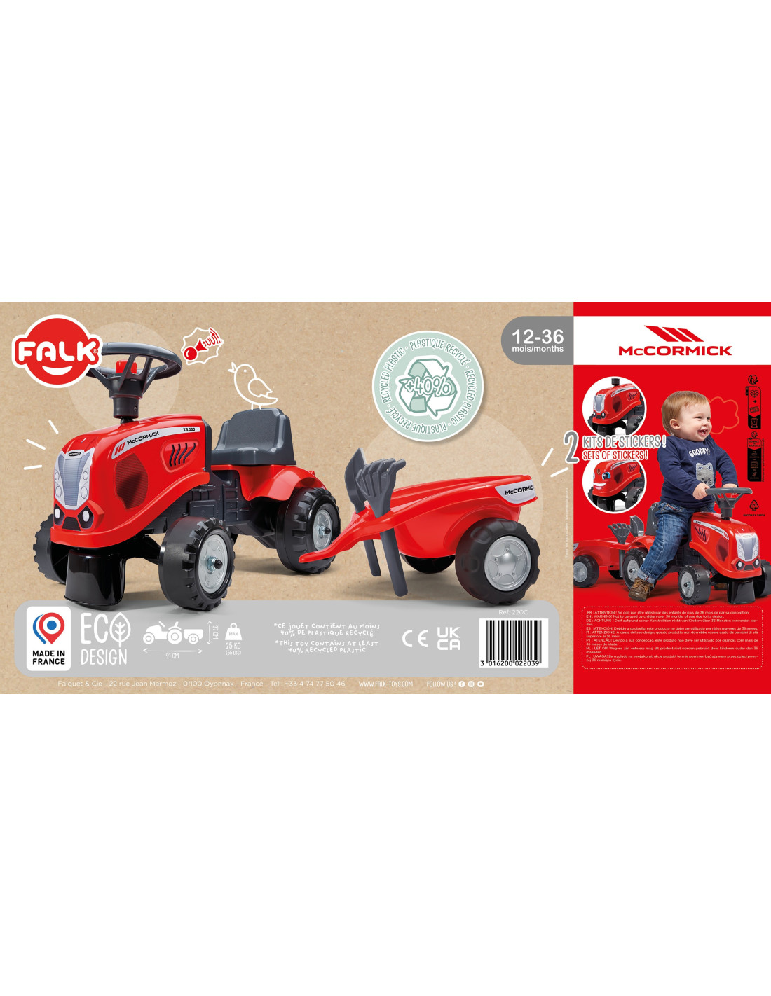 Falk is a leading European manufacturer of high-quality pedal-powered vehicles. Their product range includes licensed tractors from brands such as Claas, Renault, McCormick, Kubota, Case IH, and others. All vehicles are manufactured in France using high-quality materials.