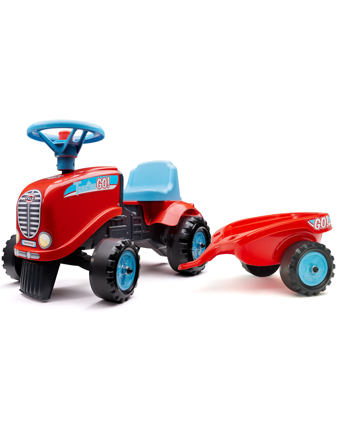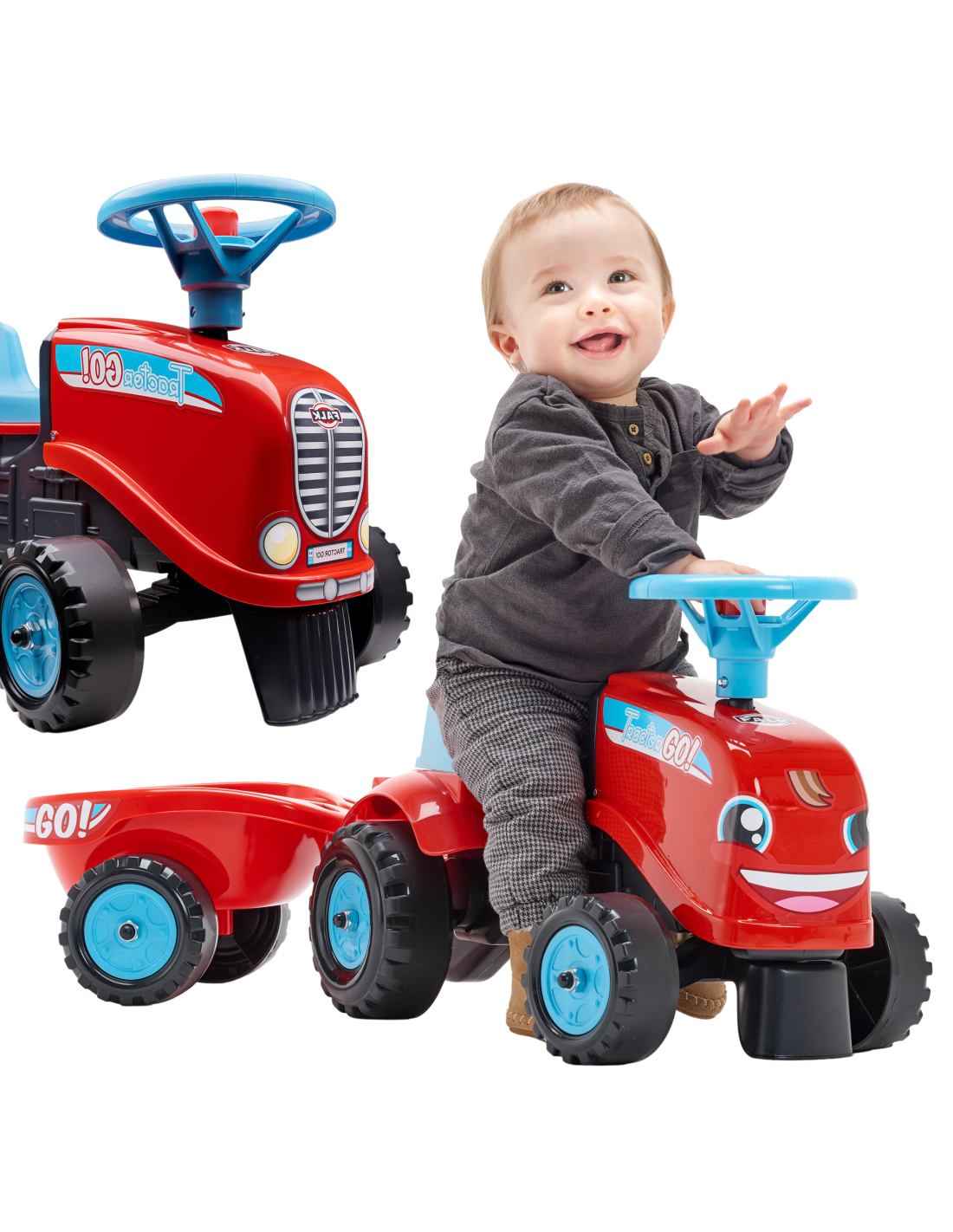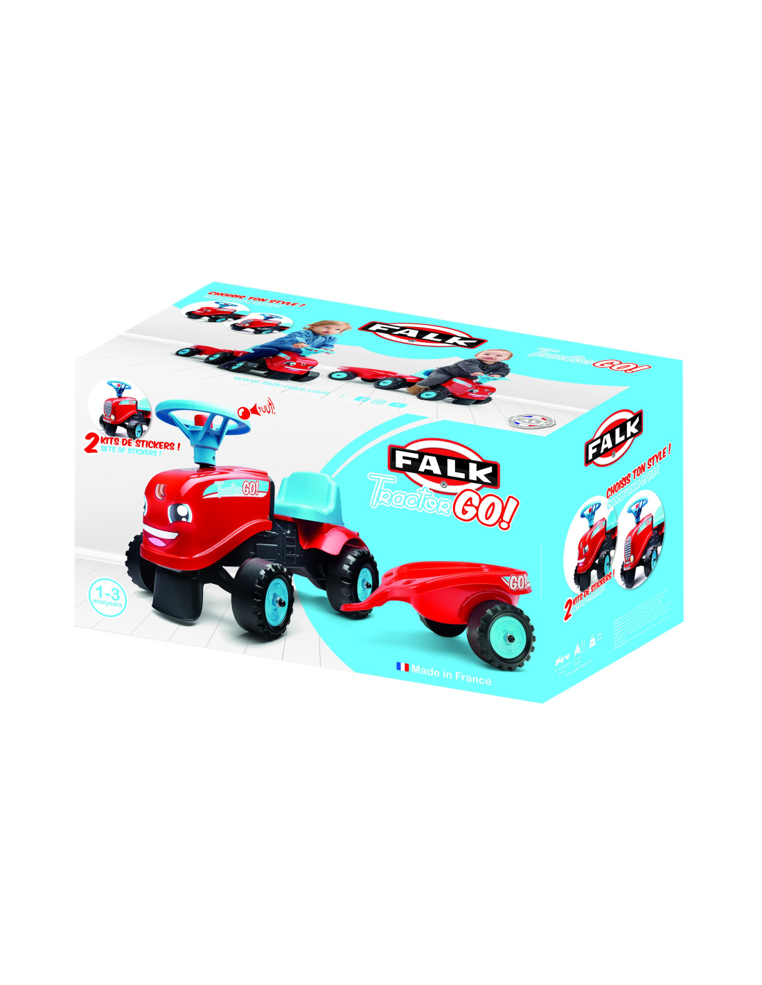 The Falk "Tractor Go" ride-on tractor with trailer is a dream come true for many a little tractor driver. Meticulously crafted with attention to the smallest detail ! No true farmer would turn down such a ride-on tractor. Made of the highest quality plastic, this vehicle is suitable for children aged 12 months and up. It features a detachable trailer with panels and a steering wheel with a horn . The tractor's wheels are made of high-quality plastic . The included stickers allow your child to choose their own unique style. A smiley face or a standard sticker? Surprise everyone by applying it to the front of the vehicle.