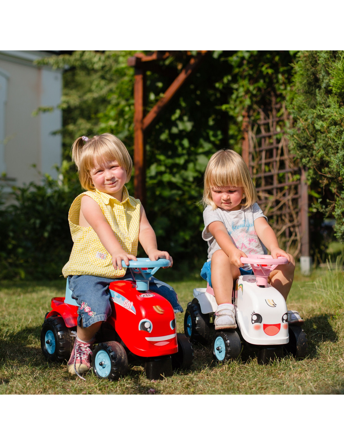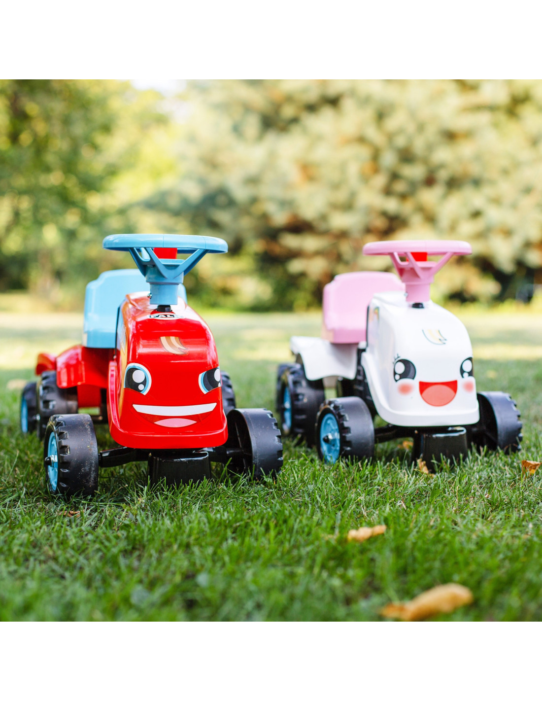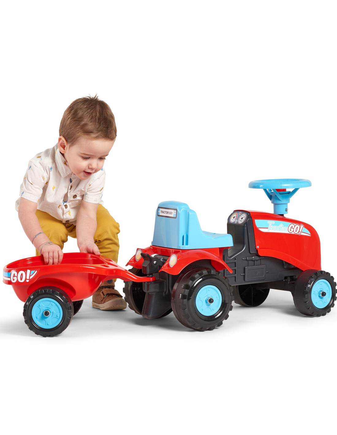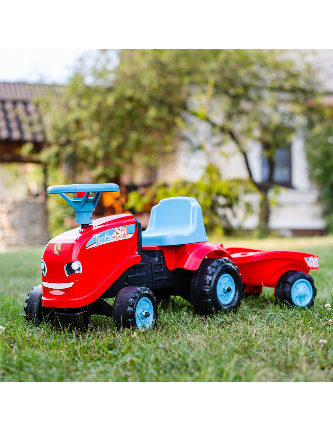 The Falk "Tractor Go" ride-on tractor with trailer is a dream come true for many a little tractor driver. Meticulously crafted with attention to the smallest detail ! No true farmer would turn down such a ride-on tractor. Made of the highest quality plastic, this vehicle is suitable for children aged 12 months and up. It features a detachable trailer with panels and a steering wheel with a horn . The tractor's wheels are made of high-quality plastic . The included stickers allow your child to choose their own unique style. A smiley face or a standard sticker? Surprise everyone by applying it to the front of the vehicle.