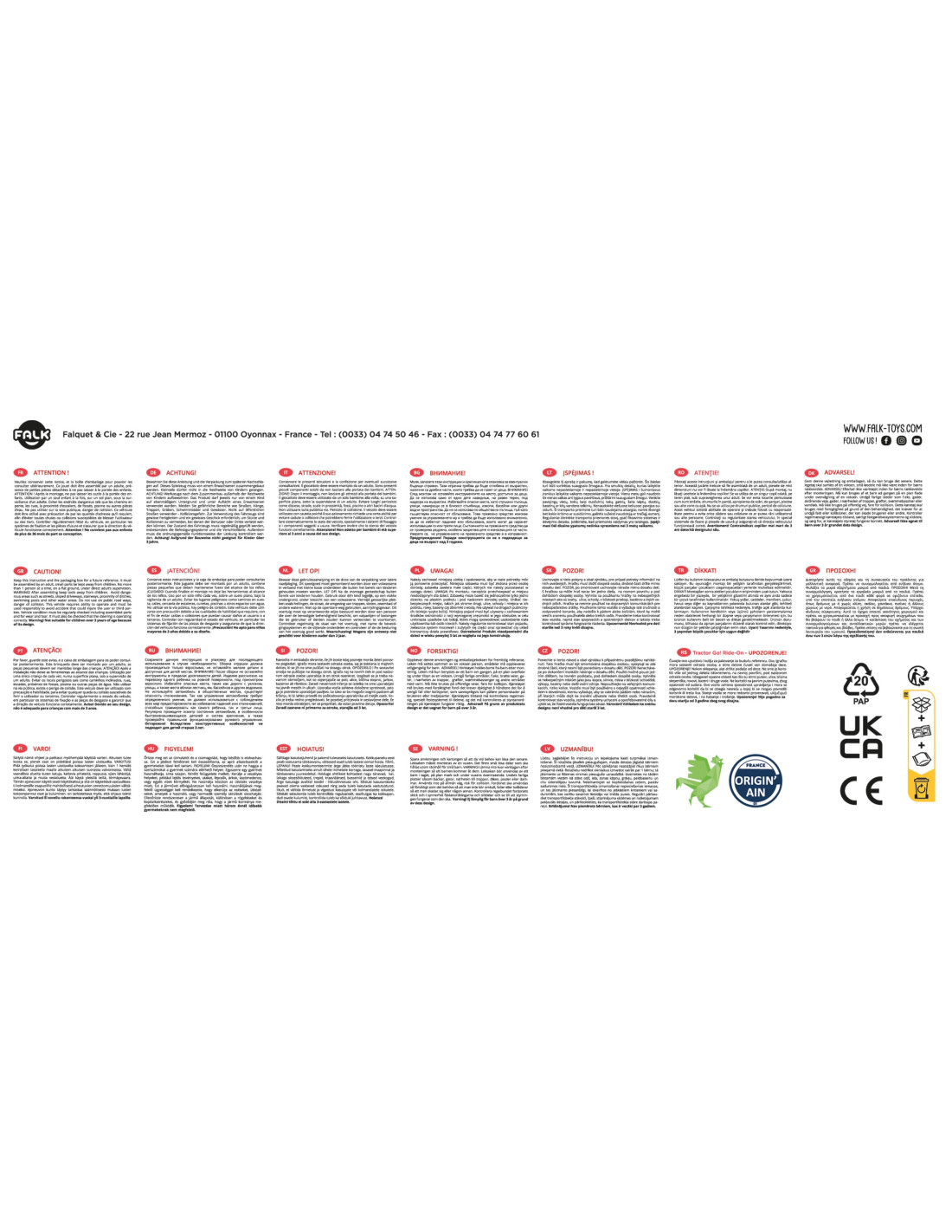 Falk is a leading European manufacturer of high-quality pedal-powered vehicles. Their product range includes tractors licensed from brands such as Claas, Renault, McCormick , Kubota, Case IH , and others. All vehicles are manufactured in France using high-quality materials.