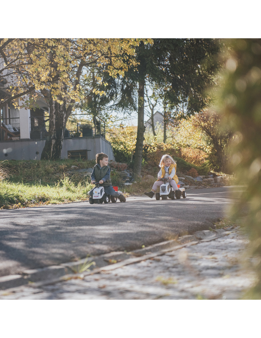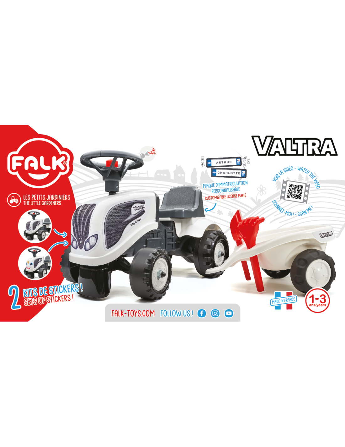 The Baby Valtra Ride-on Tractor with Trailer by Falk is a dream come true for many a little tractor driver. Meticulously crafted with attention to the smallest detail ! No true farmer would turn down such a ride-on tractor. Made of the highest quality plastic , this vehicle is suitable for children aged 12 months and up. It features a detachable trailer with panels and a steering wheel with a horn . The tractor's wheels are made of high-quality plastic . Additionally, the tractor comes with a rake and a shovel for your little one to play with. The included stickers allow your child to choose their own unique style. A smiley face or a standard sticker? Surprise everyone by applying it to the front of the vehicle.