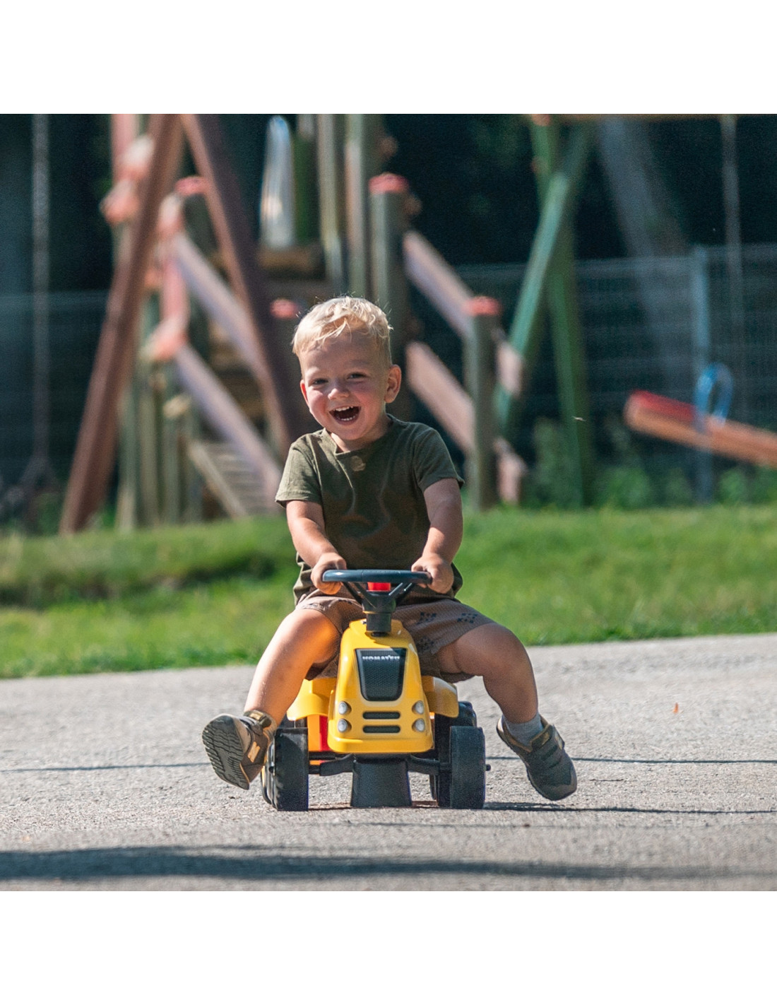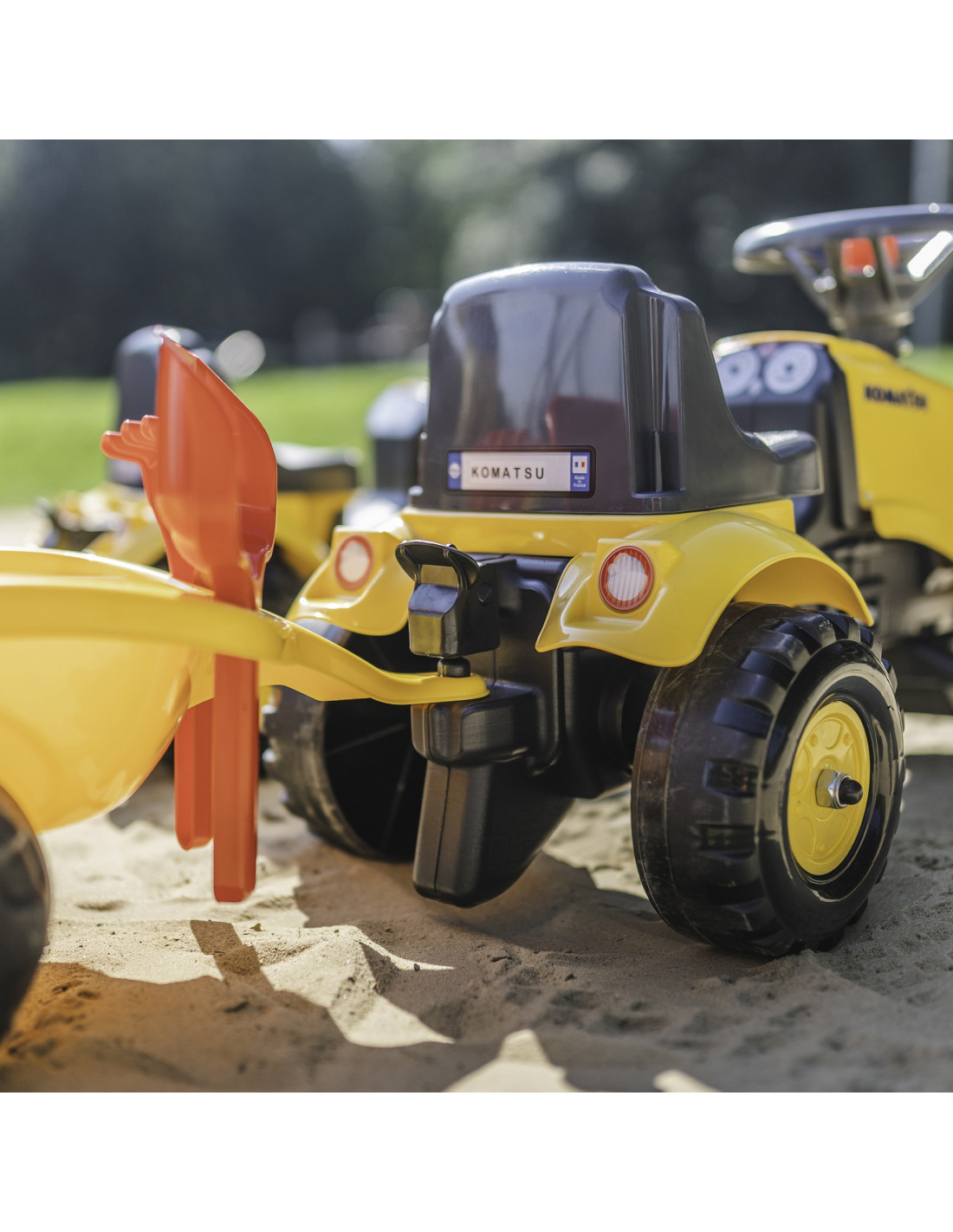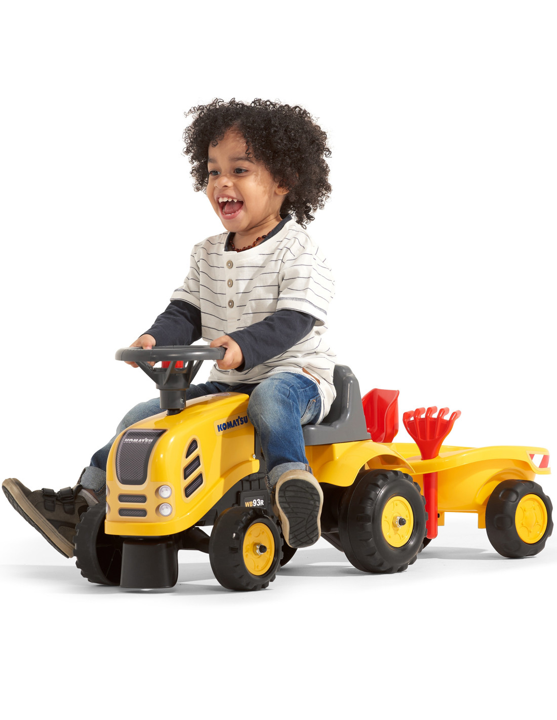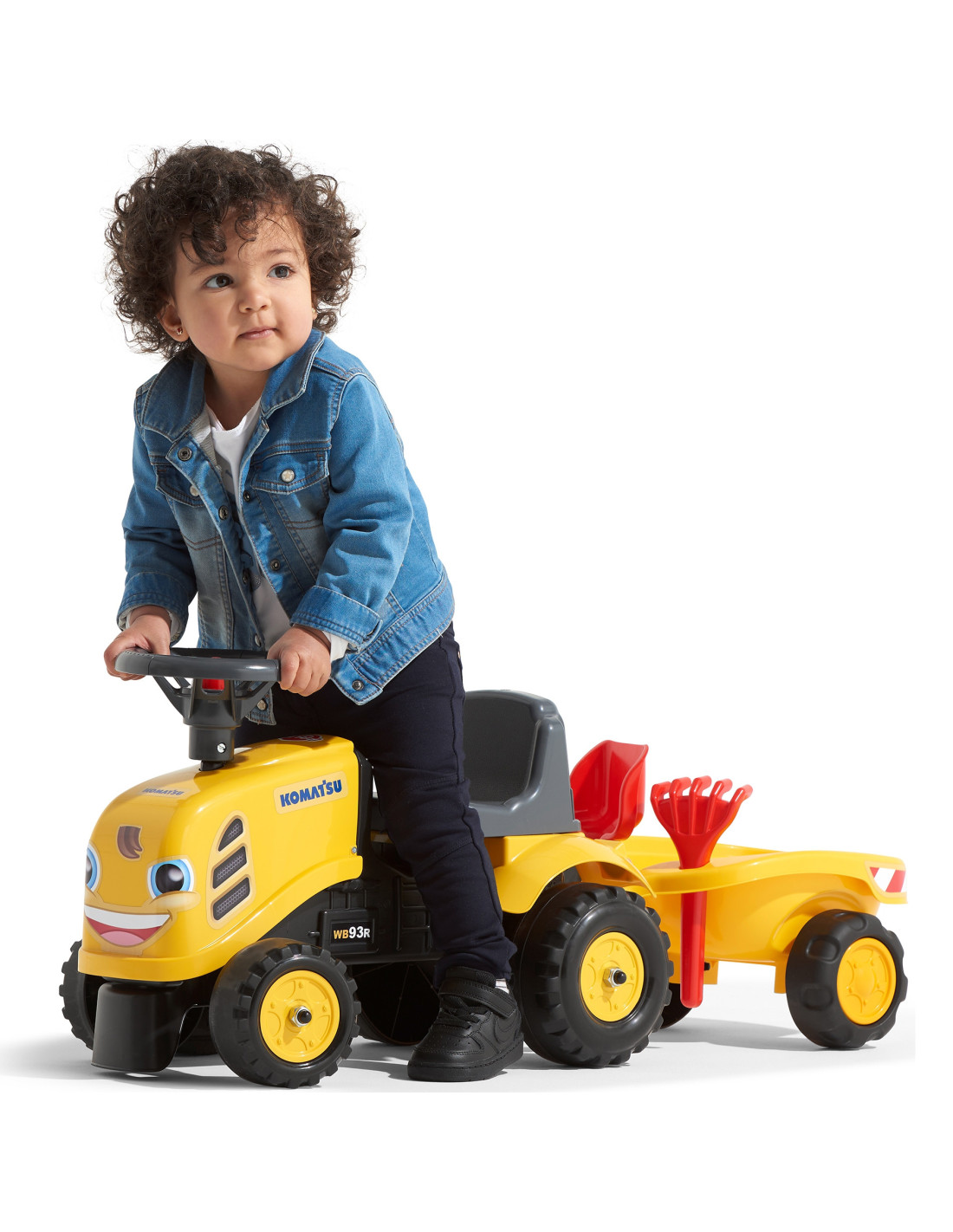 The Baby Komatsu Ride-on Tractor with Trailer by Falk is a dream come true for many a little tractor driver. Meticulously crafted with attention to the smallest detail ! No true farmer would turn down such a ride-on tractor. Made of the highest quality plastic , this vehicle is suitable for children aged 12 months and up. It features a detachable trailer with panels and a steering wheel with a horn . The tractor's wheels are made of high-quality plastic . Additionally, the tractor comes with a rake and a shovel for your little one to play with. The included stickers allow your child to choose their own unique style. A smiley face or a standard sticker? Surprise everyone by applying it to the front of the vehicle.
