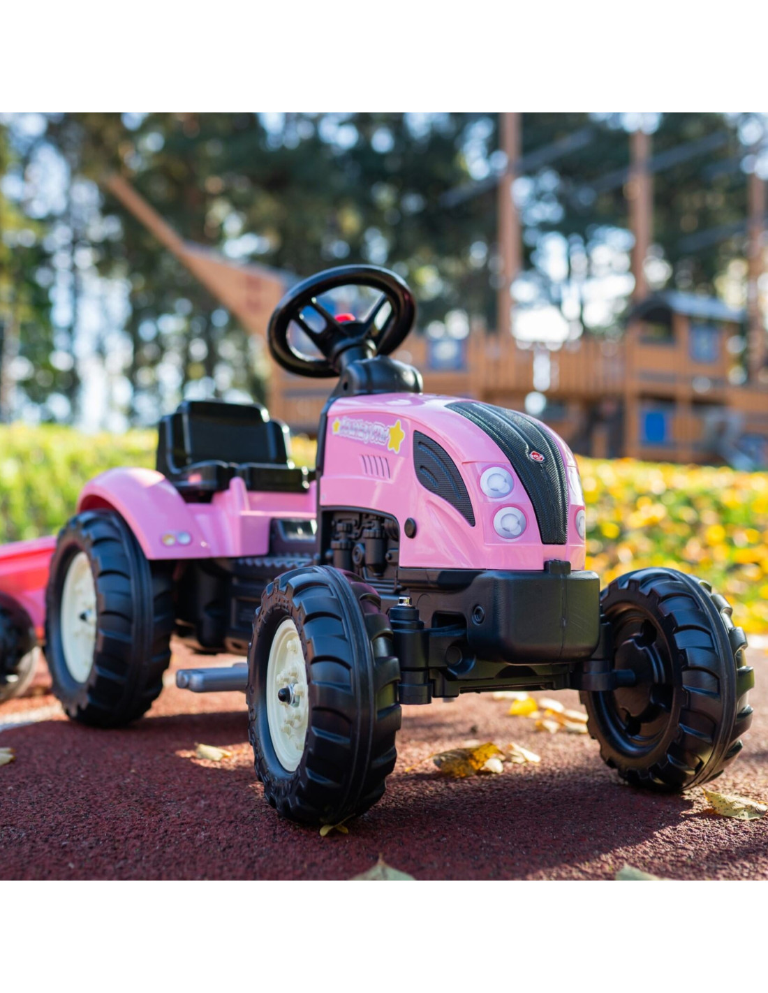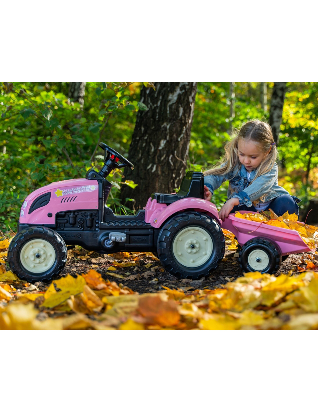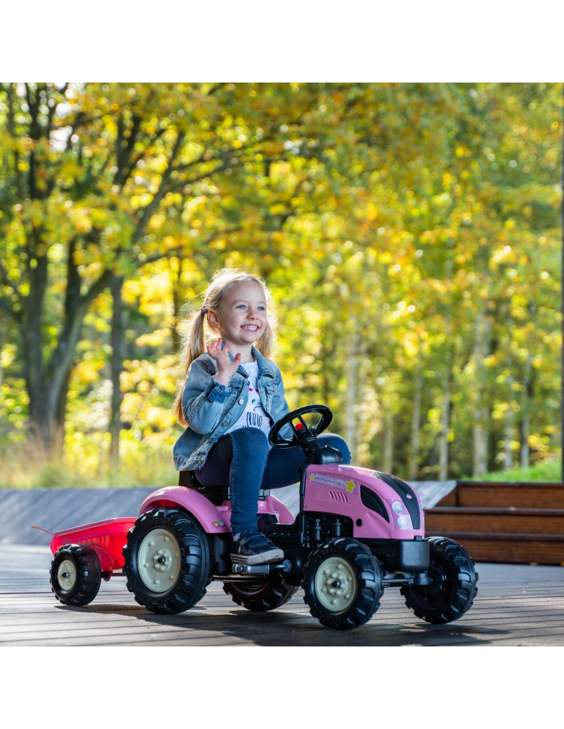 The Country Star Pedal Tractor with Trailer from FALK is a dream come true for many a young tractor driver. Meticulously crafted with attention to the smallest detail! No farmer would shy away from one. Crafted from the highest quality plastic, this vehicle is suitable for children aged 2 and up . It features a detachable trailer with panels and a steering wheel with a horn . The tractor's wheels are made of high-quality plastic.