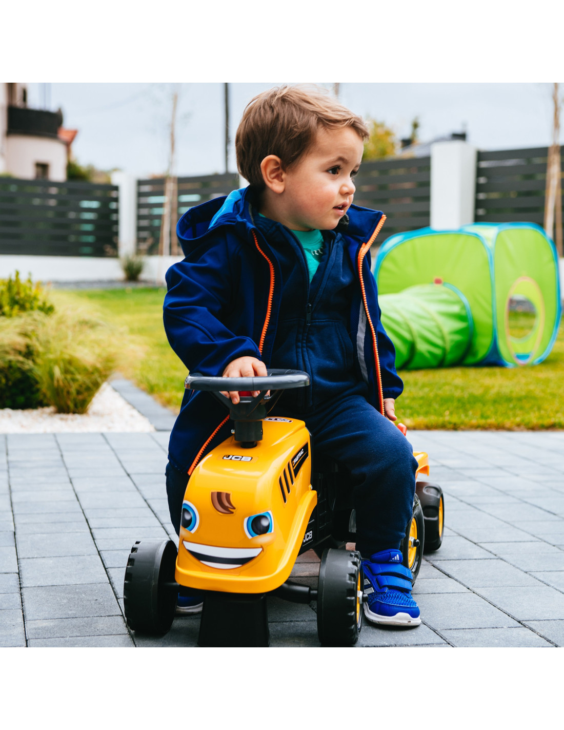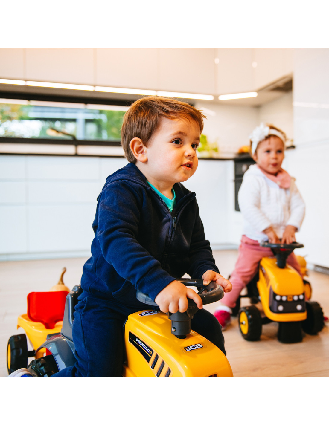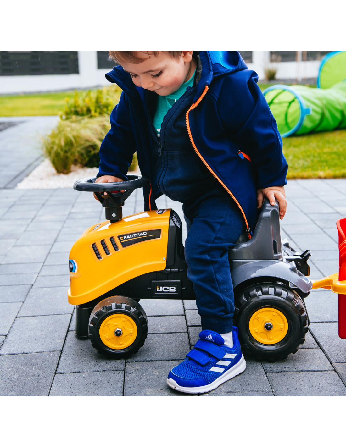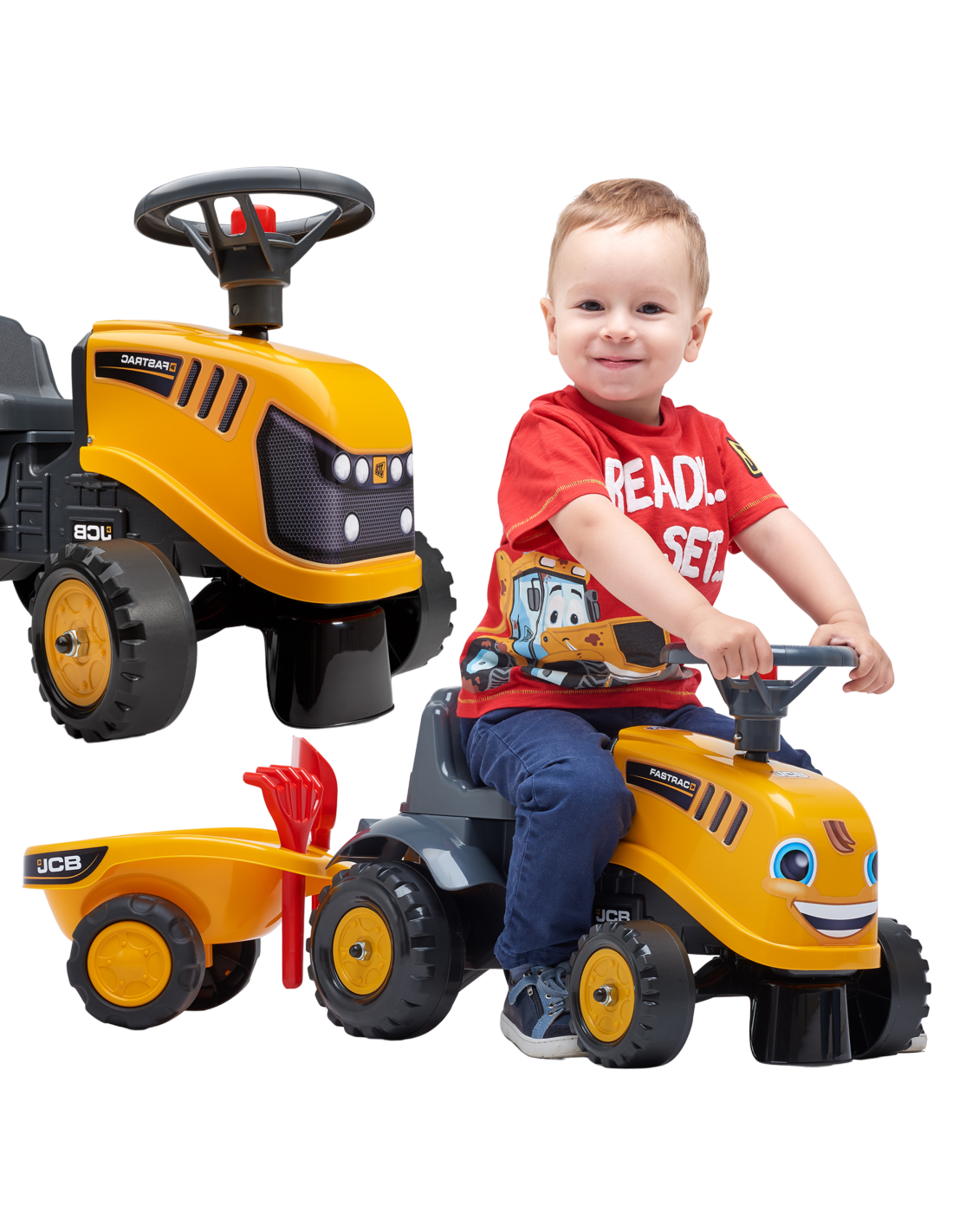 The orange JCB Ride-on Tractor with Trailer by Falk is a dream come true for many a little tractor driver. Meticulously crafted with attention to the smallest detail ! No true farmer would turn down such a ride-on tractor. Made of the highest quality plastic , this vehicle is suitable for children aged 12 months and up. It features a detachable trailer with panels and a steering wheel with a horn . The tractor's wheels are made of high-quality plastic . Additionally, the tractor comes with a rake and a shovel for your child to play with. The included stickers allow your child to choose their own unique style. A smiley face or a standard sticker? Surprise everyone by applying it to the front of the vehicle.