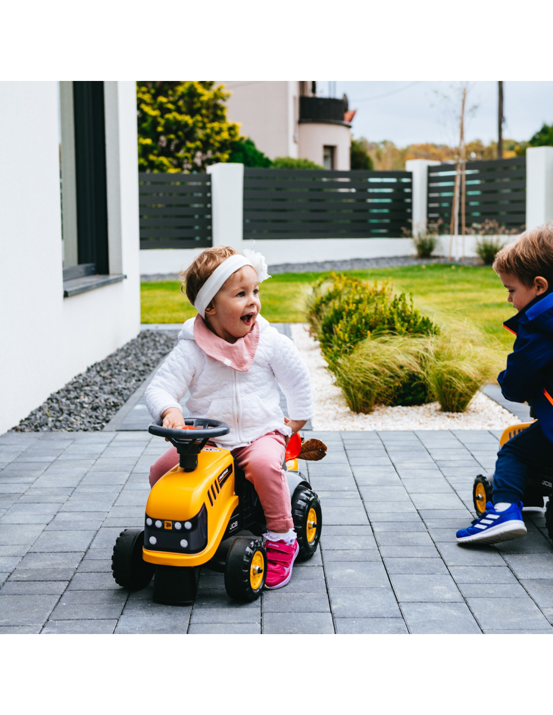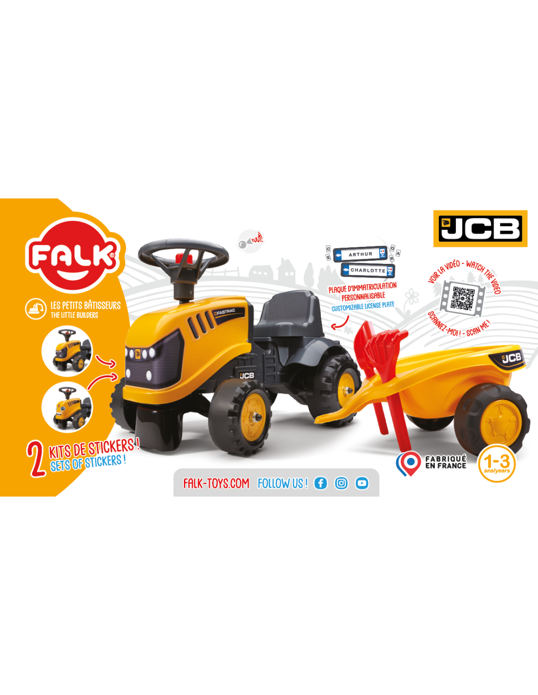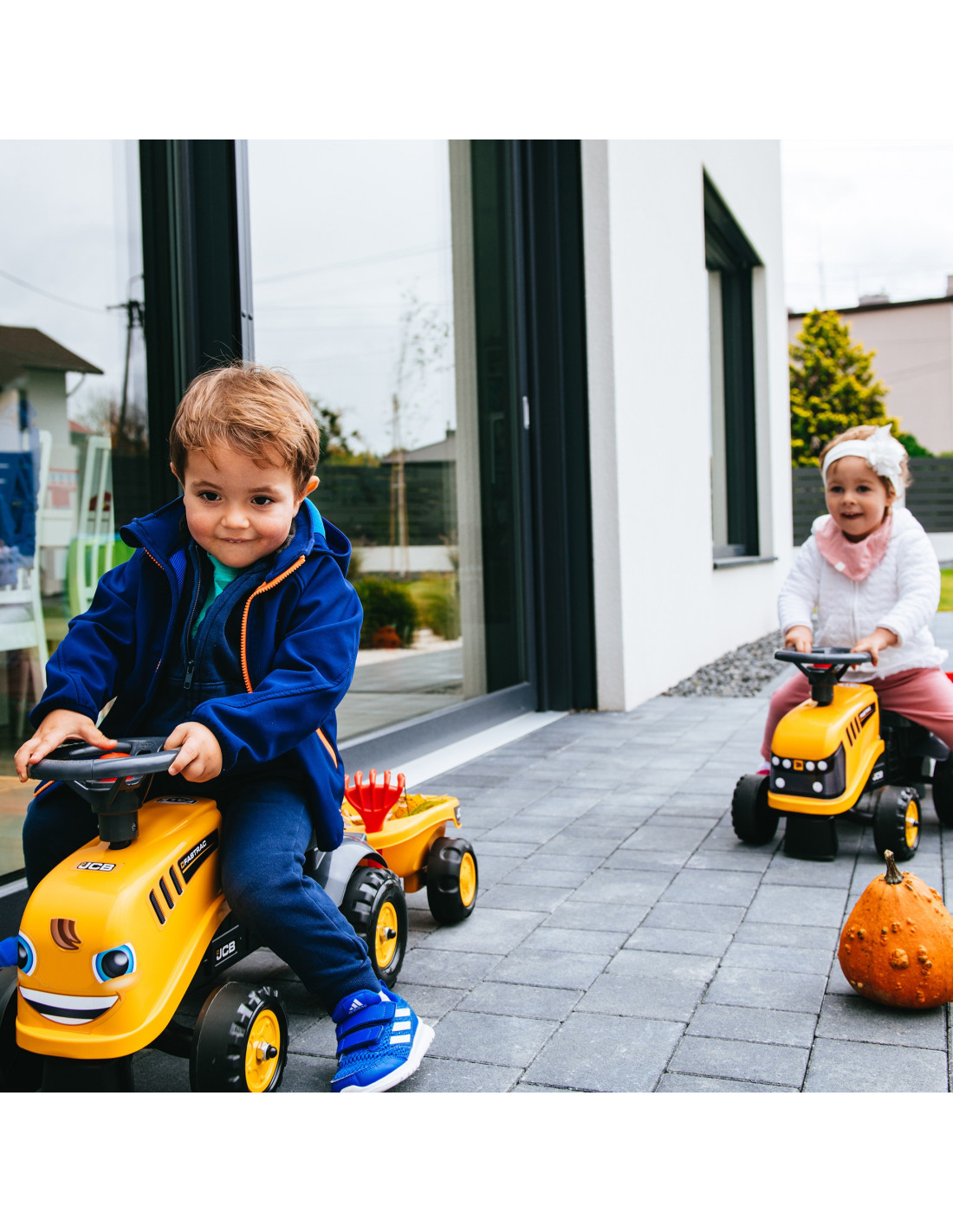 Traktorek Jeździk JCB pomarańczowy z przyczepką marki Falk to spełnienie marzeń niejednego małego traktorzysty. Starannie wykonany, z dbałością o najmniejszy szczegół! Żaden prawdziwy Farmer by takim nie pogardził. Pojazd wykonany z najwyższej jakości tworzywa przeznaczony dla dzieci od 12 miesiąca życia. Pojazd jest wyposażony odpinaną przyczepę z panelami oraz kierownicę z klaksonem. Koła traktorka zostały wykonane z wysokiej jakości plastiku. Dodatkowo do traktorka mamy do zabawy dla naszej pociechy grabki oraz łopatkę. Dołączone do traktorka naklejki pozwolą dziecku wybrać swój unikatowy styl. Uśmiechnięta buźka czy standardowa naklejka? Zaskocz wszystkich i naklej na przód pojazdu.
