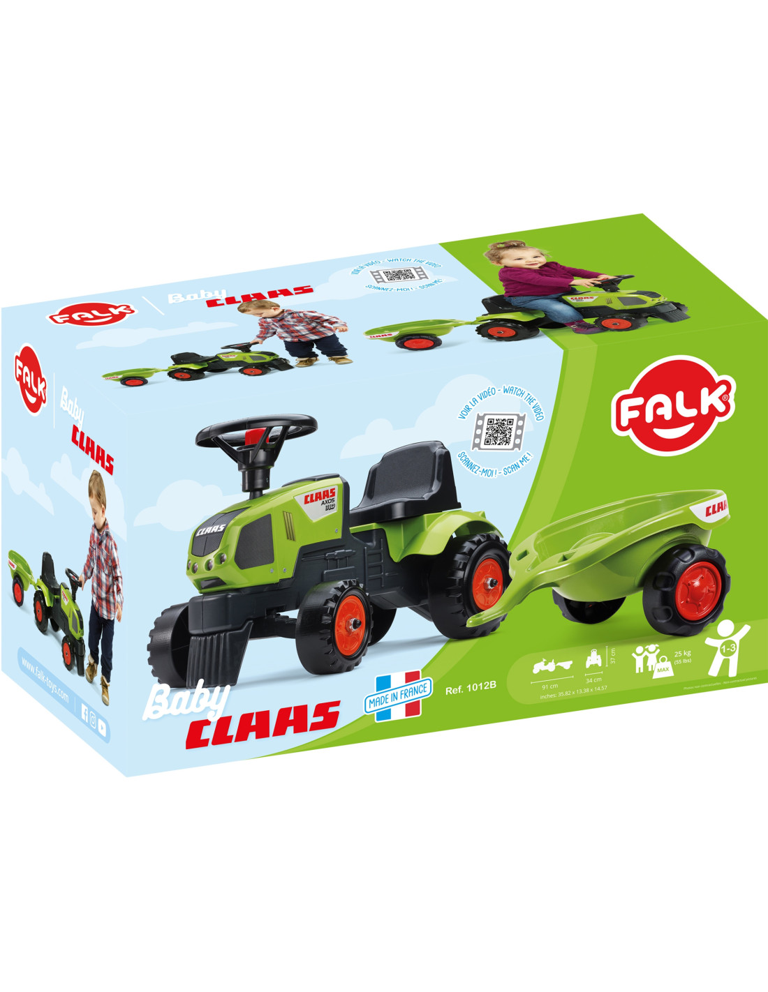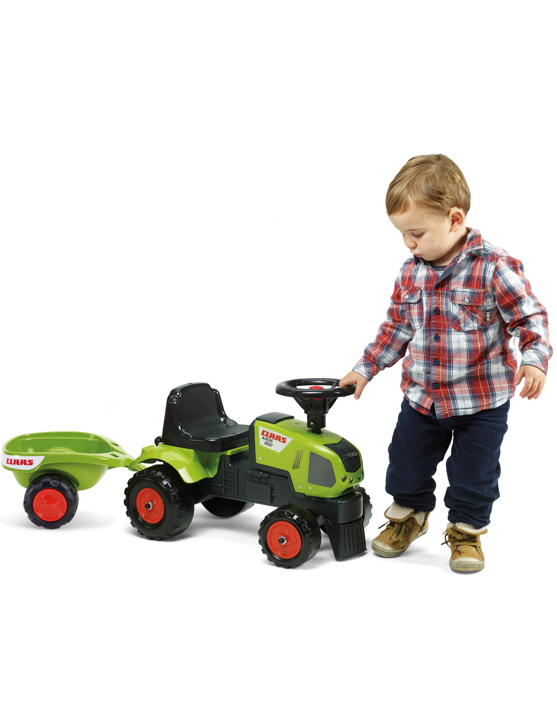 The Baby Claas Axos 310 Ride-on Tractor with Trailer by Falk is a dream come true for many a little tractor driver. Meticulously crafted with attention to the smallest detail ! No true farmer would shy away from one. Crafted from the highest quality plastic, this ride-on tractor is suitable for children aged 12 months and up. It features a detachable trailer with panels and a steering wheel with a horn . The tractor's wheels are made of high-quality plastic .