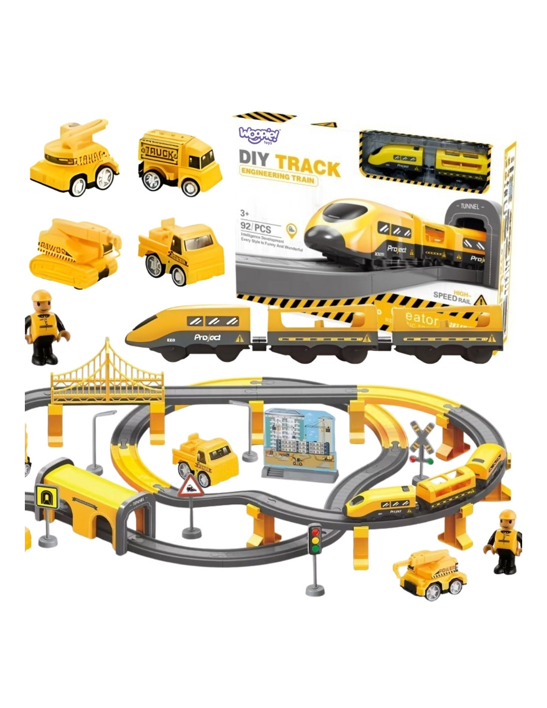 This fascinating electric train set from Woopie is a true command center for little builders! The yellow express train with real-world rail sounds introduces children to the world of construction, route planning, and creating their own play scenarios. Featuring a wide range of bridges, tunnels, traffic lights, and construction vehicles, toddlers can create an endless number of track layouts and then watch the train race through their own unique city. This toy combines the excitement of real railways with the creativity of a child's world.