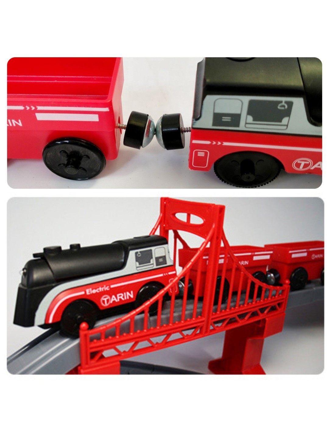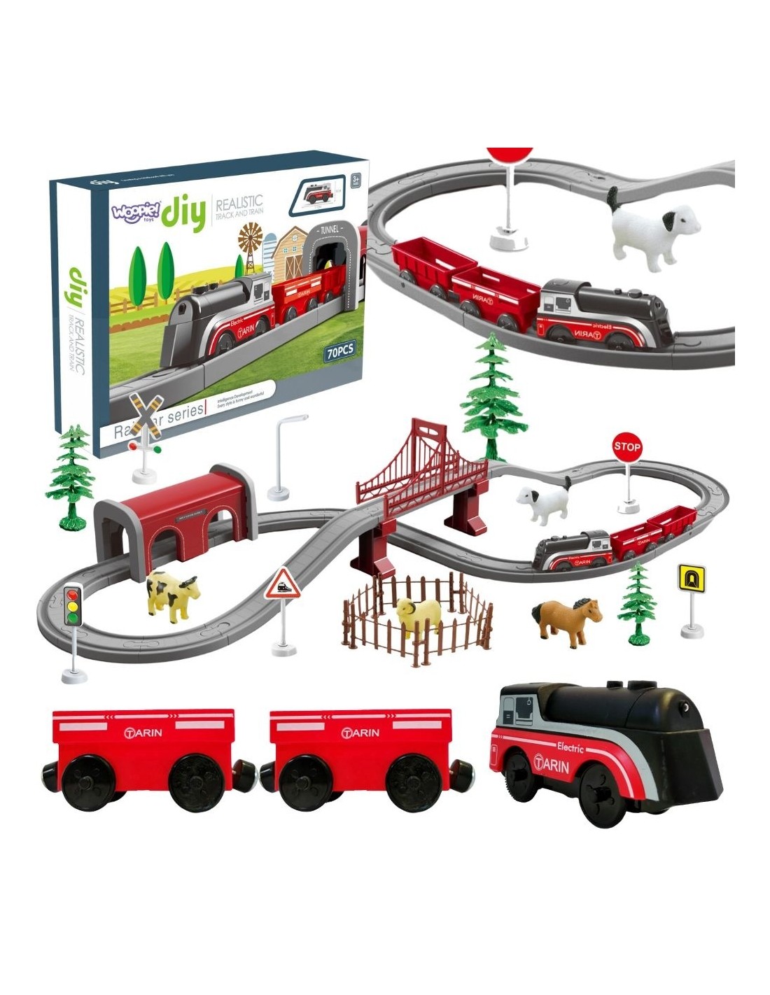A picturesque journey through the farm aboard the WOOPIE electric train is an adventure that will captivate every child! This extensive 70-piece set is a true Eldorado for little train enthusiasts – with tracks forming an exciting route full of tunnels, bridges, and surprises. Magnetic carriages connect with a satisfying click, and the electric locomotive makes play even more realistic and exciting. As the train passes under the red tunnel and over the bridge, passing grazing animals, children discover a world full of possibilities for creating their own stories.