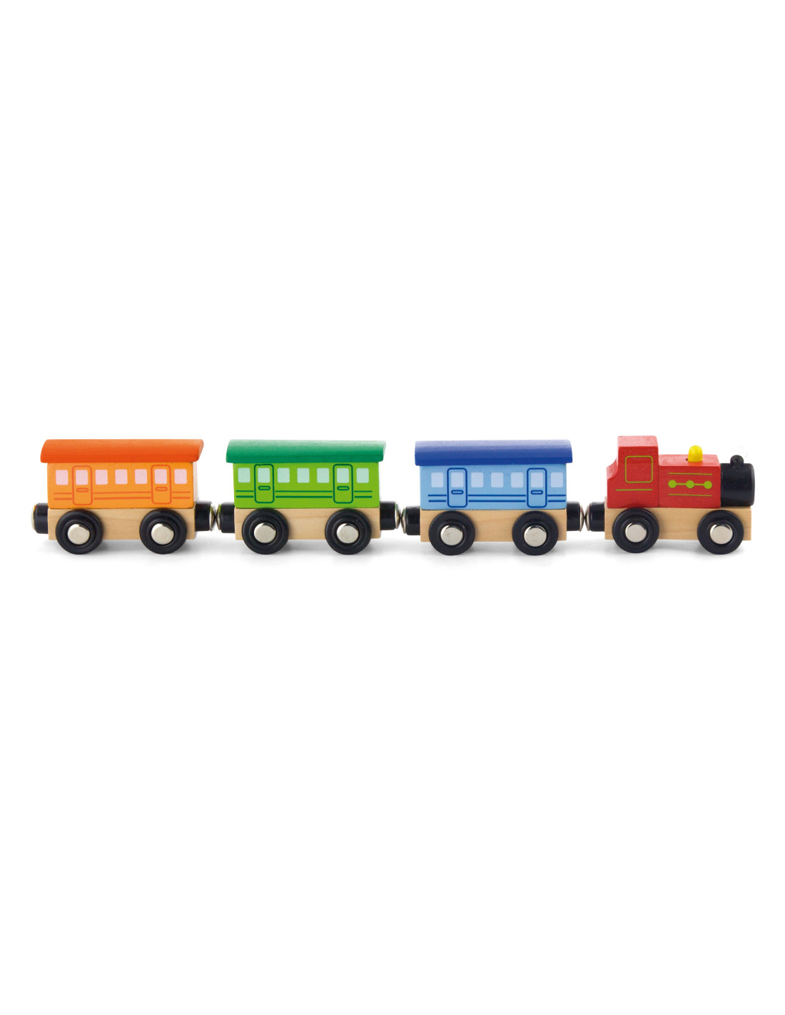 This set from Viga consists of four pieces connected by magnets to form a train. It can be used as a standalone toy or as a complement to a train, other sets, or building blocks.